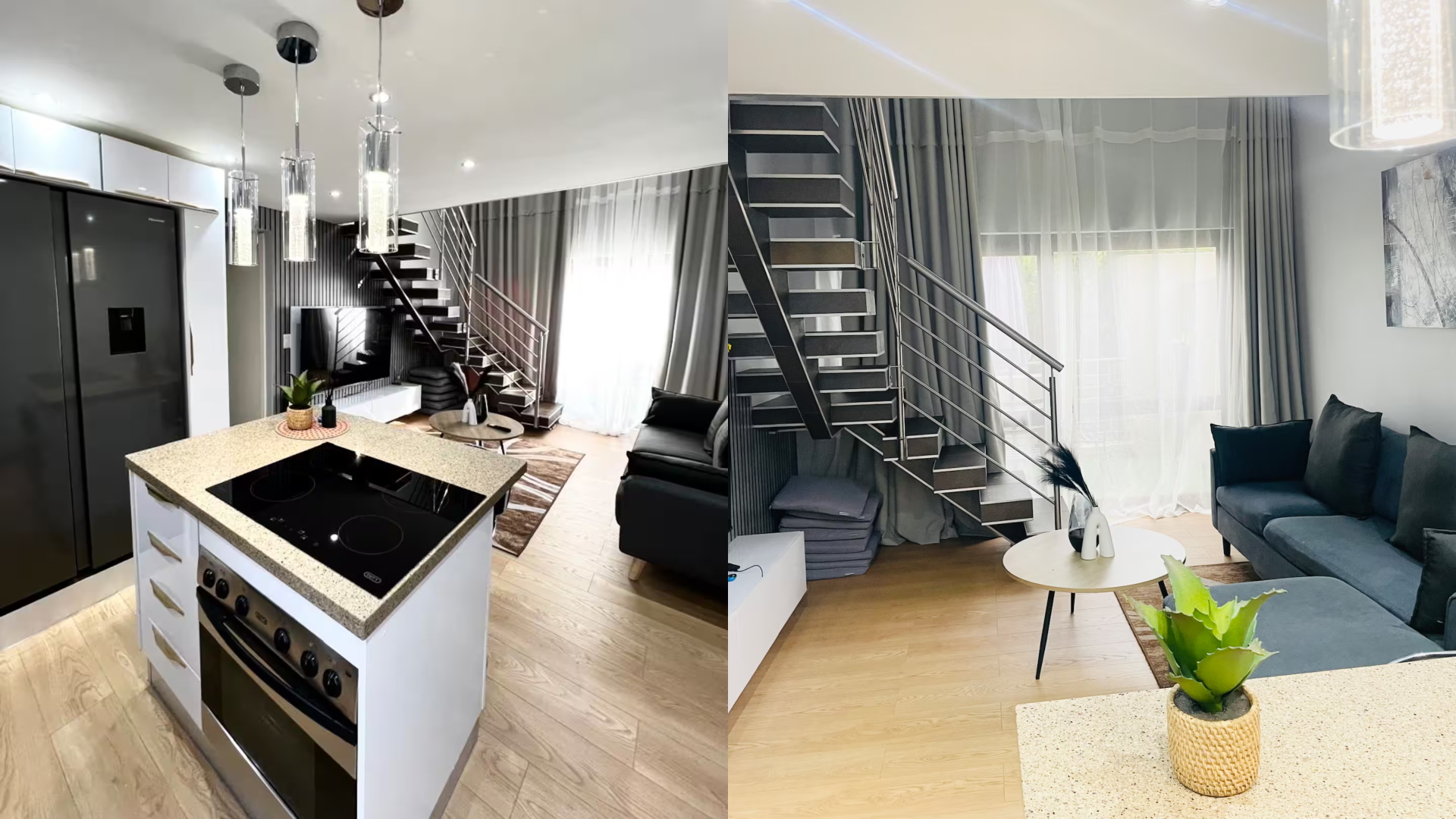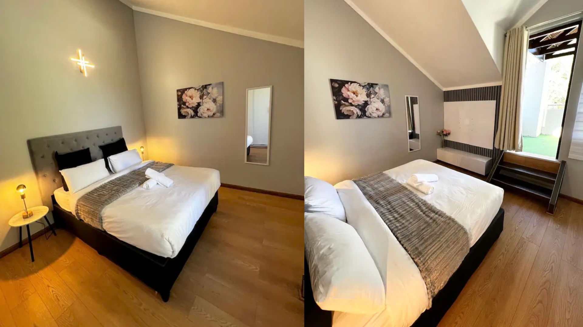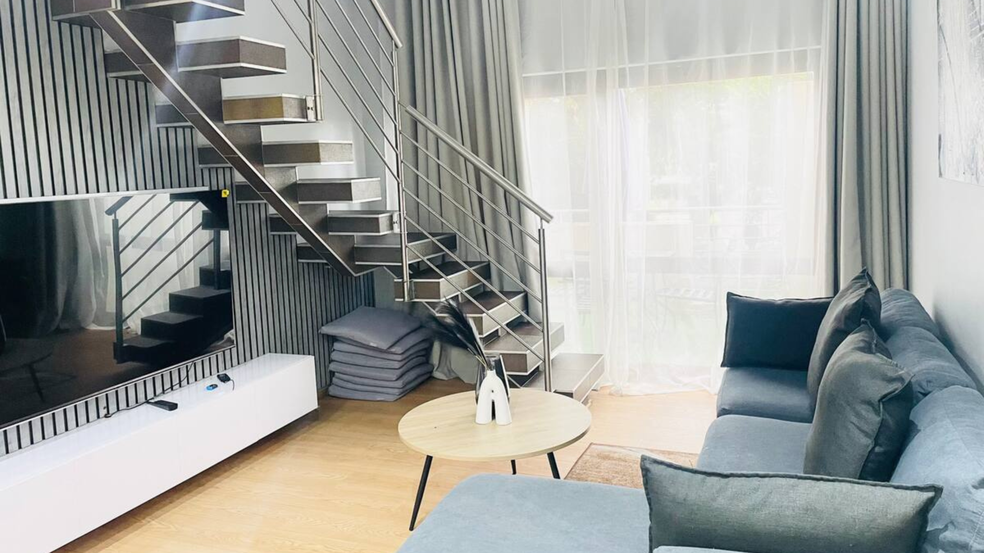 A striking floating staircase, a true architectural statement, leads gracefully to the private quarters above, enhancing the apartment’s sense of space and modern artistry. Upstairs, you’ll find two elegantly appointed bedrooms, each designed as a serene sanctuary. The master suite opens onto a private balcony, where you can unwind on a pool chair and watch the sunset over the estate — the perfect end to a busy day in the city. The second bedroom, with its unique sloped ceiling, enjoys direct stepped access to an outdoor patio, blurring the lines between indoor comfort and outdoor tranquillity.