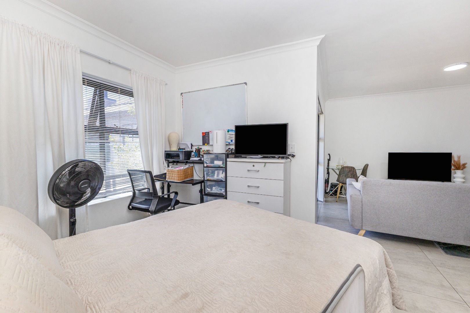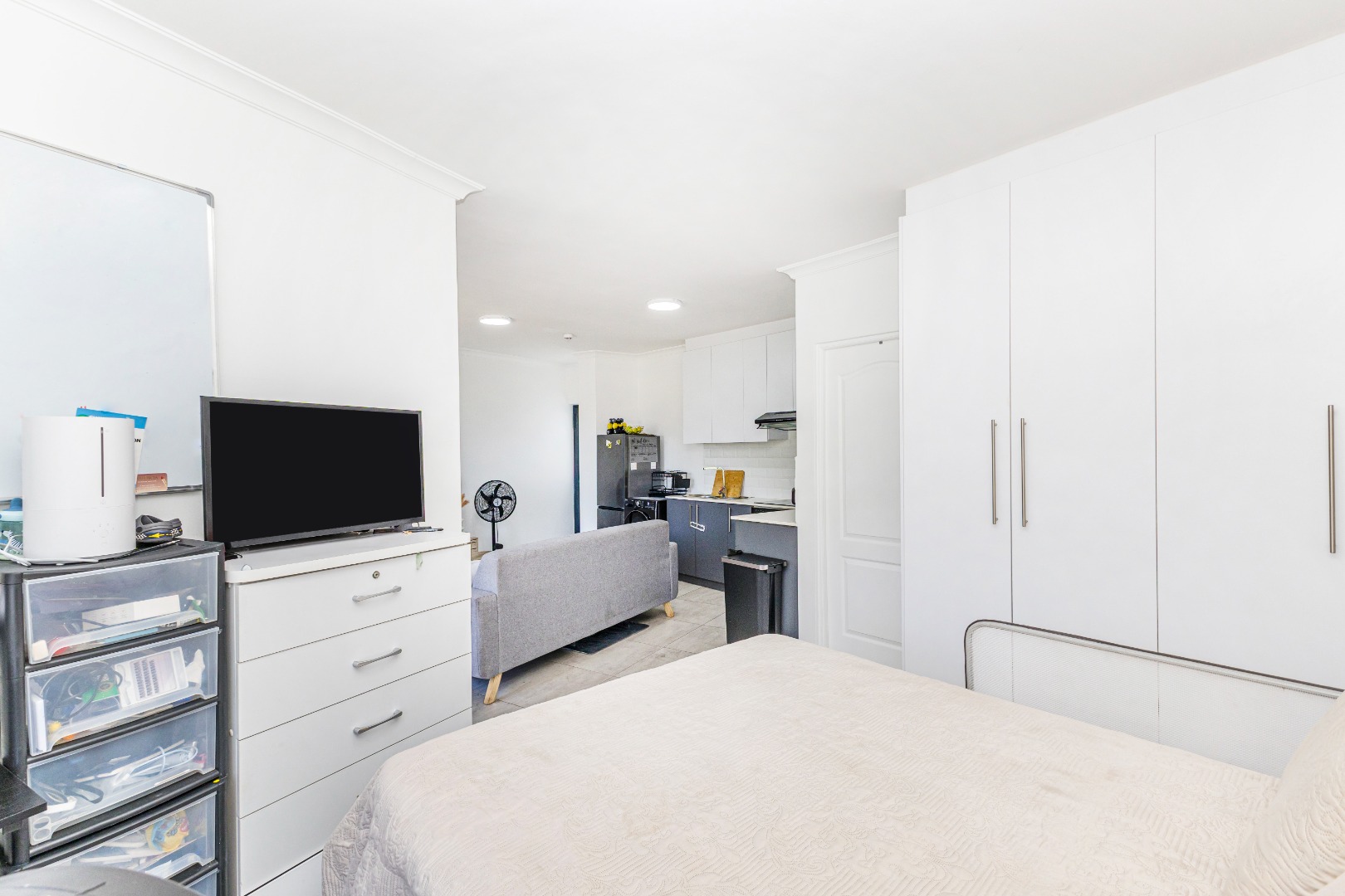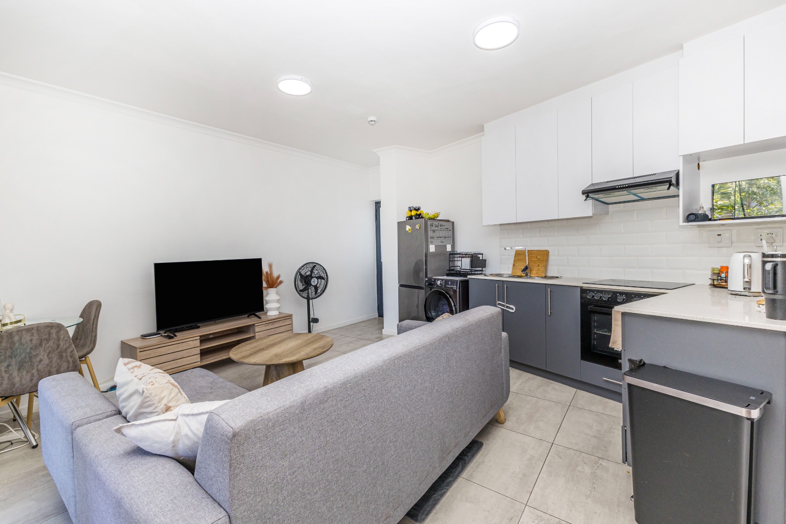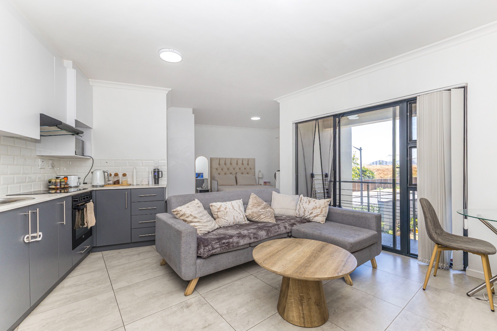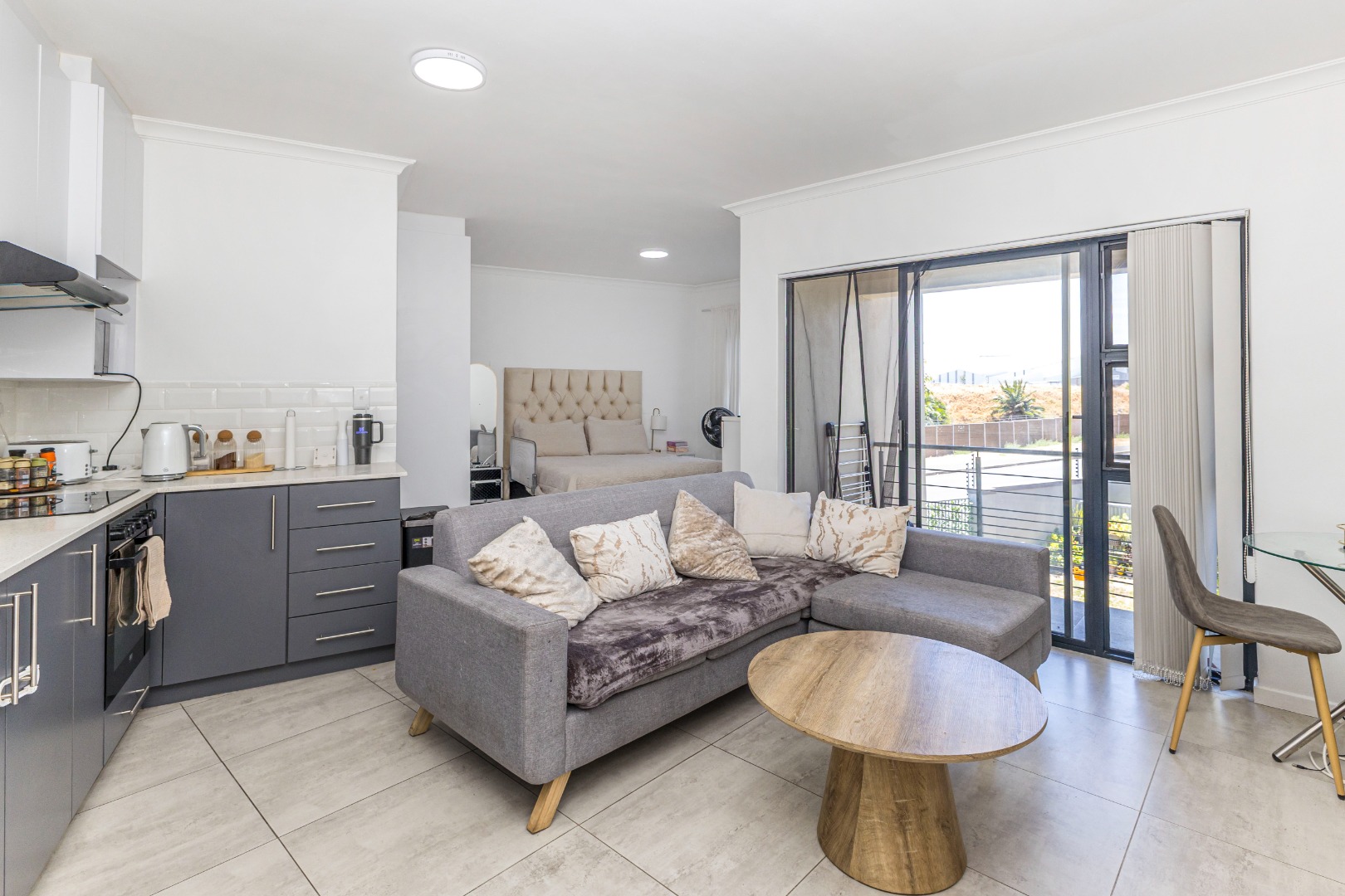 Step inside and discover a thoughtfully designed open-plan living space. The modern kitchen is a real highlight, featuring sleek dark grey cabinets, crisp white countertops, and a touch of personality with vibrant red accent appliances. Enough space for a washing machine, cooktop, and microwave, making daily chores a breeze. The living area flows seamlessly from the kitchen, offering a comfy spot to relax, bathed in natural light from the large window. The bedroom nook, though open-plan, feels cozy and inviting, ready for you to make it your own.