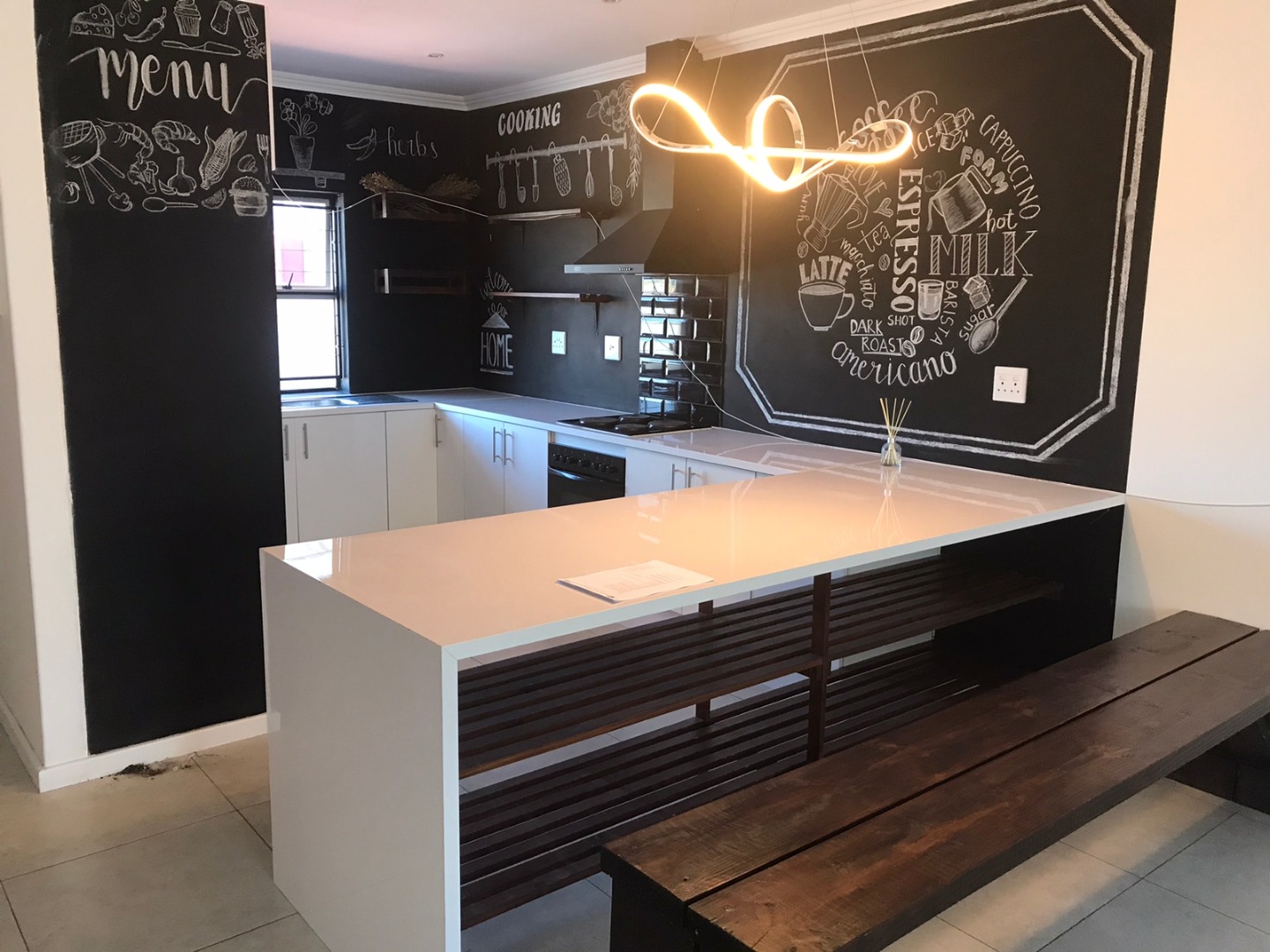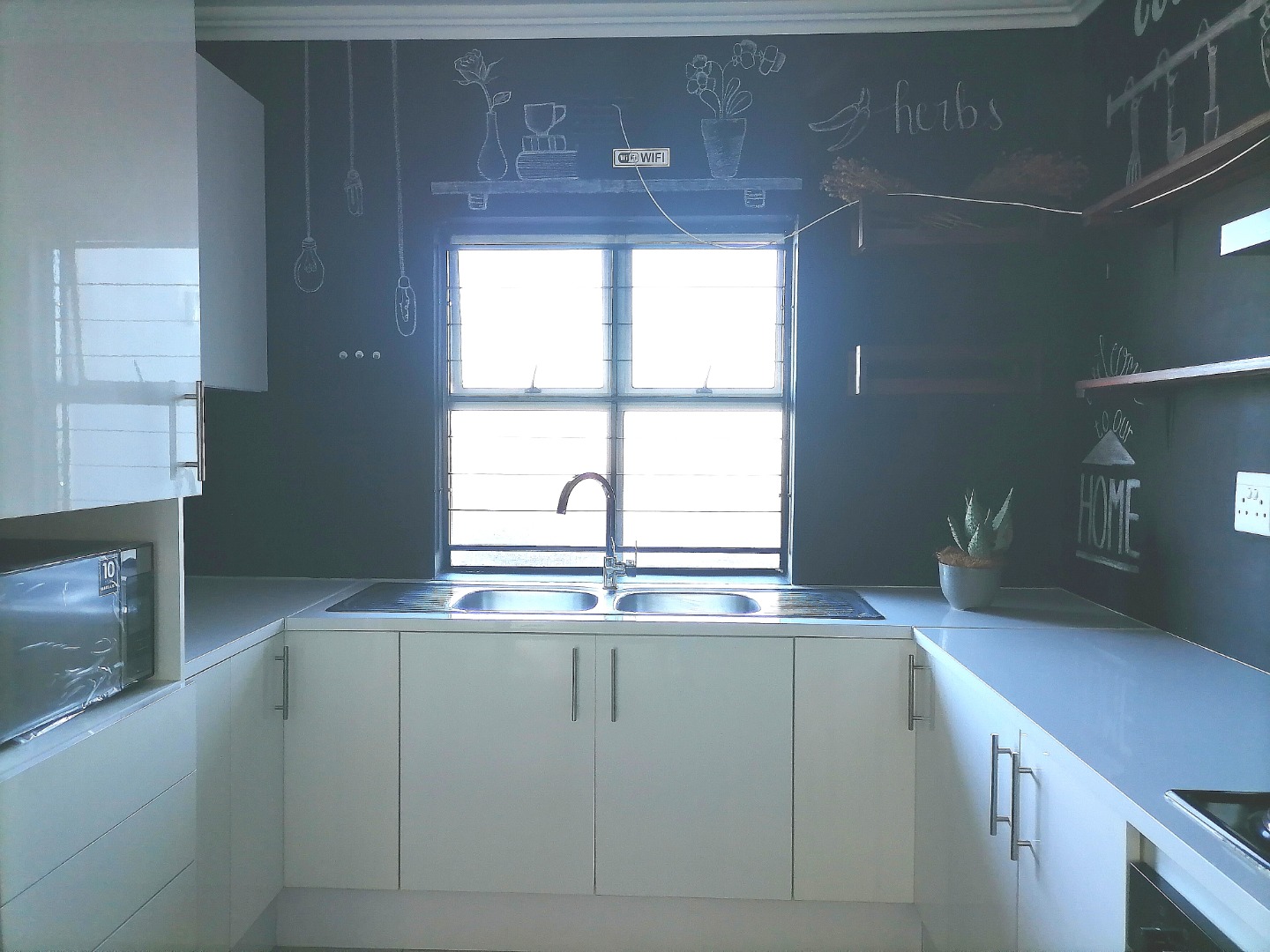The interior boasts an open-plan design, seamlessly connecting the living and kitchen areas. The contemporary kitchen is appointed with sleek white cabinetry, pristine white countertops, a double sink, and an integrated microwave space. A prominent white kitchen island, featuring integrated seating, serves as a focal point, complemented by a distinctive chalkboard accent wall. The spacious lounge area benefits from abundant natural light, enhanced by large windows and recessed lighting, and includes extensive built-in shelving for display and storage, alongside practical tiled flooring throughout.