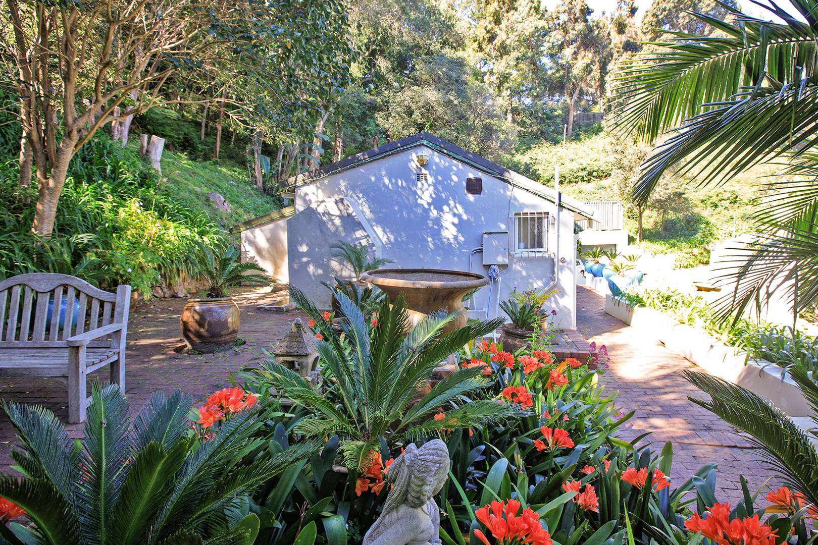 Outdoor living is a highlight, with the property boasting extensive natural landscaping. The dense foliage ensures a high degree of privacy. The terraced outdoor spaces provide charming spots for relaxation amidst the natural beauty. Security bars on windows offer an added layer of peace of mind.