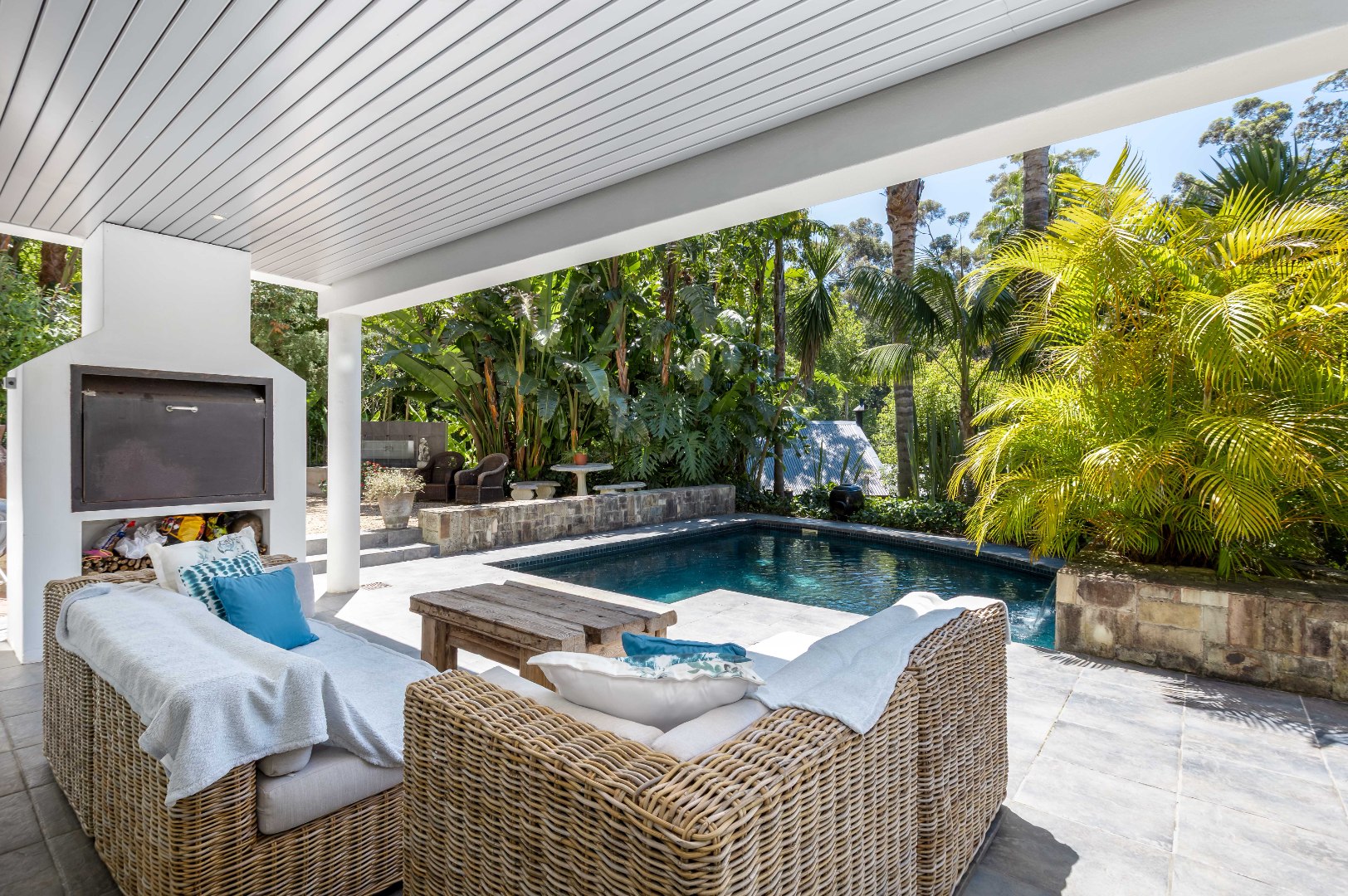 Outdoor living is a highlight, with an expansive covered patio providing an ideal setting for al fresco dining and relaxation. The large, inviting swimming pool, complete with a charming water feature, is set amidst lush, private natural surroundings, creating a resort-like ambiance. A balcony offers additional outdoor space to enjoy the scenic views. The property also benefits from a beautiful garden, two garages, and four additional parking spaces, catering to all vehicular needs making this an ideal family home.