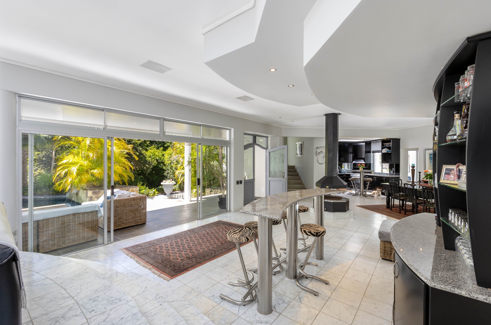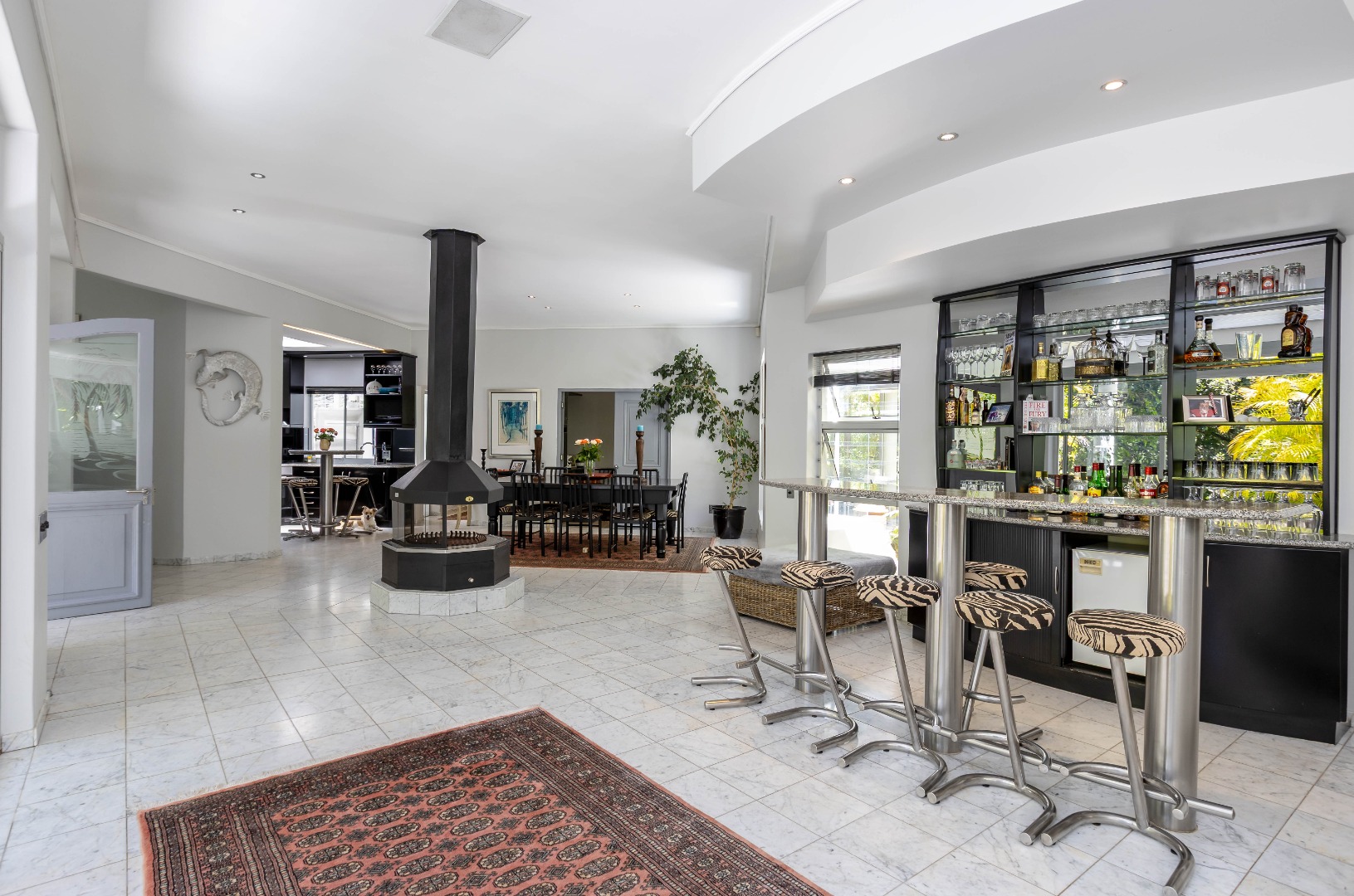 The interior boasts a spacious, open-plan layout designed for both comfortable family living and easy entertaining. Featuring two generous lounges, a dedicated dining room, and a well-appointed kitchen, the home provides ample space for every occasion. A standout feature is the built-in bar and a striking central fireplace, creating inviting focal points. Expansive windows and glass doors ensure abundant natural light throughout, enhancing the sense of openness and offering picturesque views of the surrounding greenery. Practical elements include a dedicated storage area and a versatile flatlet, adding to the property's functionality.