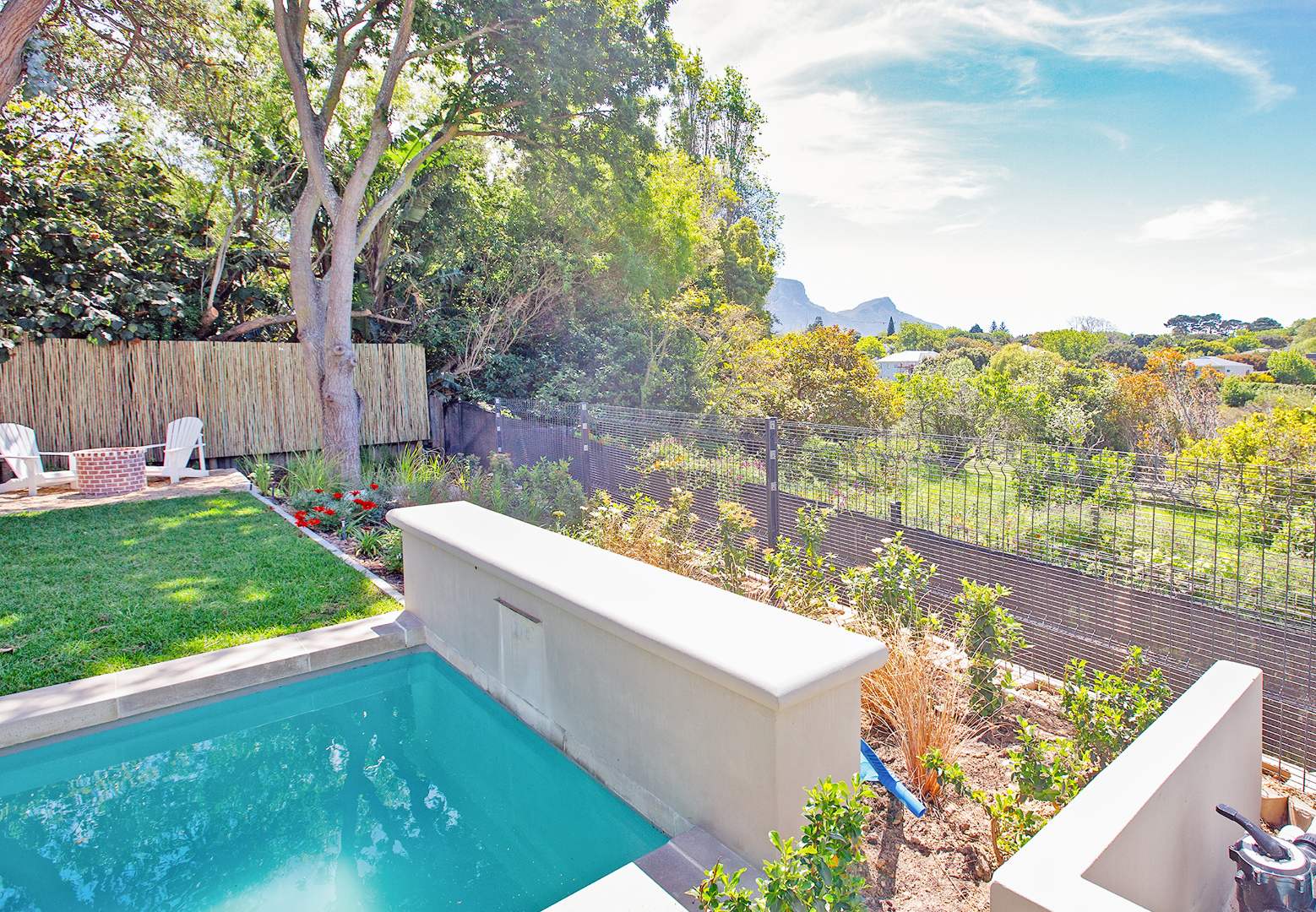 Outdoor living is a highlight, featuring a covered patio equipped with a built-in braai, perfect for al fresco dining. A private plunge pool offers a refreshing escape, while the cozy fire pit area provides an ideal spot for evening relaxation. The lush garden, enhanced by scenic views, creates a private oasis. With a double garage and four additional parking spaces, convenience is assured, and pets are welcome.