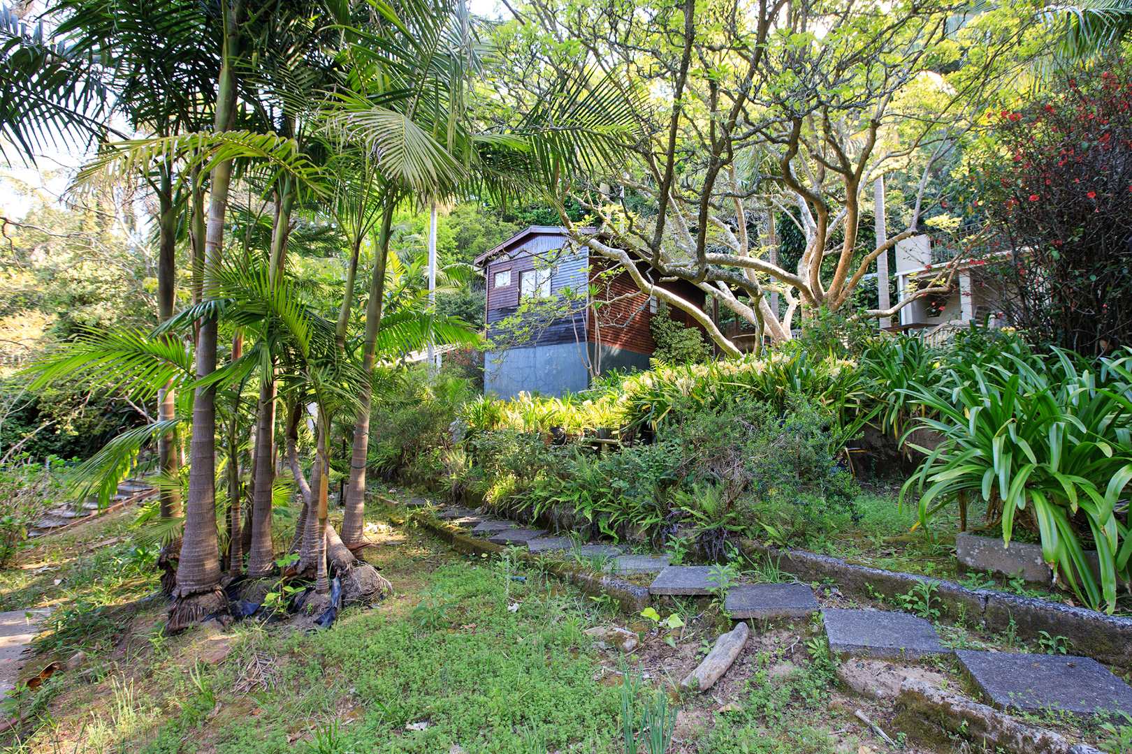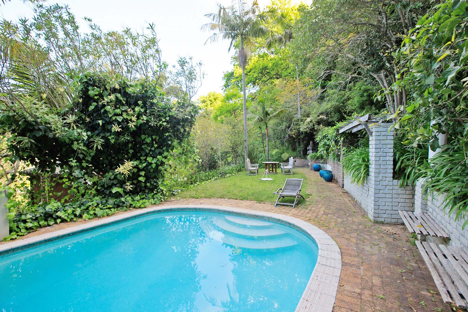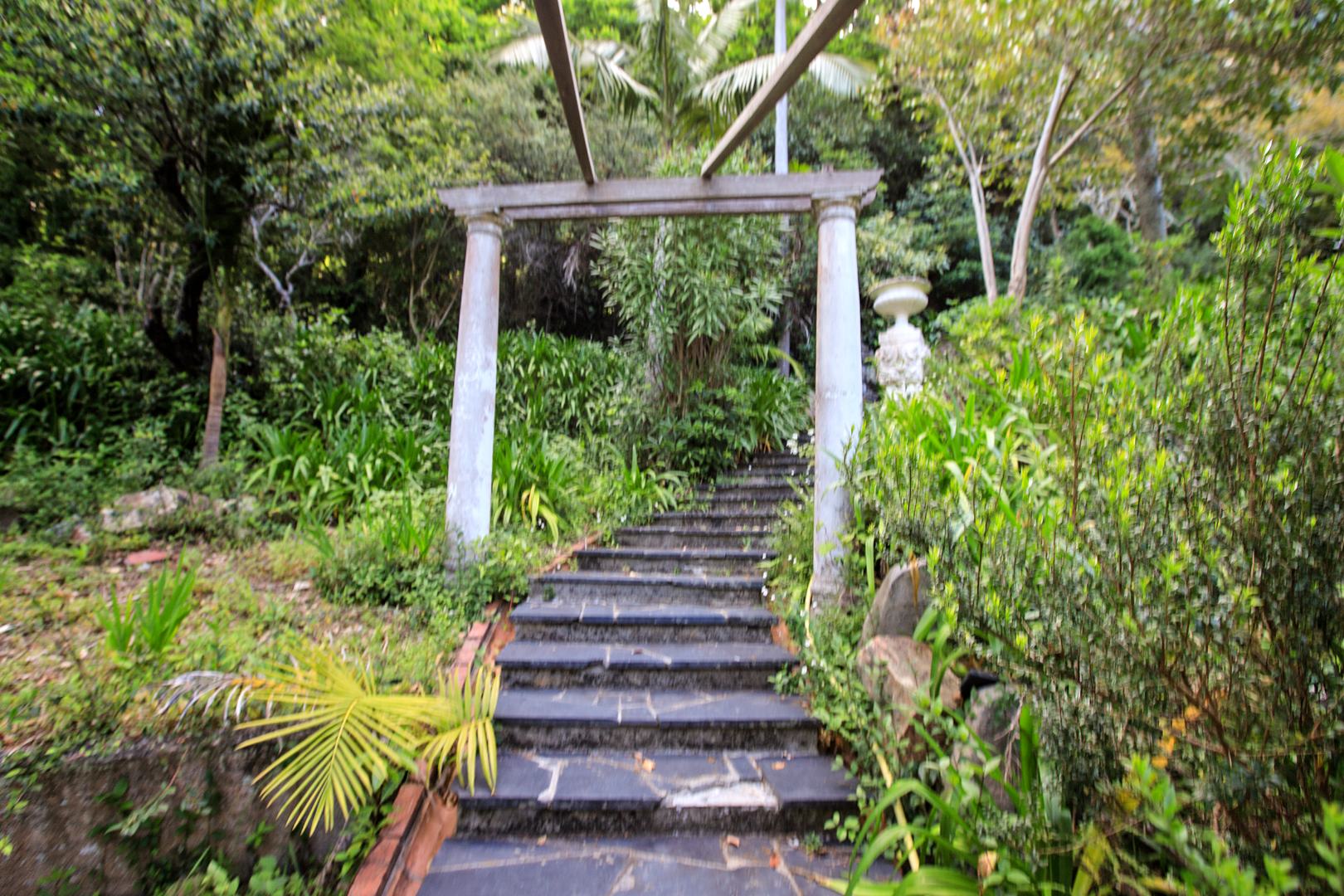 Embrace outdoor living with a visible blue swimming pool, perfectly situated within the dense greenery for ultimate privacy. A picturesque entrance features a weathered stone staircase ascending through the verdant setting, leading to the heart of this natural haven. The established gardens, complete with diverse foliage and flowering plants, provide a serene backdrop, while paved pathways offer inviting access through the grounds.