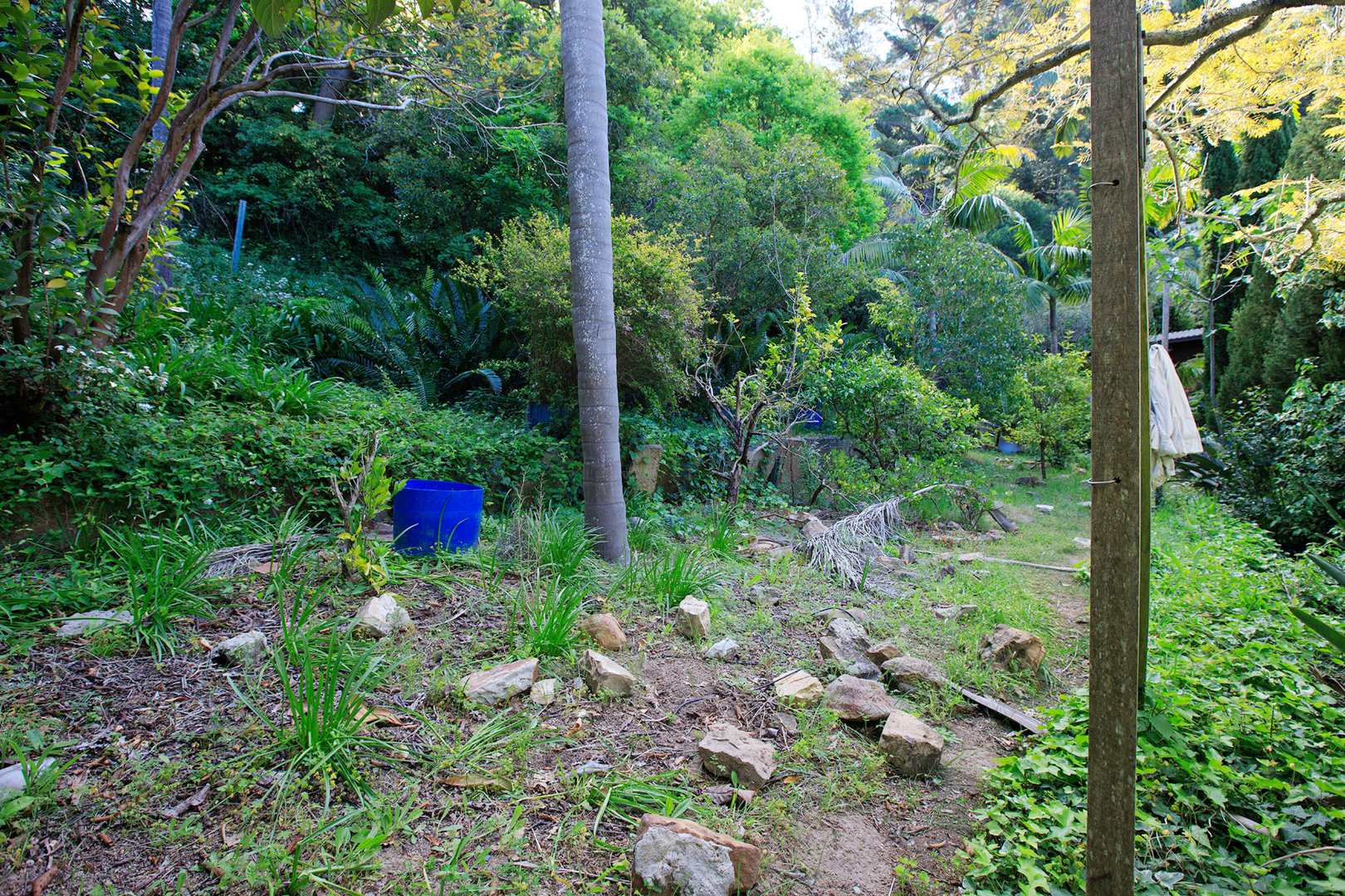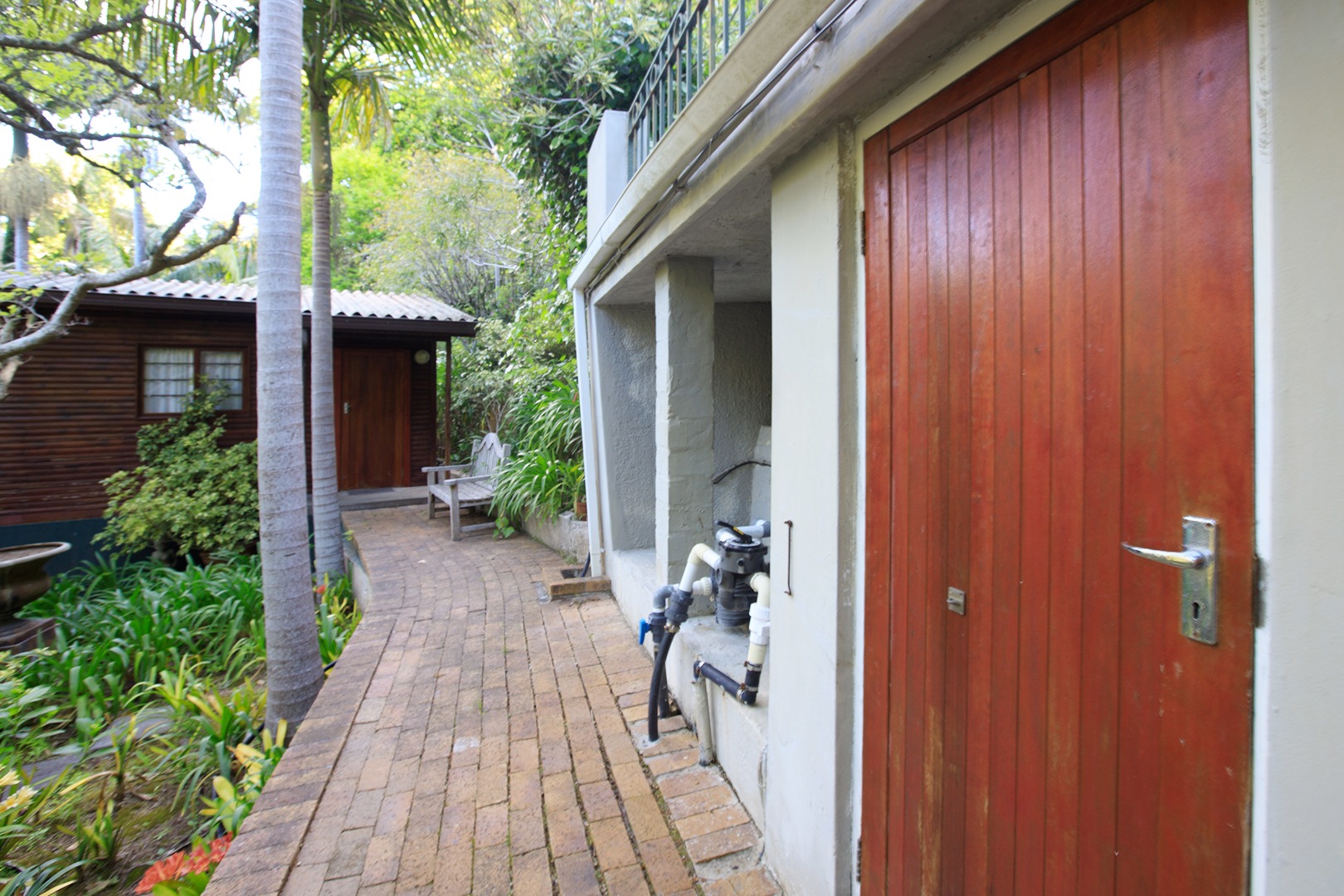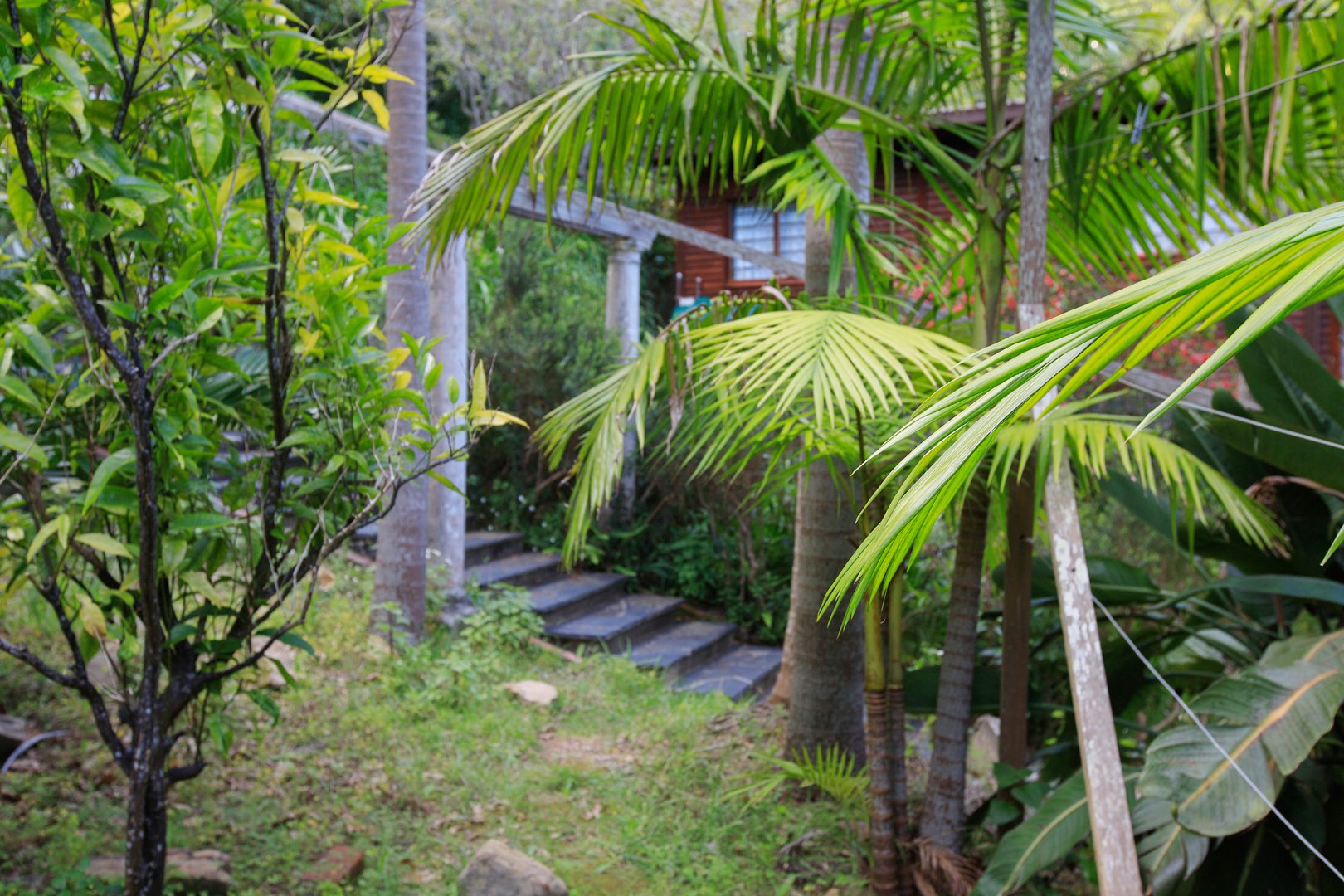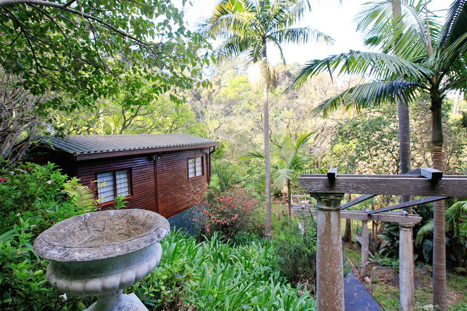 Embrace outdoor living with a visible blue swimming pool, perfectly situated within the dense greenery for ultimate privacy. A picturesque entrance features a weathered stone staircase ascending through the verdant setting, leading to the heart of this natural haven. The established gardens, complete with diverse foliage and flowering plants, provide a serene backdrop, while paved pathways offer inviting access through the grounds.