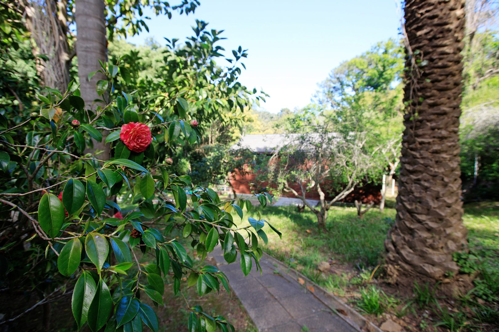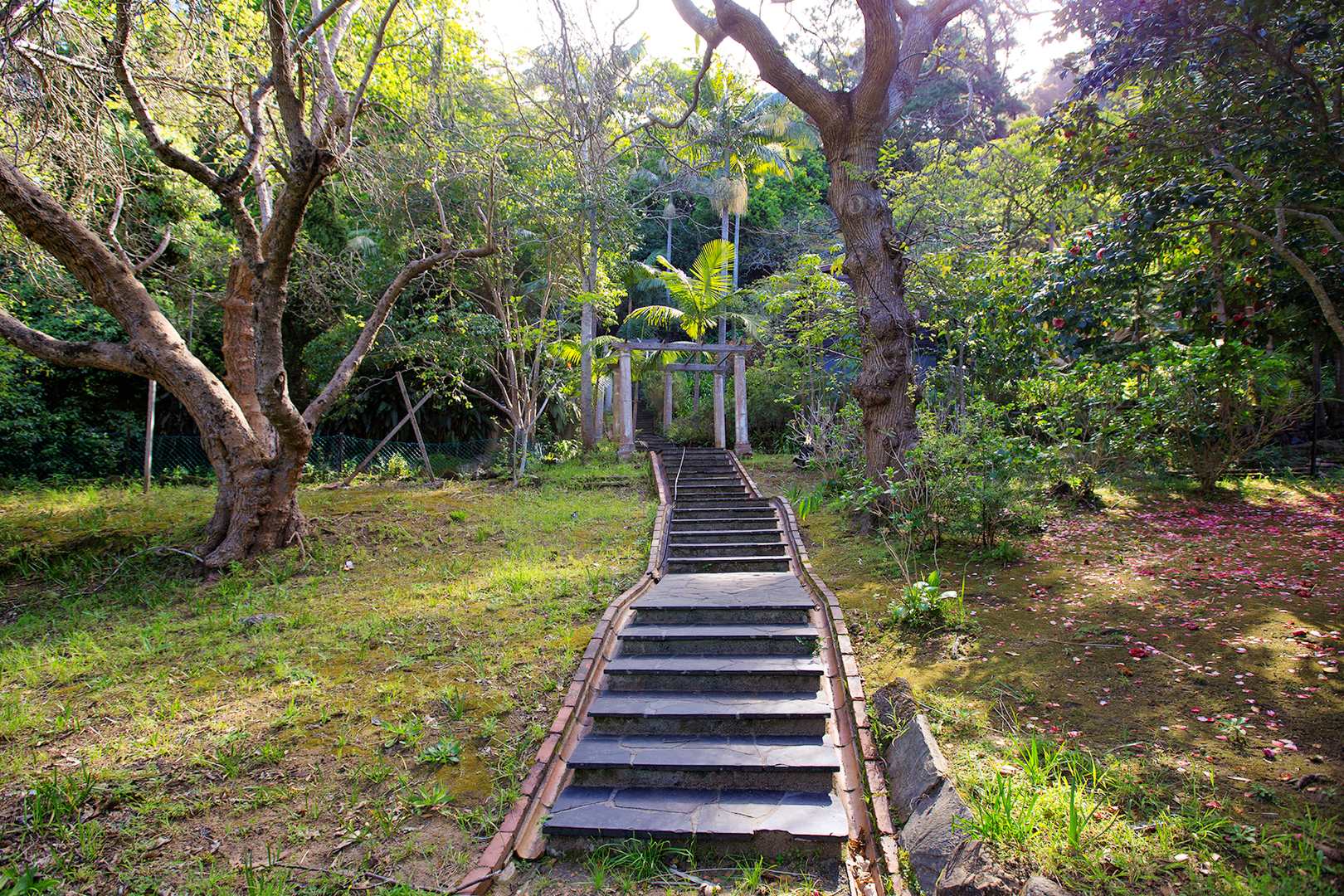 * Paved pathways and stone staircase