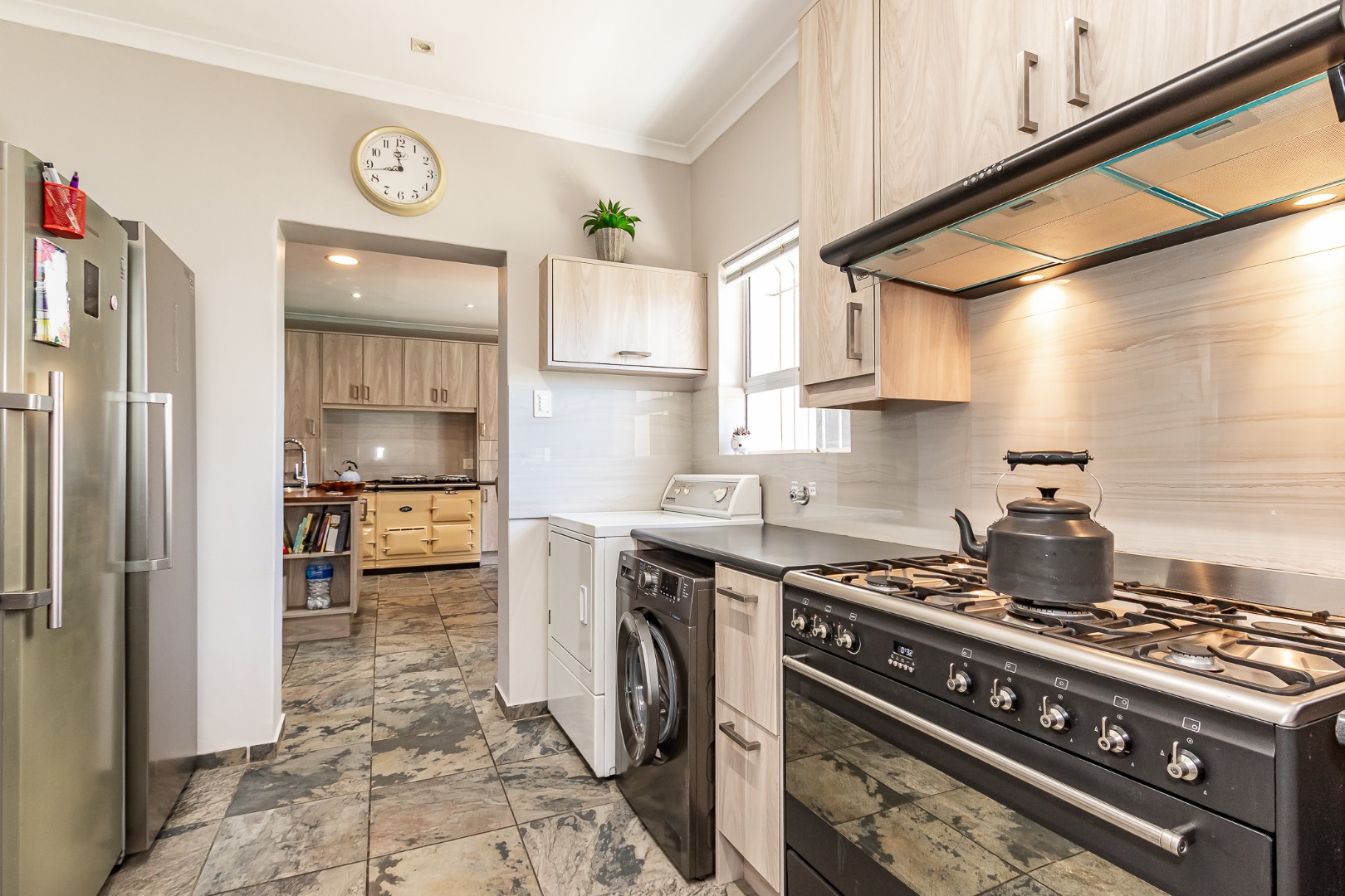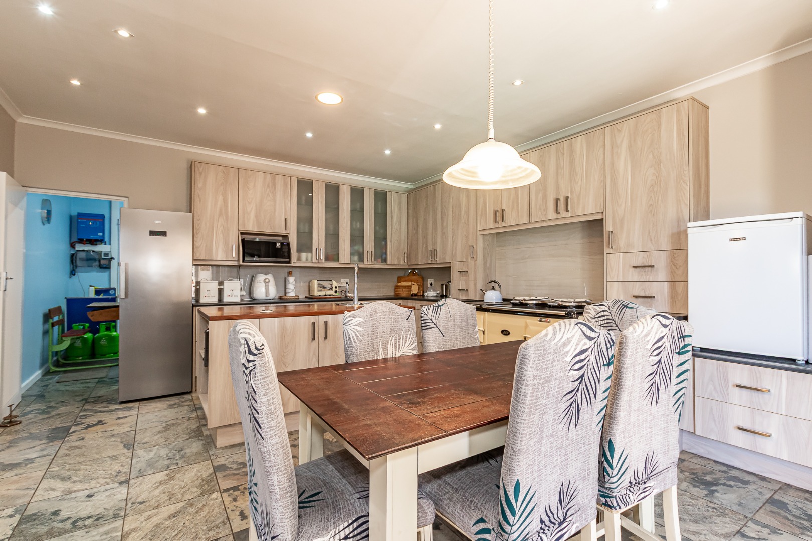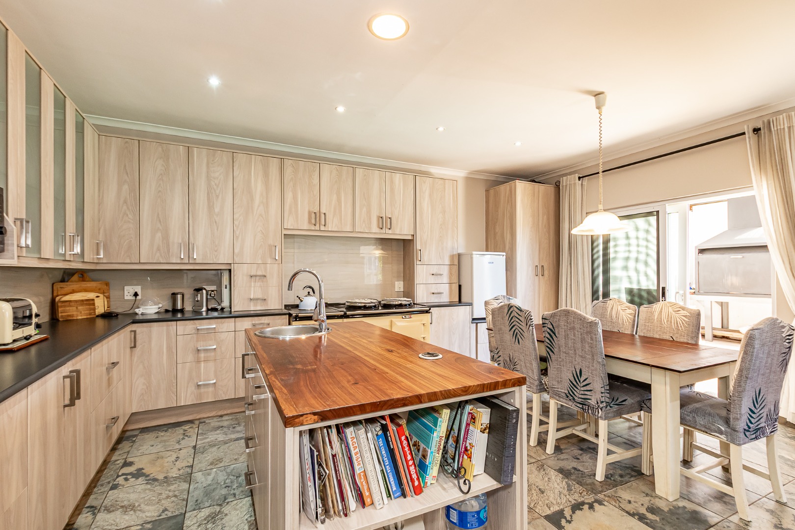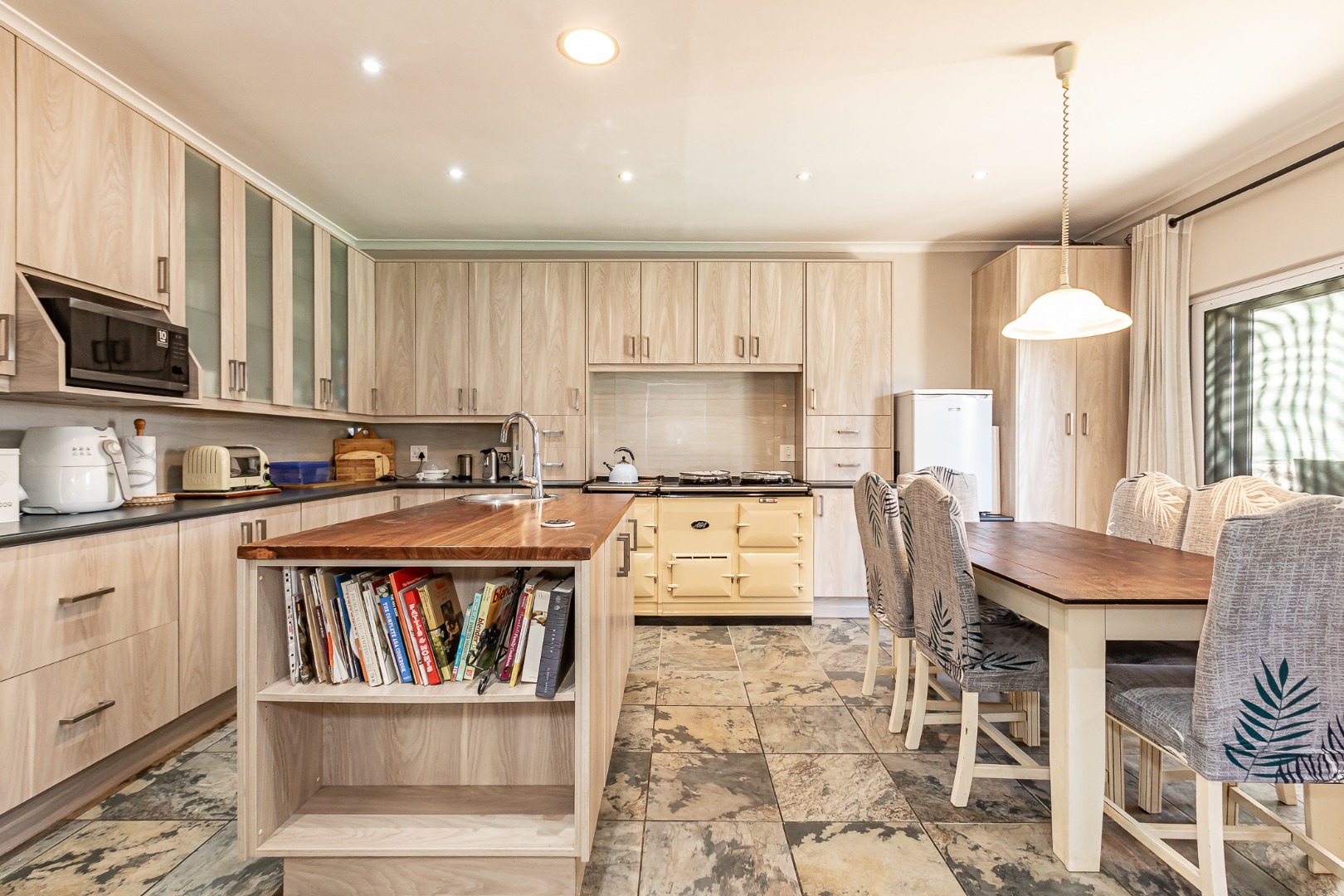 The winter kitchen, fitted with an imported built-in Aga stove, flows seamlessly to an undercover braai area overlooking the heated salt-chlorinated pool, creating a warm and inviting entertainment setting.