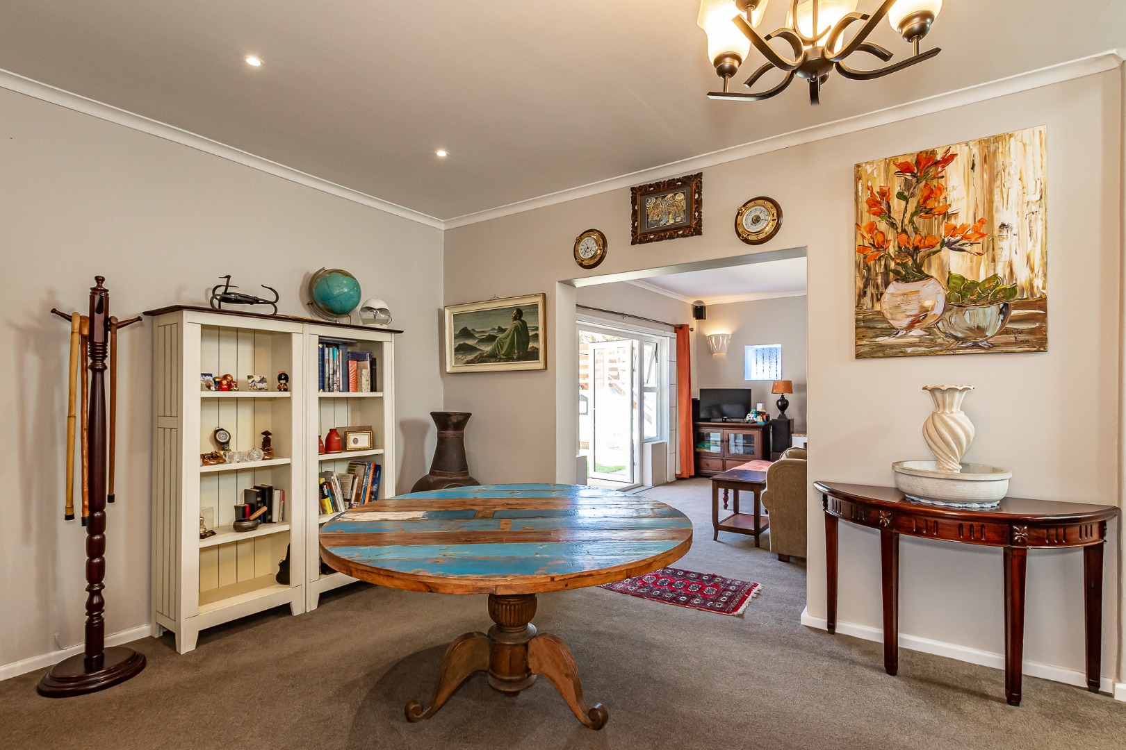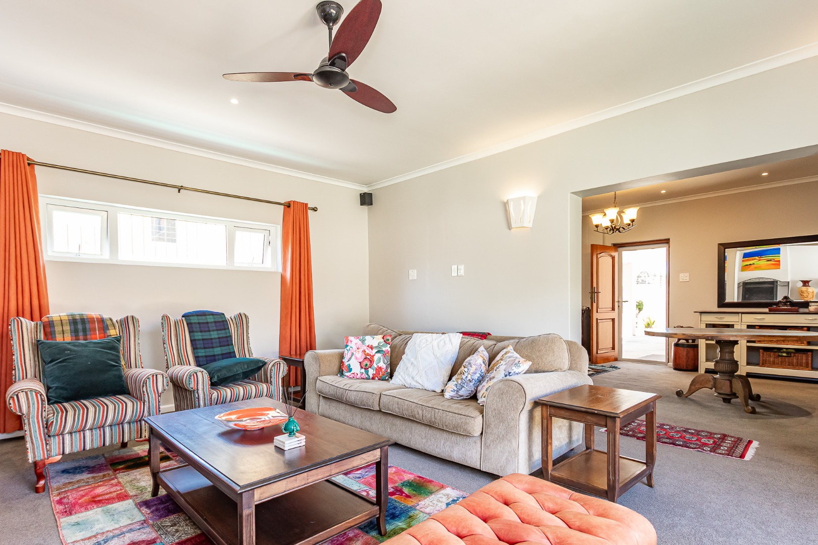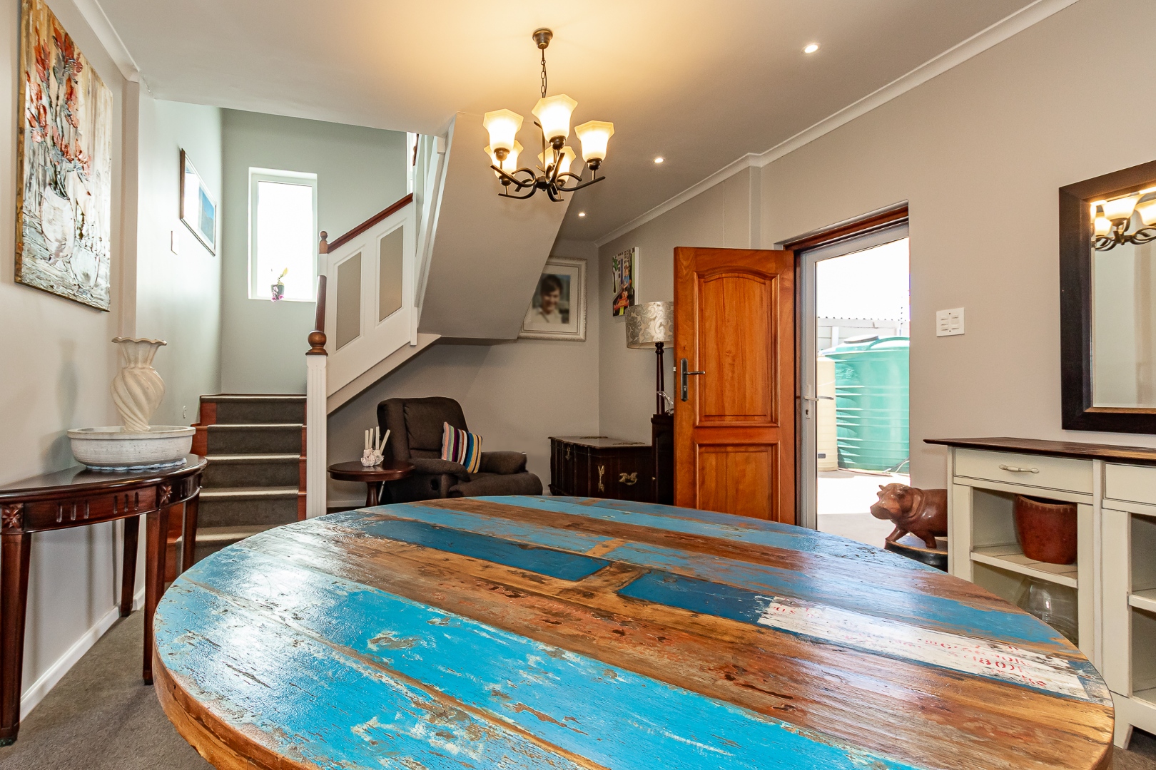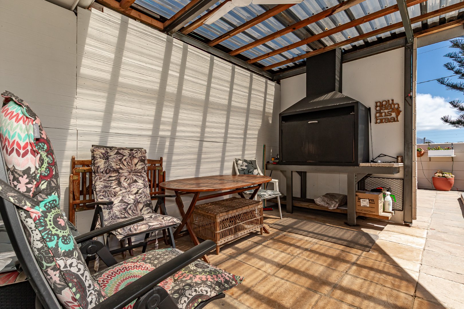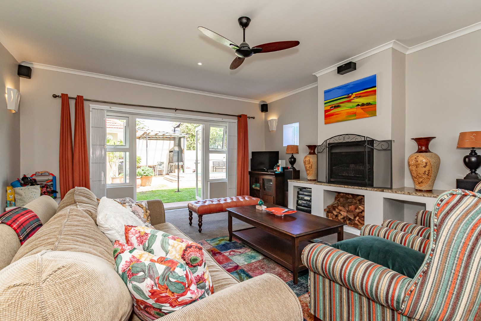 The winter kitchen, fitted with an imported built-in Aga stove, flows seamlessly to an undercover braai area overlooking the heated salt-chlorinated pool, creating a warm and inviting entertainment setting.
