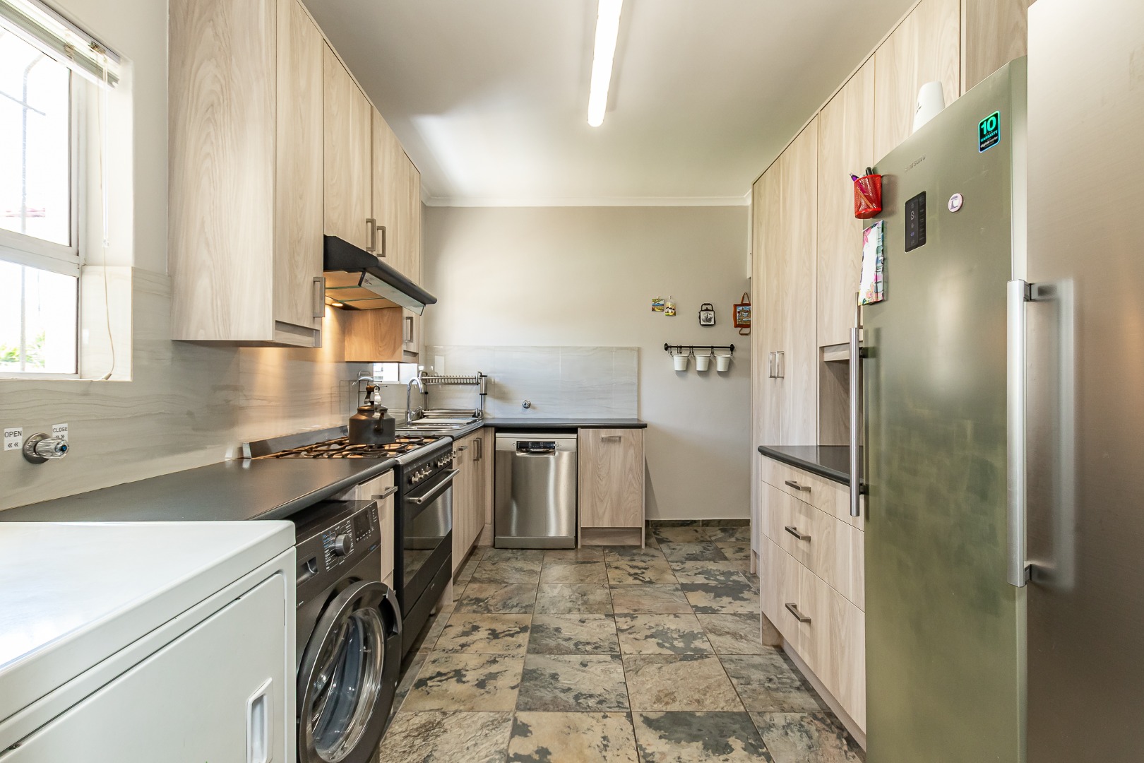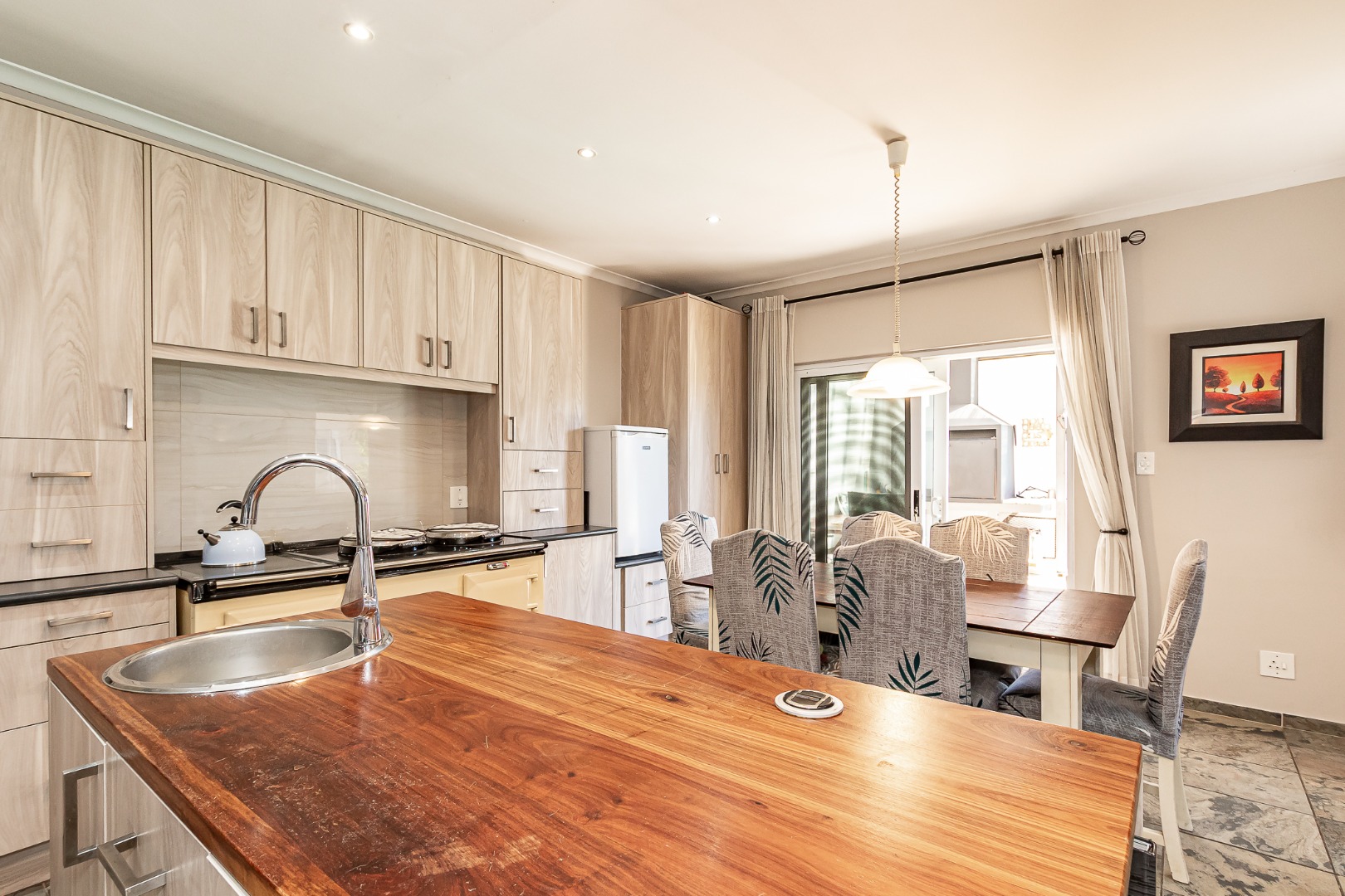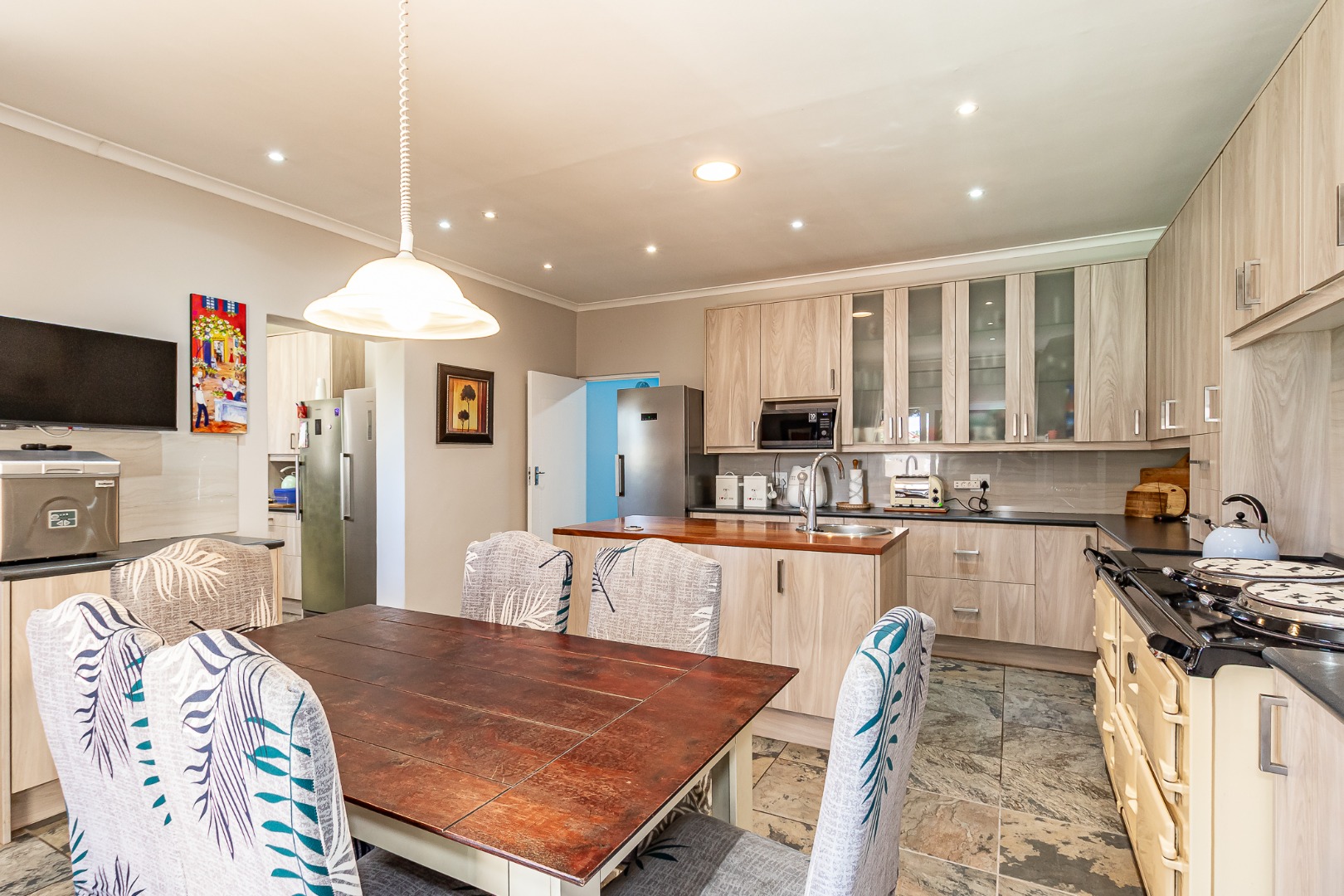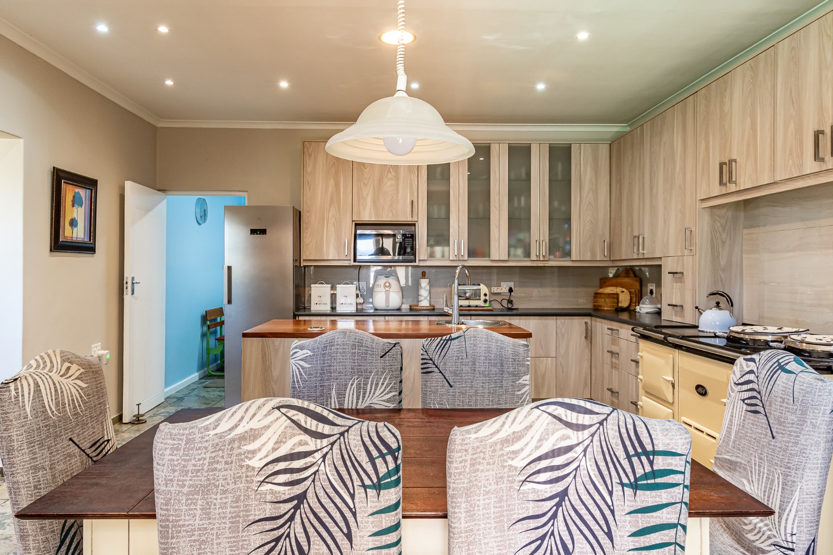 The winter kitchen, fitted with an imported built-in Aga stove, flows seamlessly to an undercover braai area overlooking the heated salt-chlorinated pool, creating a warm and inviting entertainment setting.