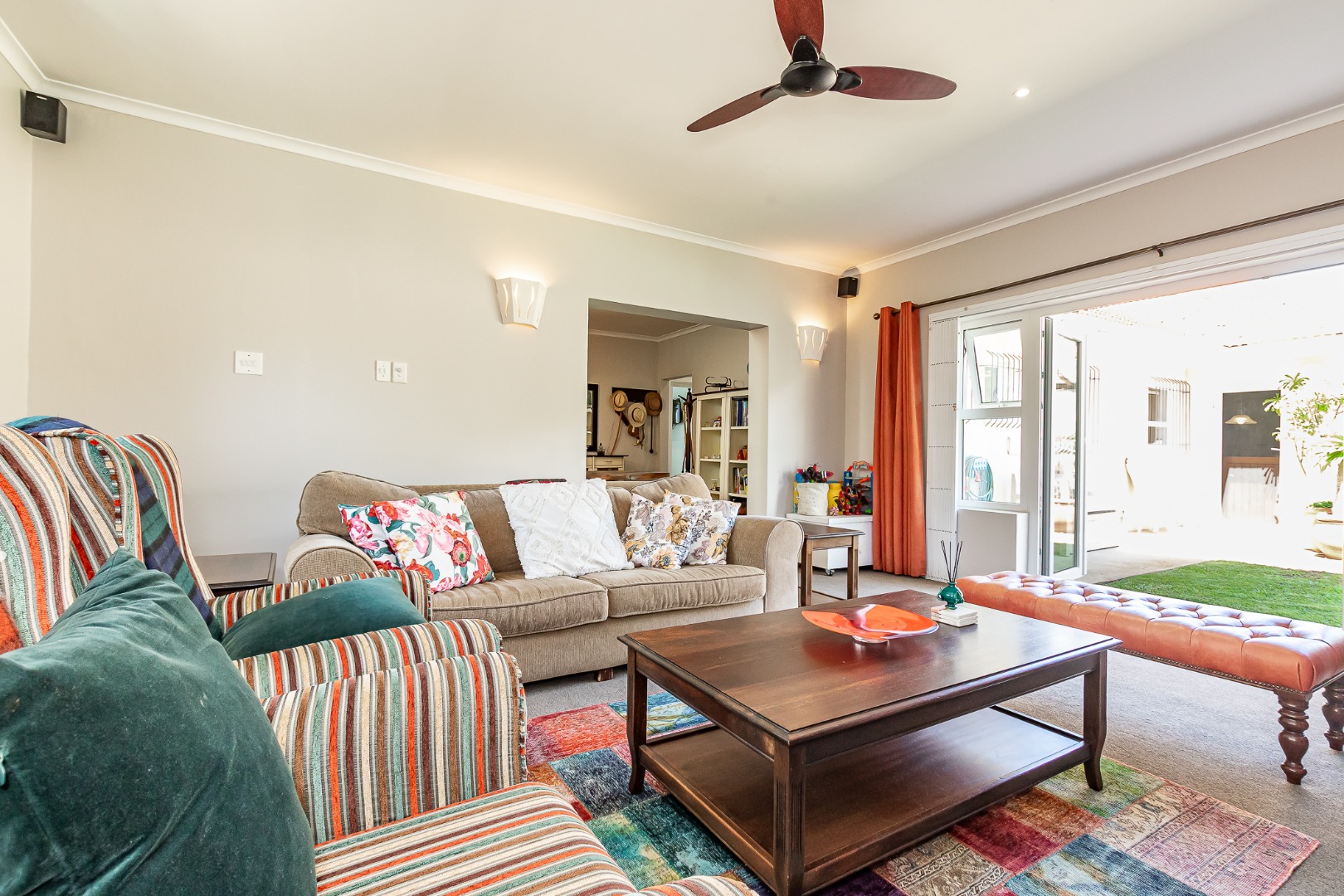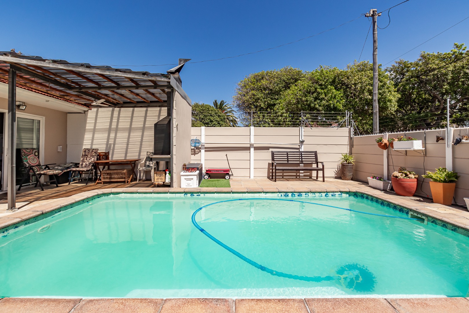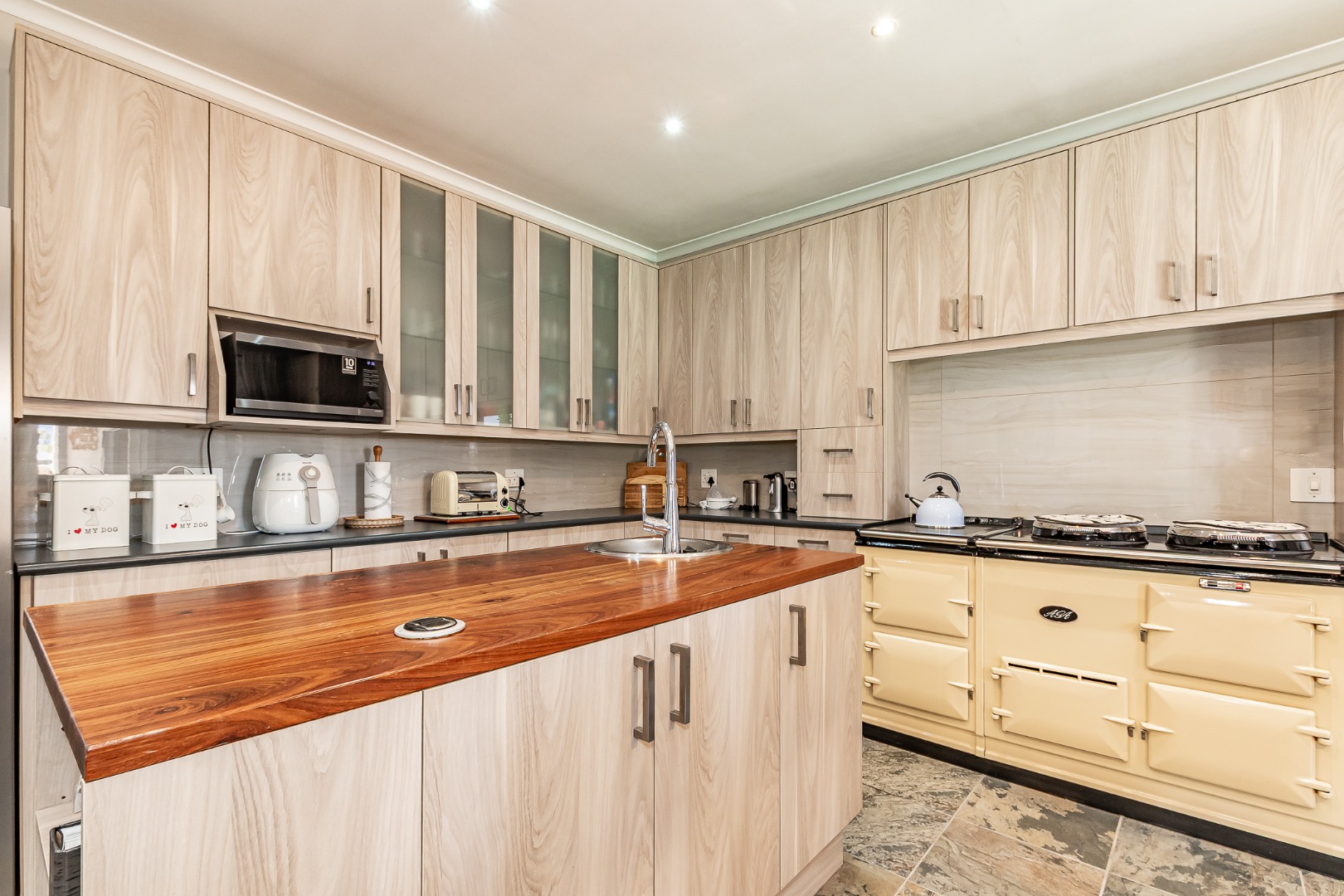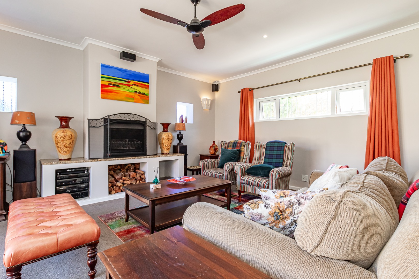 The winter kitchen, fitted with an imported built-in Aga stove, flows seamlessly to an undercover braai area overlooking the heated salt-chlorinated pool, creating a warm and inviting entertainment setting.
