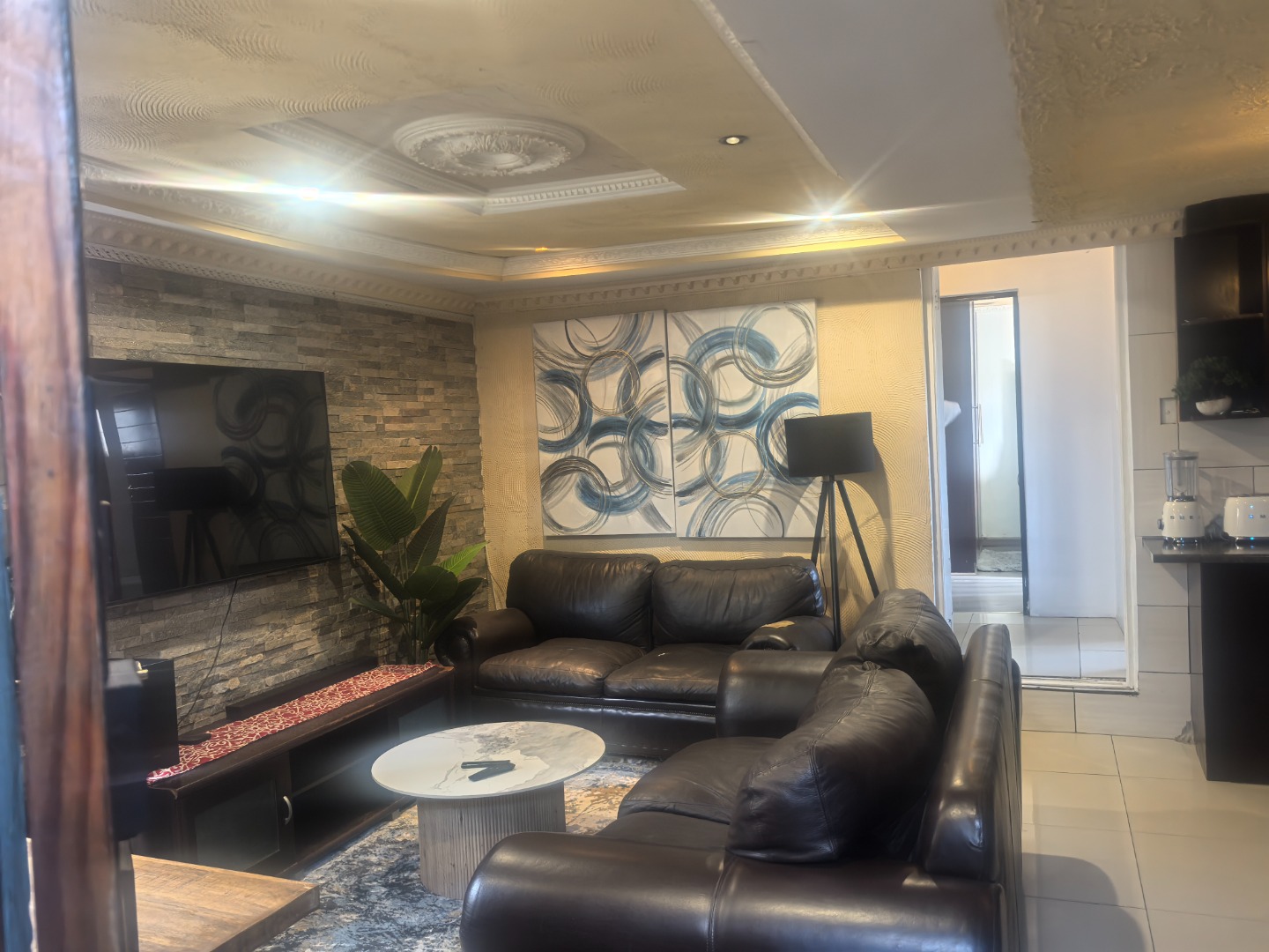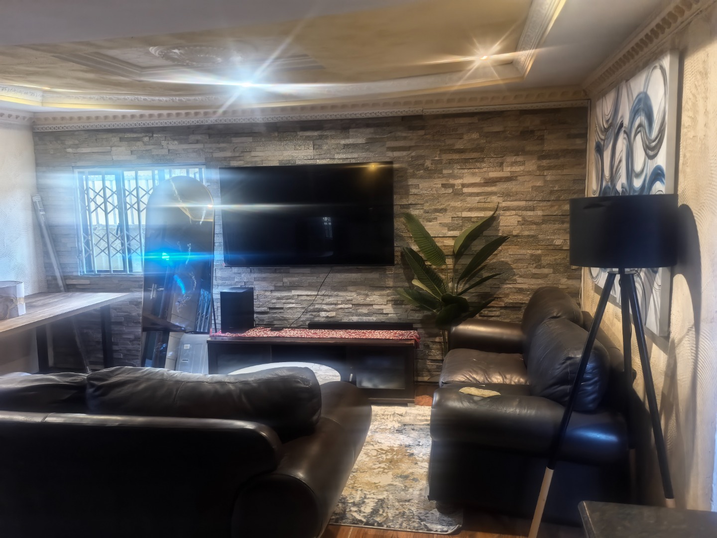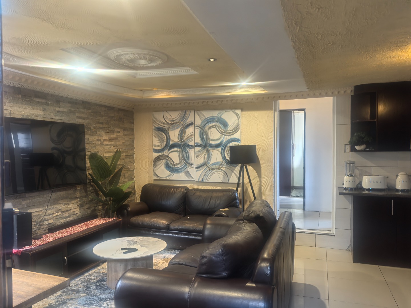Step inside to an inviting open-plan living area, where modern design meets comfort. The lounge features stylish dark leather sectional sofas, a large wall-mounted TV set against an elegant stacked stone accent wall, and contemporary abstract art. Decorative ceiling molding and a central medallion add character to the space. The adjacent kitchen is well-appointed with modern dark wood cabinetry, ample storage, and stainless steel appliances, including a built-in oven and a double-door refrigerator. Tiled flooring and a white subway tile backsplash complete the functional and aesthetic appeal.