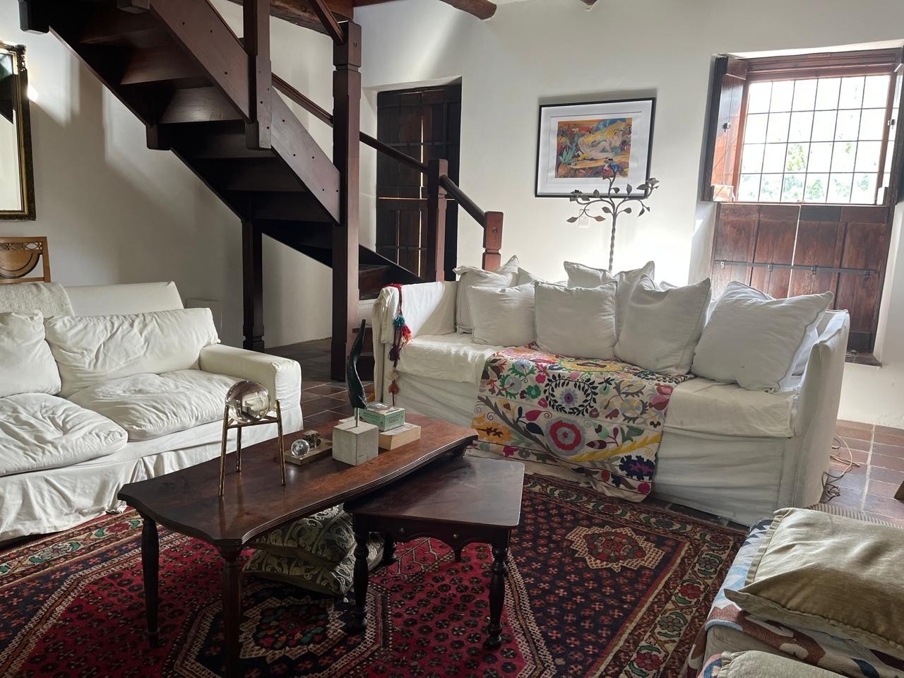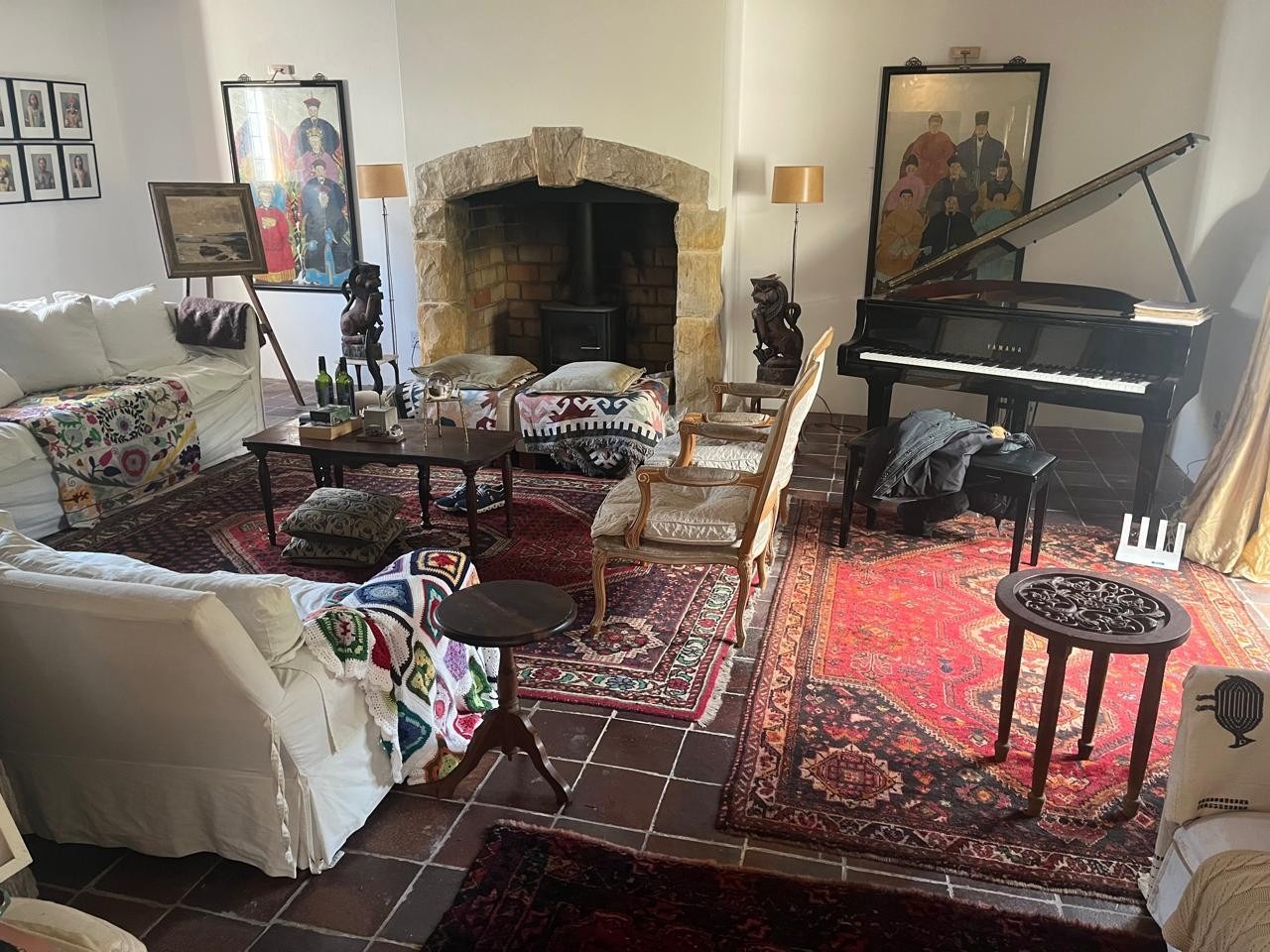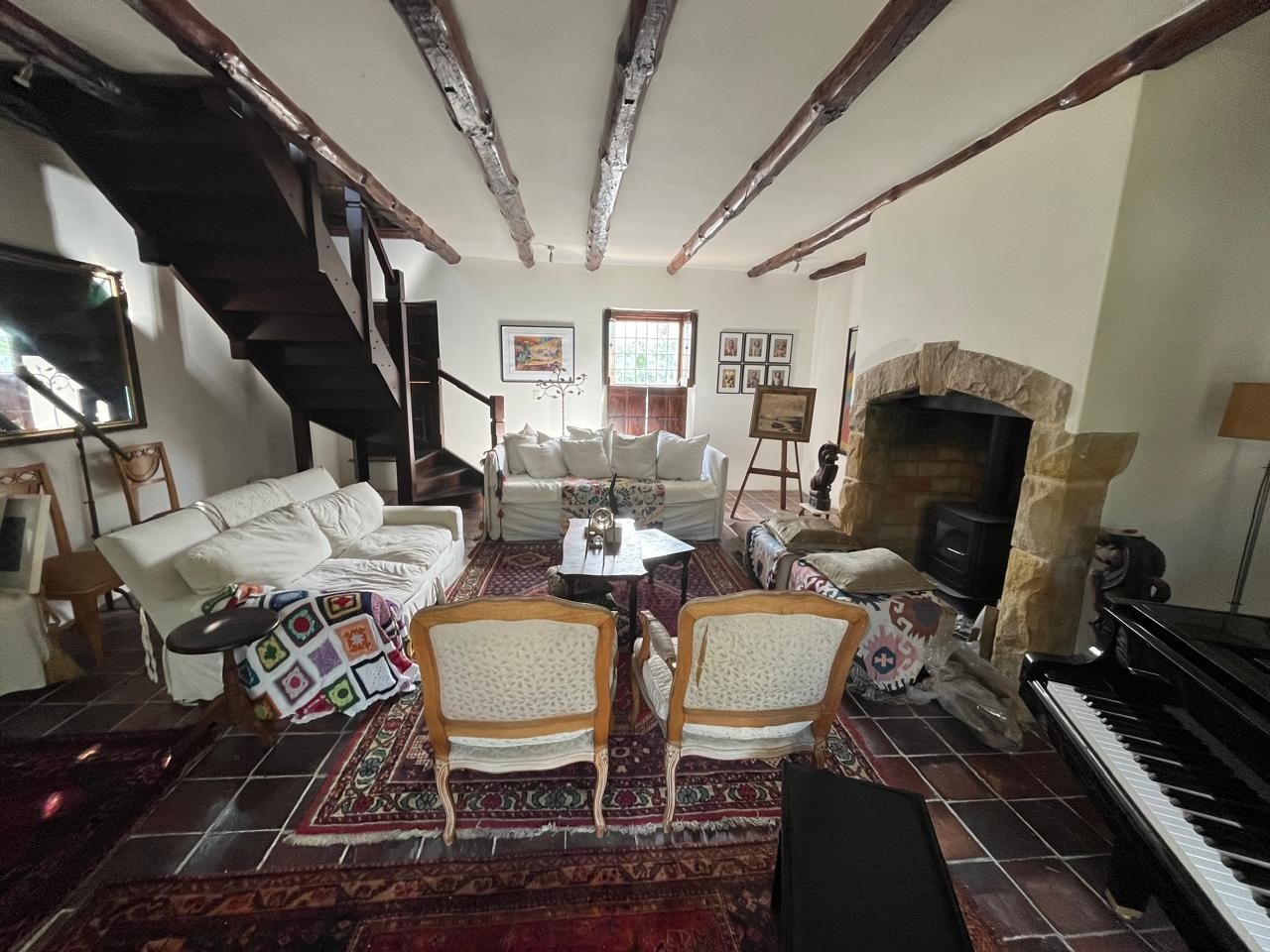 The living area is generous and inviting, complete with a fireplace and beautifully preserved tiled floors.