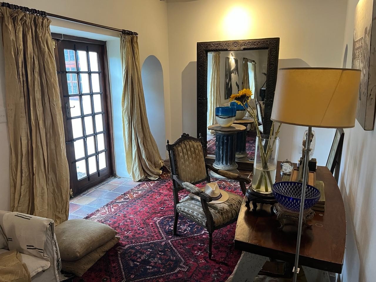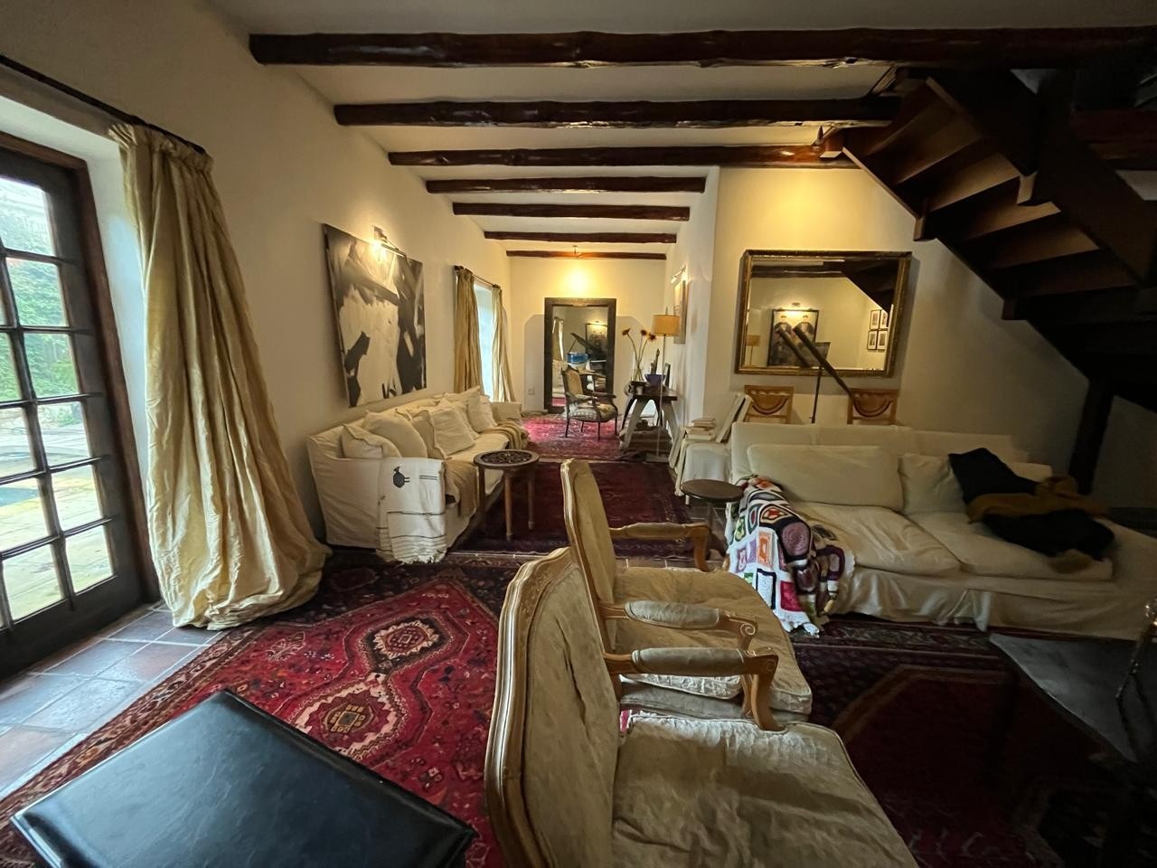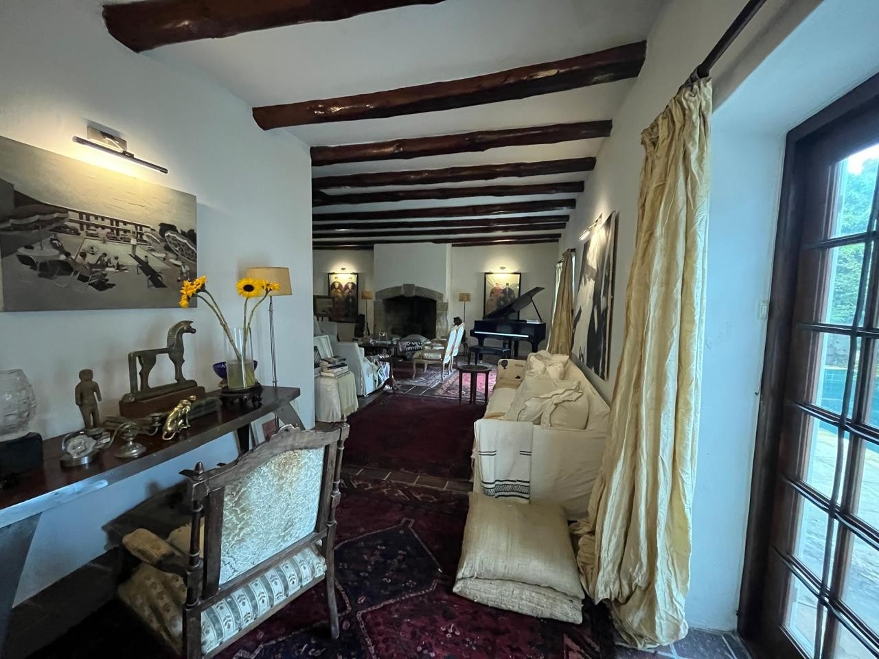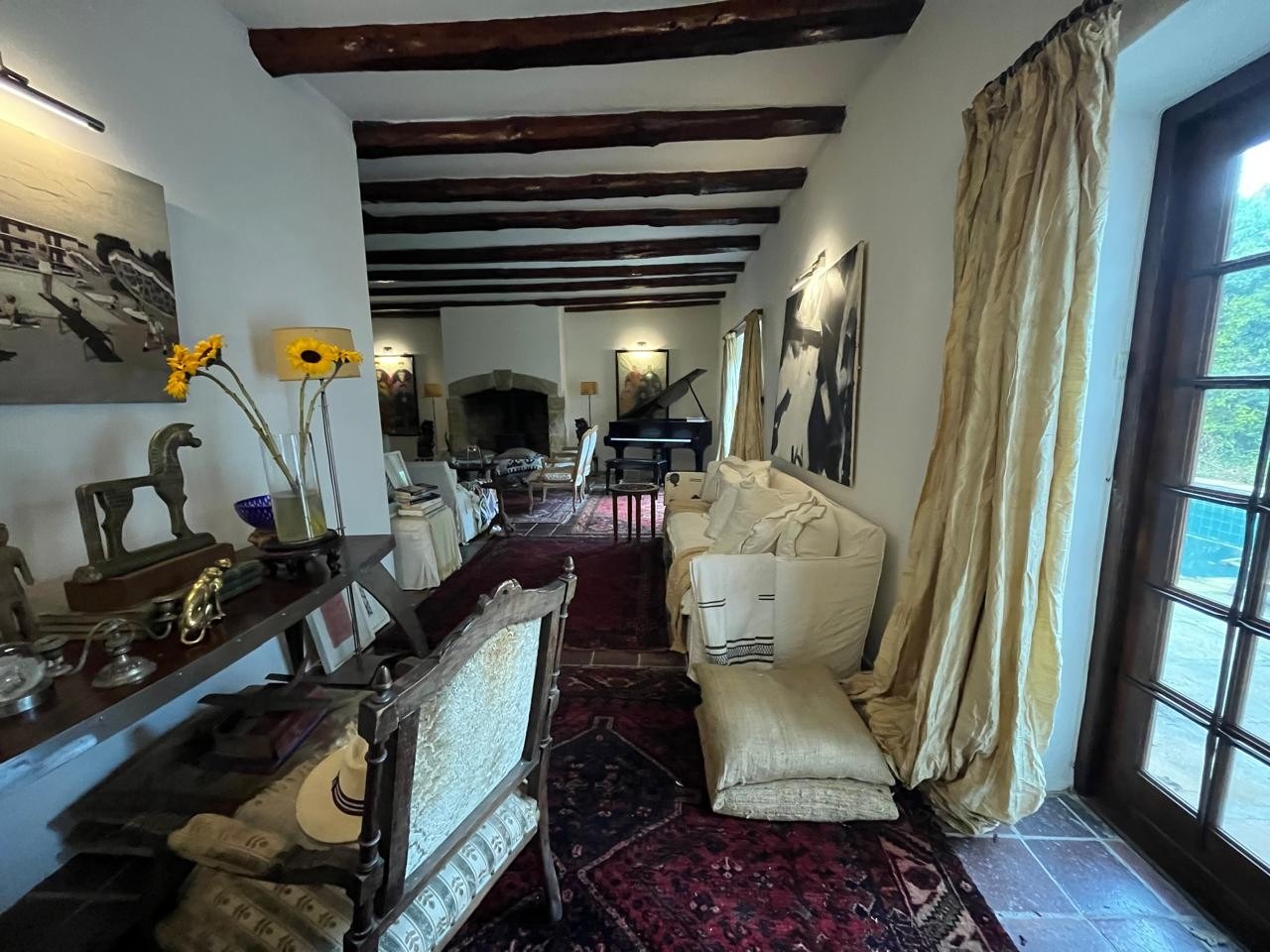 The living area is generous and inviting, complete with a fireplace and beautifully preserved tiled floors.