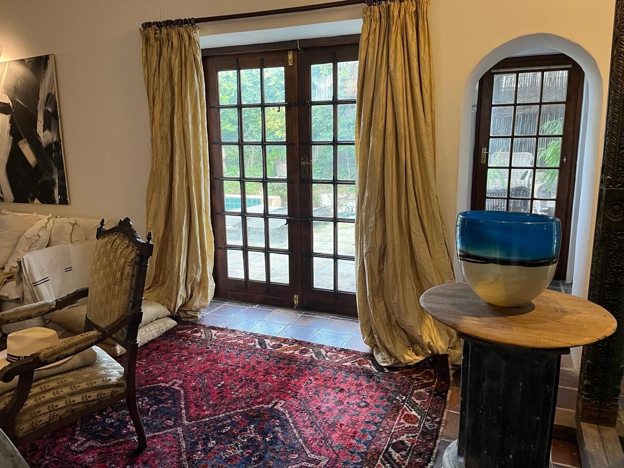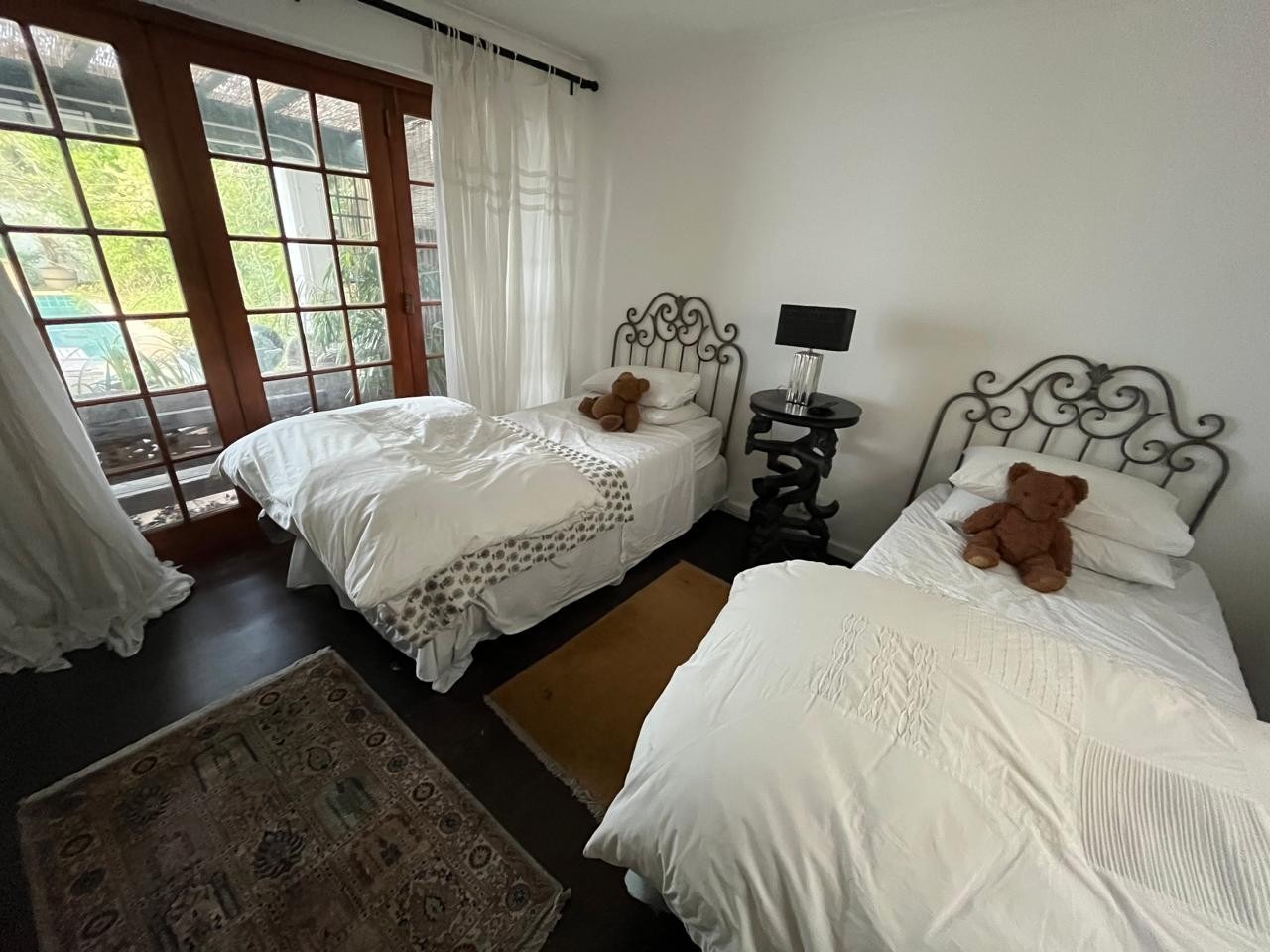 One ground-floor bedroom opens onto the pool area, while an additional upstairs room leads to a private balcony.