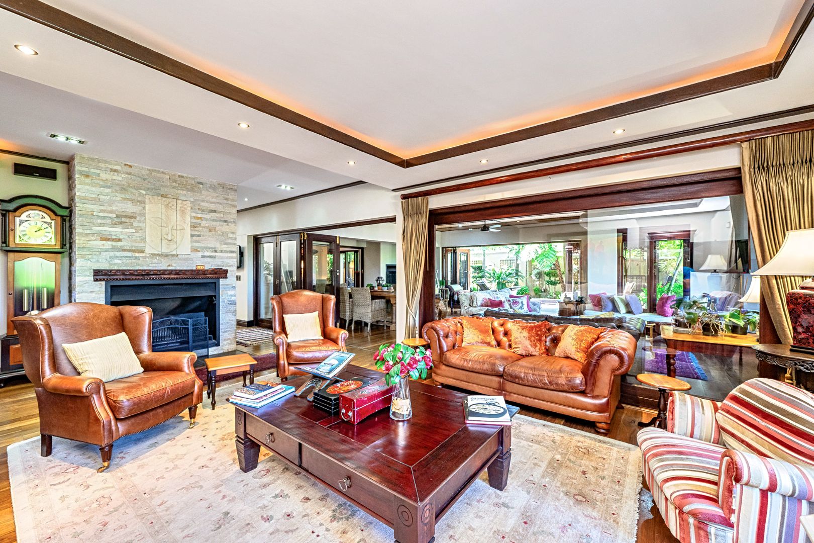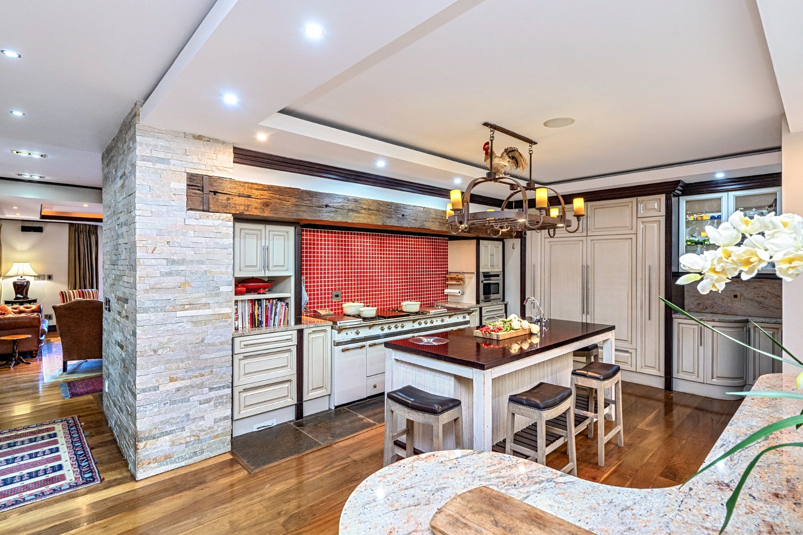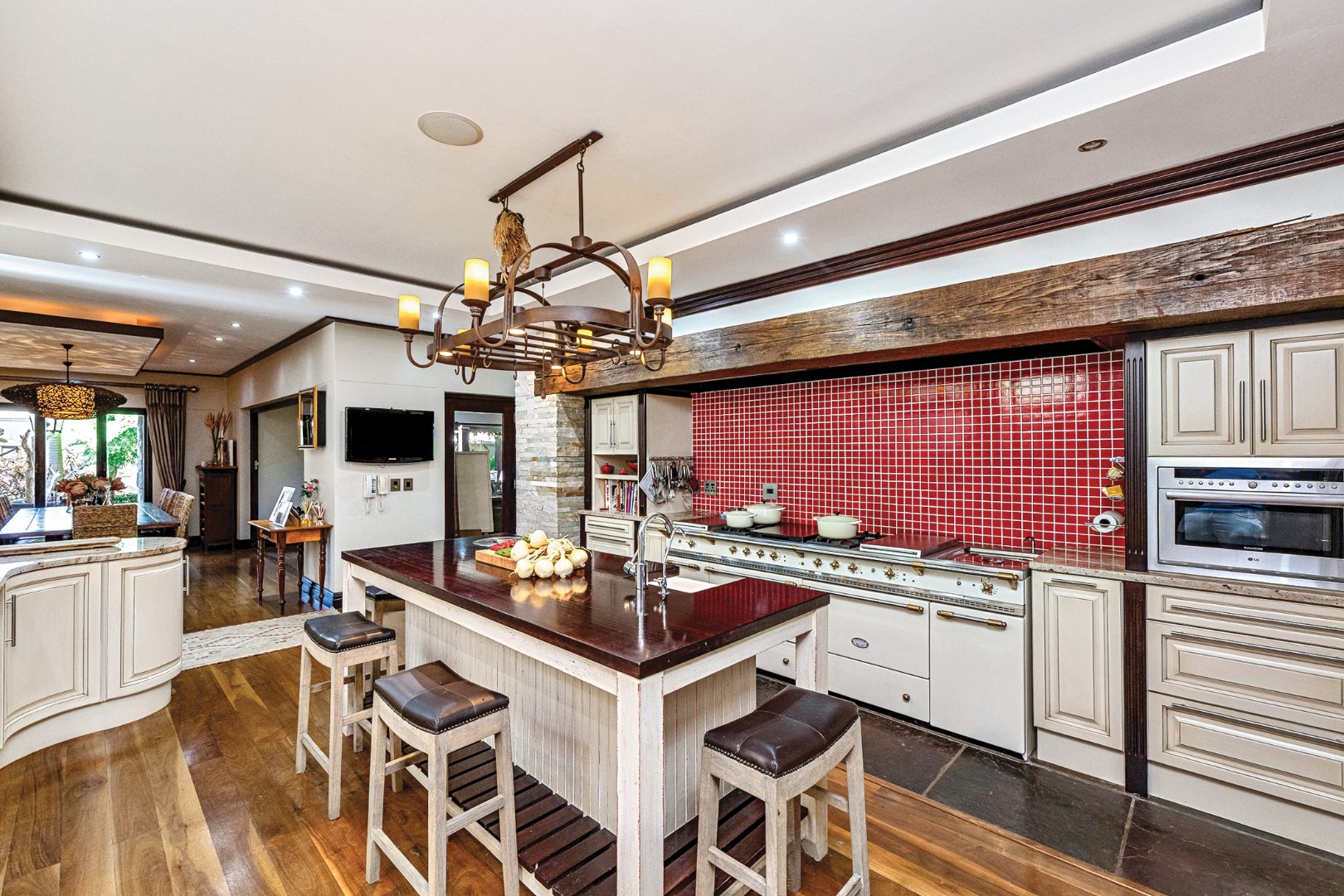 The heart of the home is the chef’s kitchen, masterfully designed with a premium Lacanche oven, granite countertops, and a large central island. This culinary space integrates beautifully with the open-plan dining area and TV lounge—perfect for entertaining or relaxed family living. The adjacent indoor braai room and lounge with a fireplace both open onto a spacious wooden deck, overlooking a sparkling saltwater pool and lush greenery—a true haven of peace and privacy.