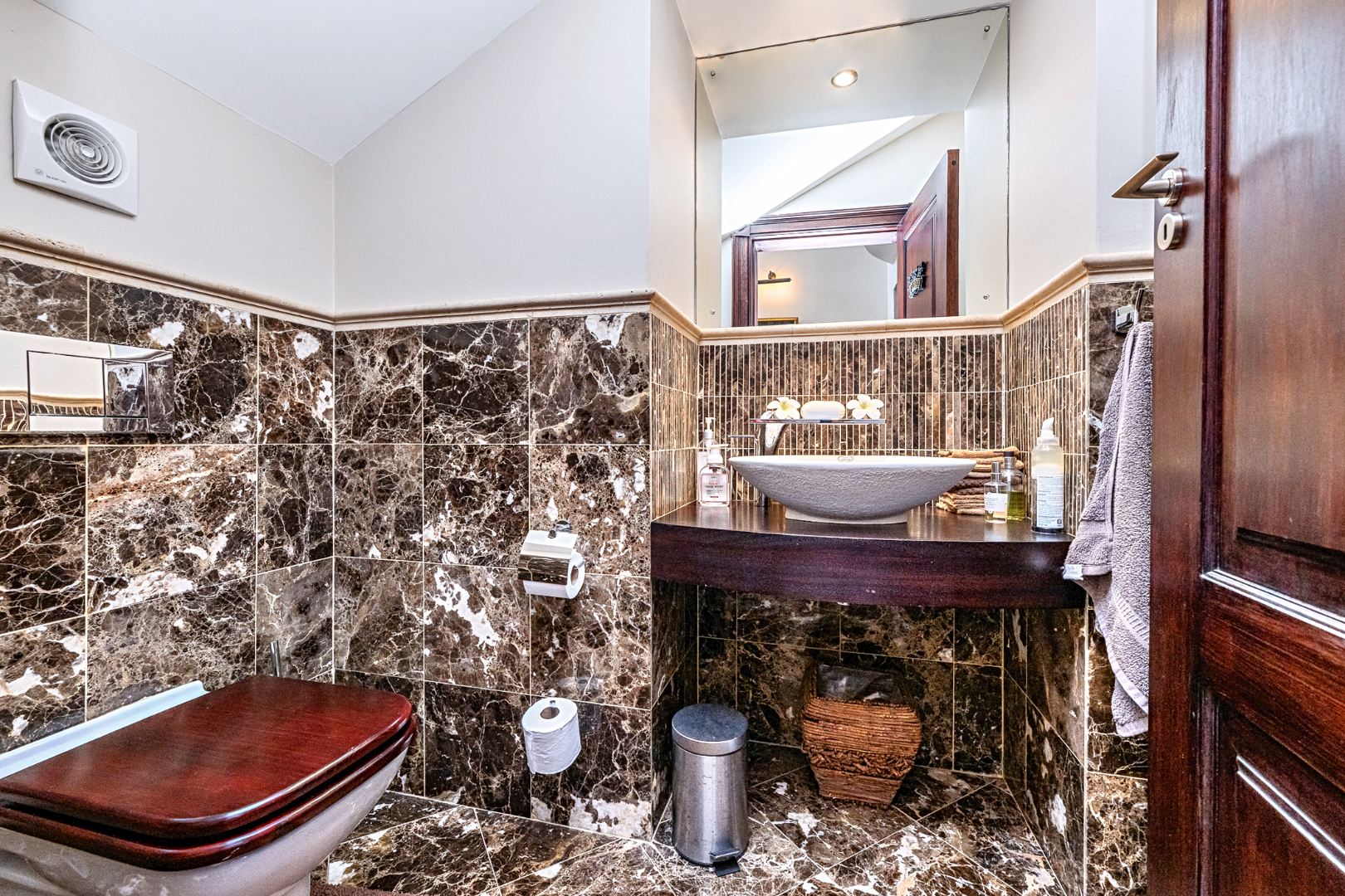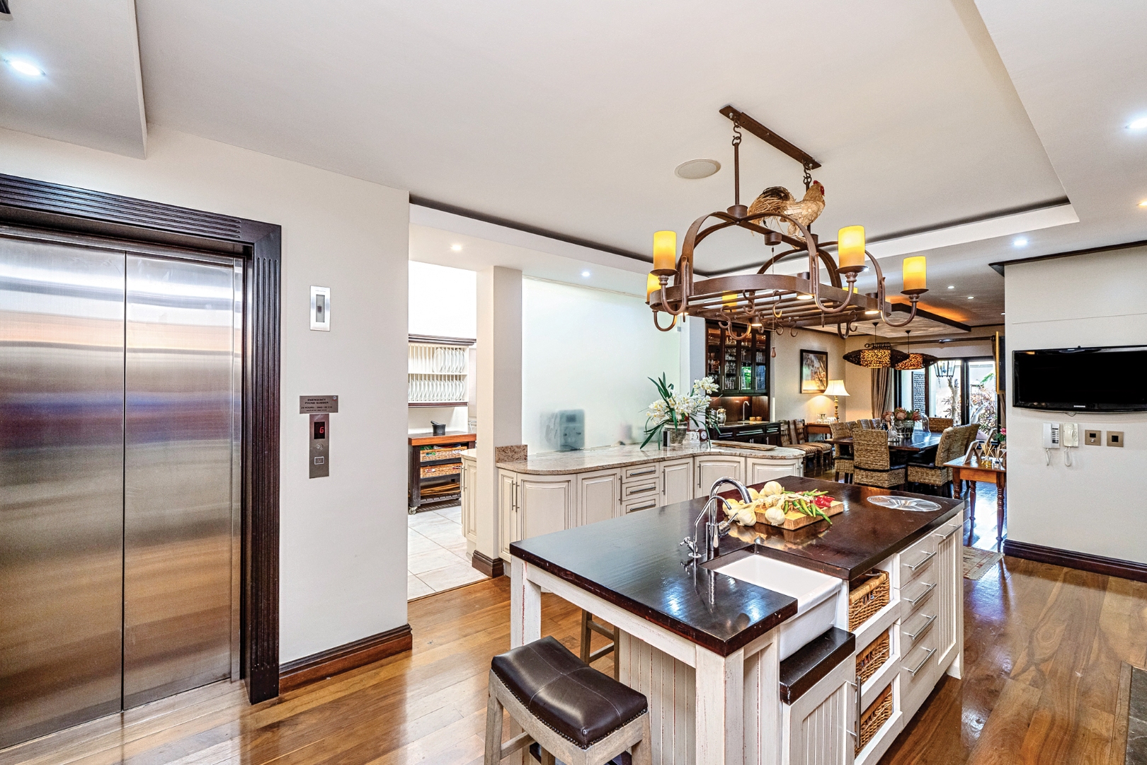 For added convenience and accessibility, a private lift offers effortless access between floors. Additional living spaces include a stylish study with a built-in safe, a cosy wine cellar, a hobby room, and a well-appointed guest cloakroom. The separate scullery and laundry are fitted with granite countertops and ample storage, catering to all practical needs without compromising on design.