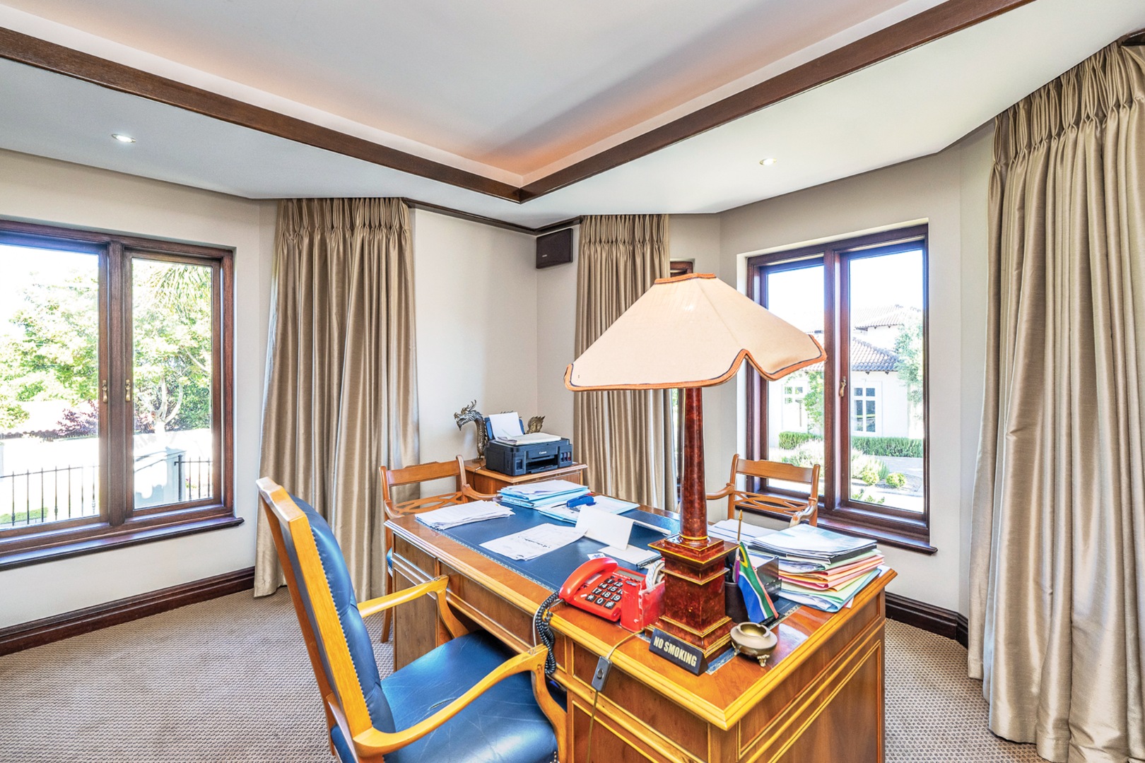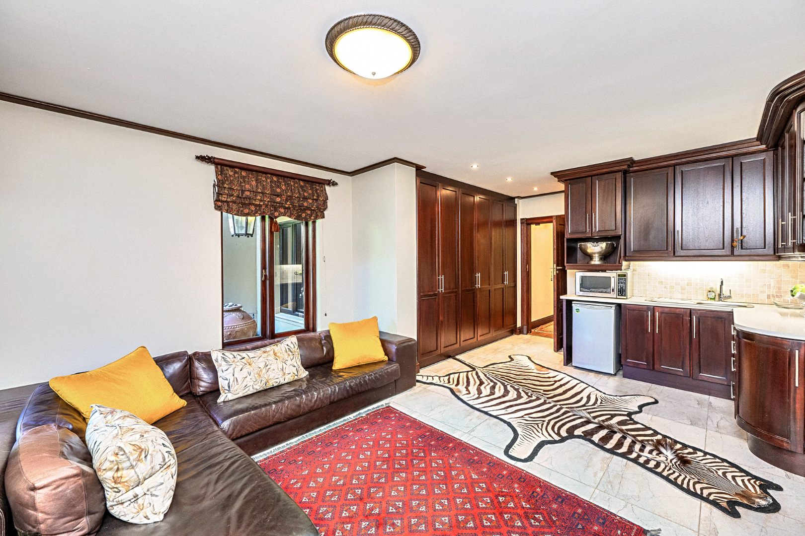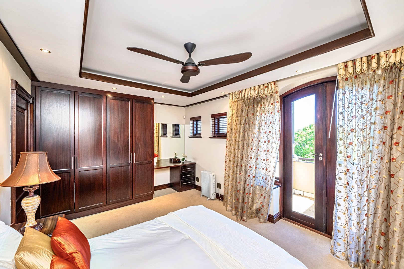 Accommodation is generous and private, with four large bedrooms, each featuring full en-suite bathrooms and luxurious finishes. Three upstairs bedrooms enjoy private balconies with sweeping views over the estate and distant mountains. The fourth bedroom, situated on the ground floor, includes its own lounge and kitchenette, making it ideal as a private guest suite or multi-generational living solution.