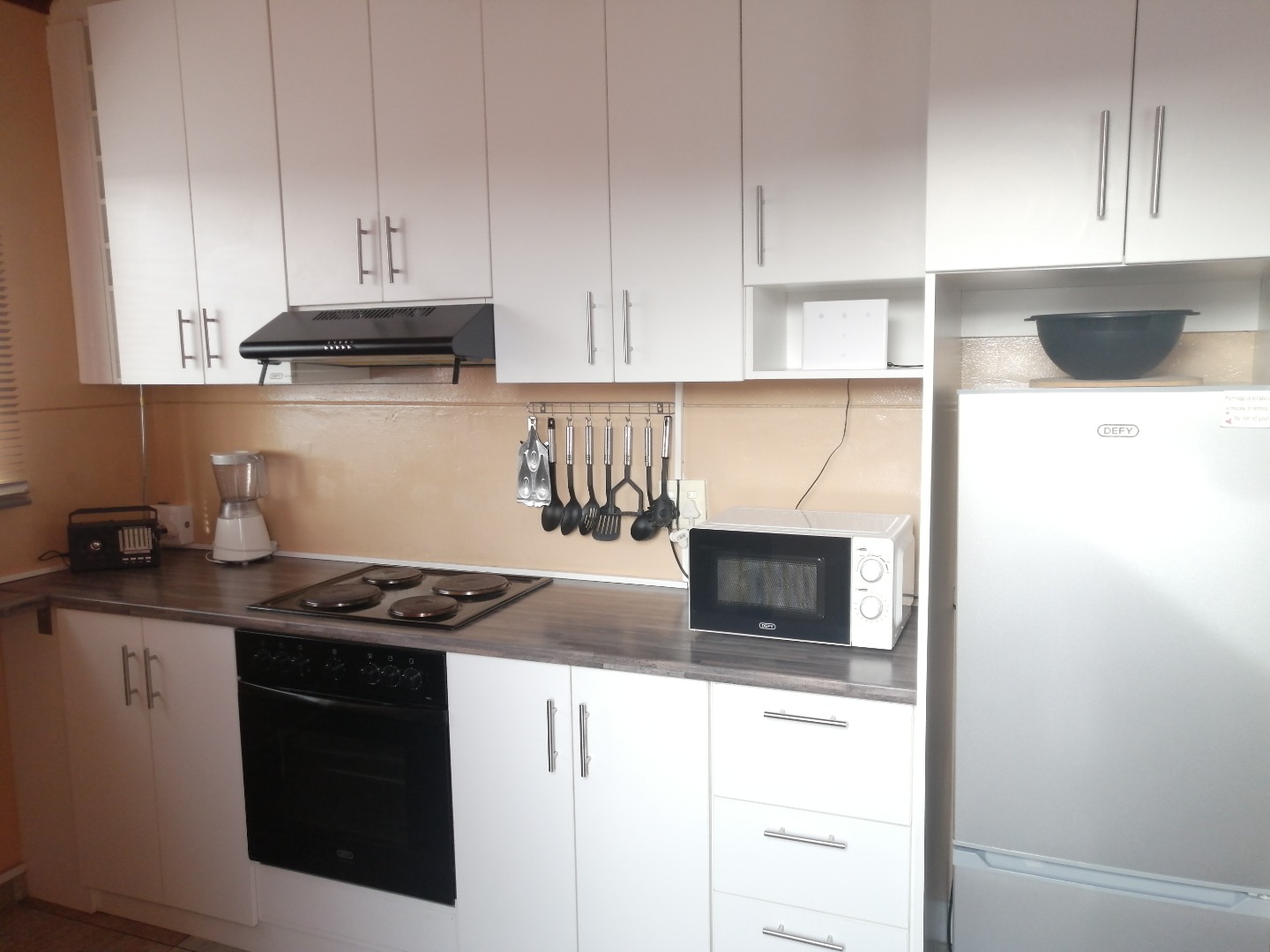 The kitchen is super practical, with modern white cupboards and fitted with a hob, oven, extractor fan.