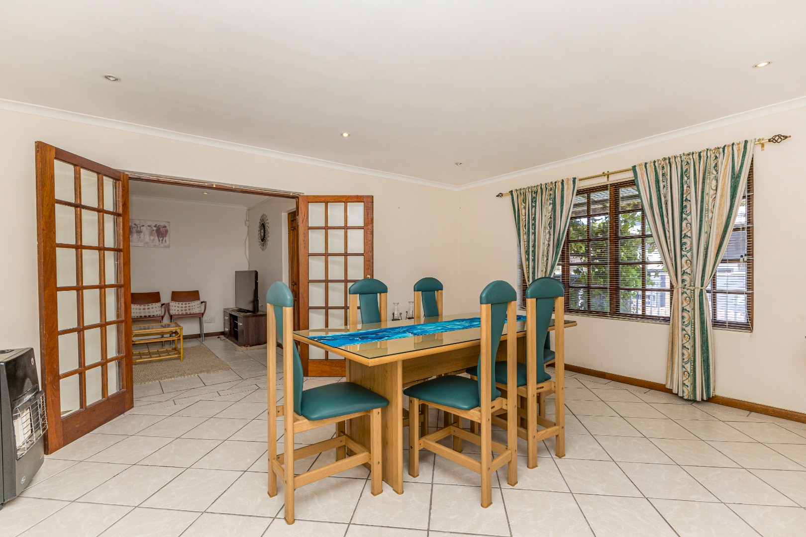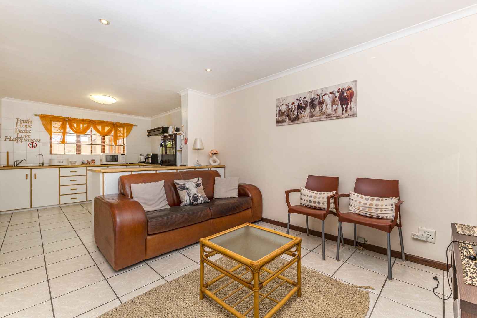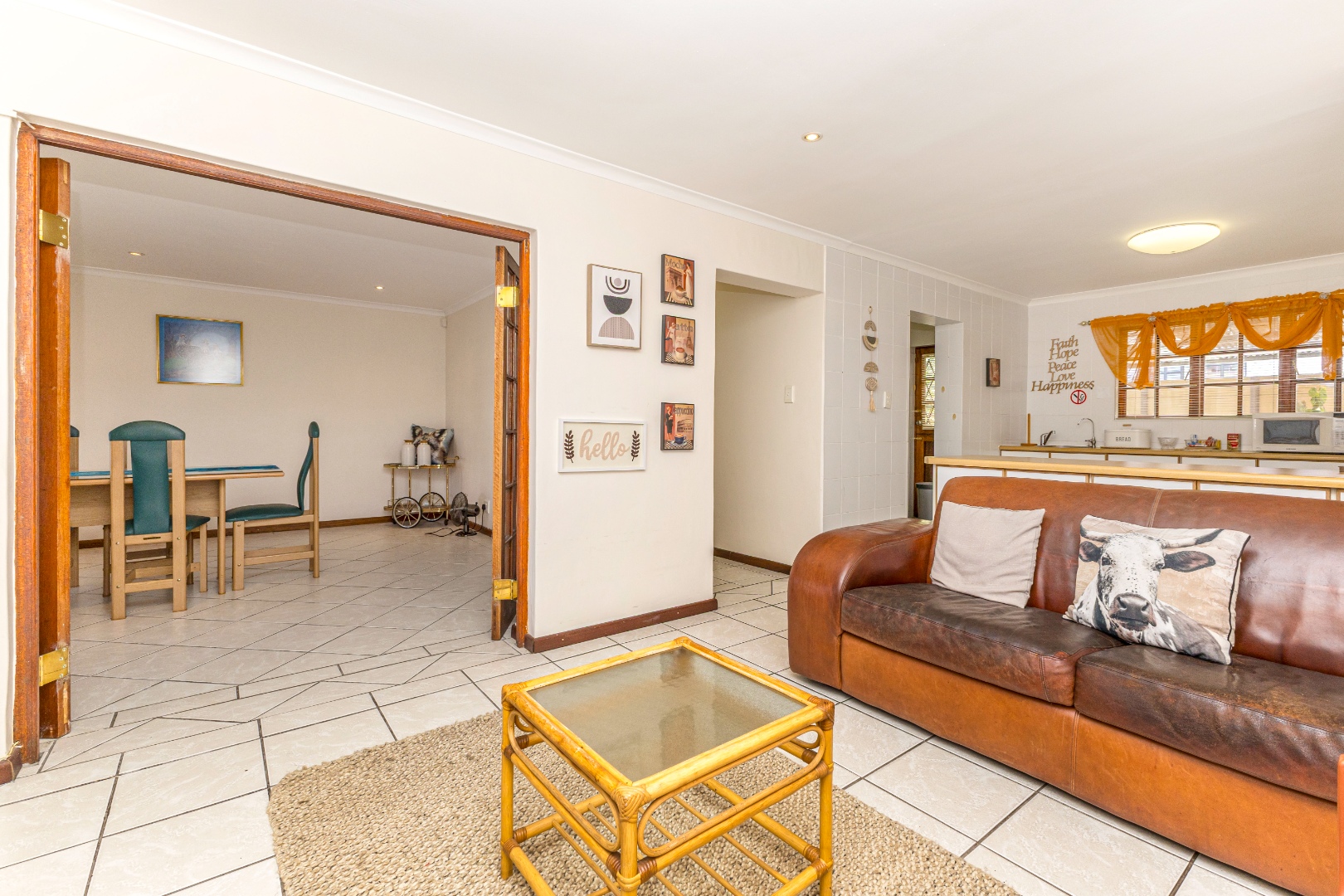 Open-plan Living: The living room, kitchen and dining room with the french doors seamlessly flows into one another, creating a welcoming atmosphere. The kitchen has ample storage cupboard space, as well as a scullery.