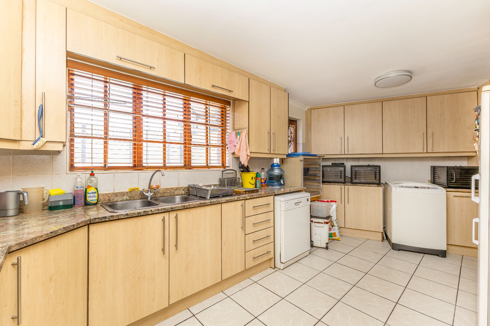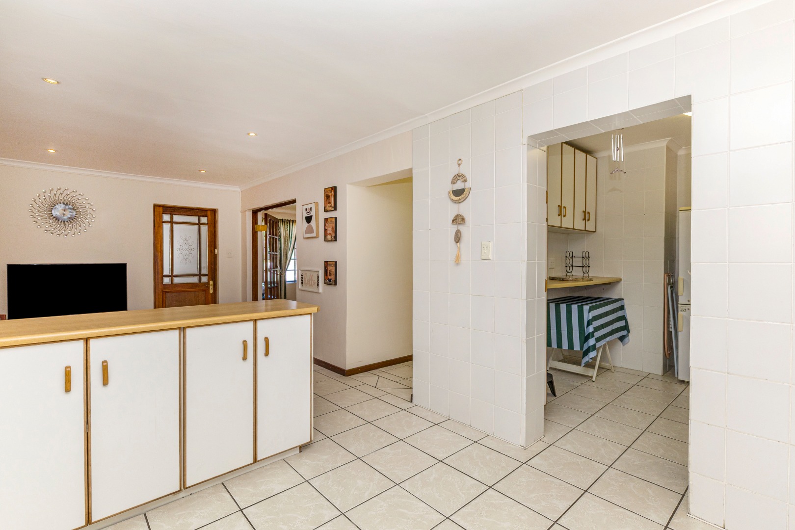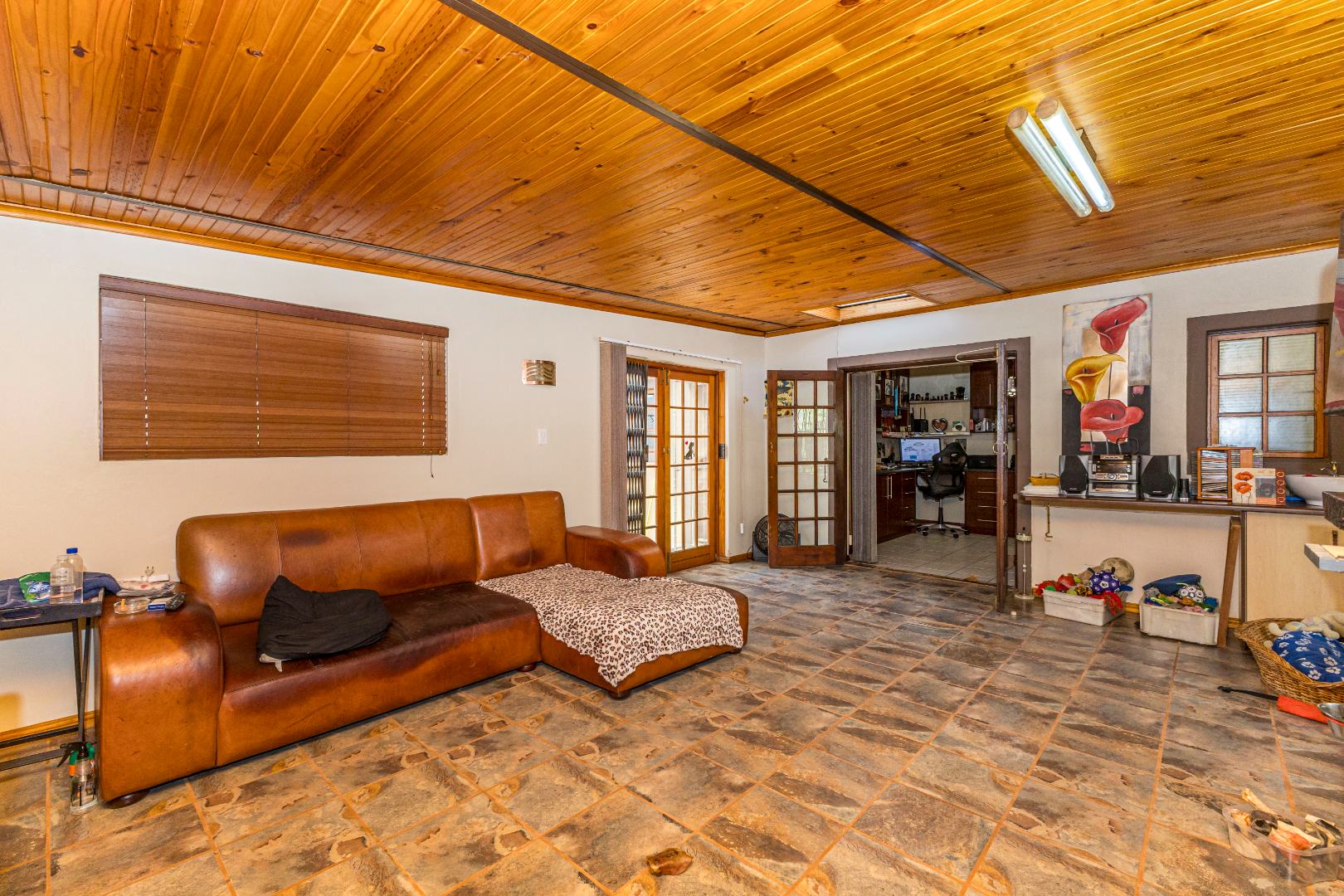 Open-plan Living: The living room, kitchen and dining room with the french doors seamlessly flows into one another, creating a welcoming atmosphere. The kitchen has ample storage cupboard space, as well as a scullery.