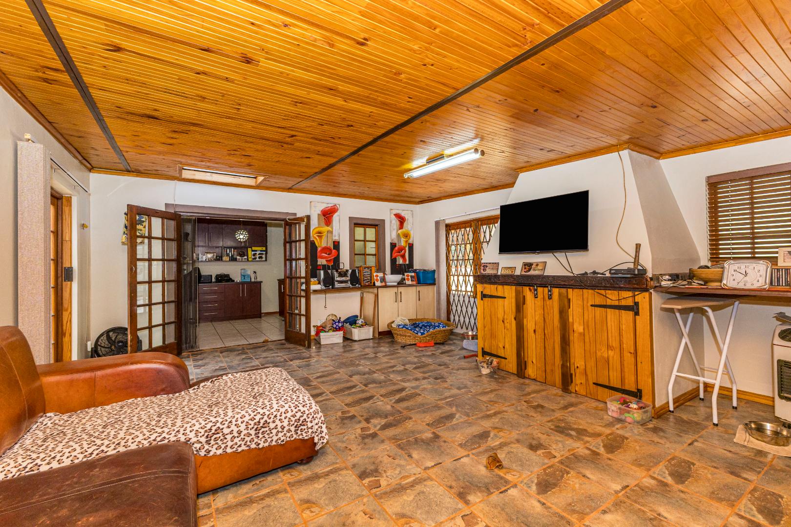 Entertainment Area: The entertainment area for endless friends and family gatherings. The wooden ceiling and french doors create a warmth and elegance into this cozy, inviting haven.