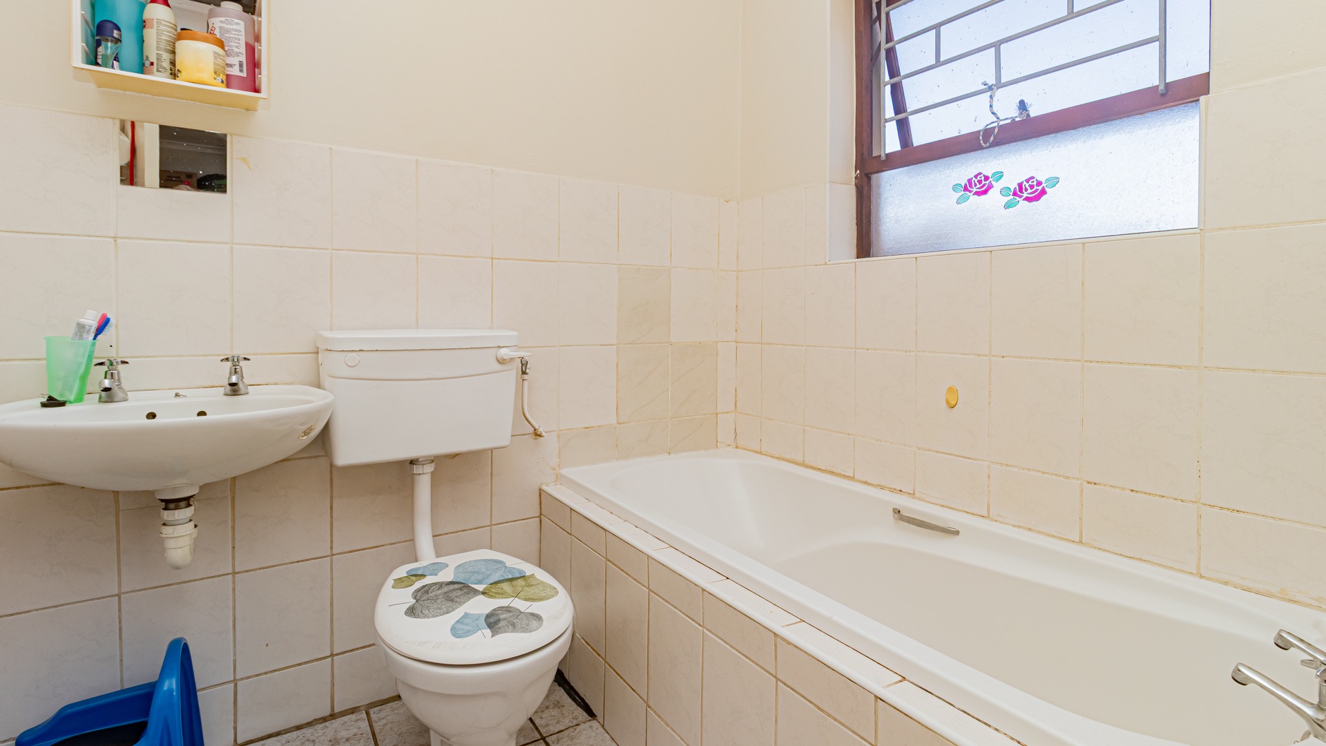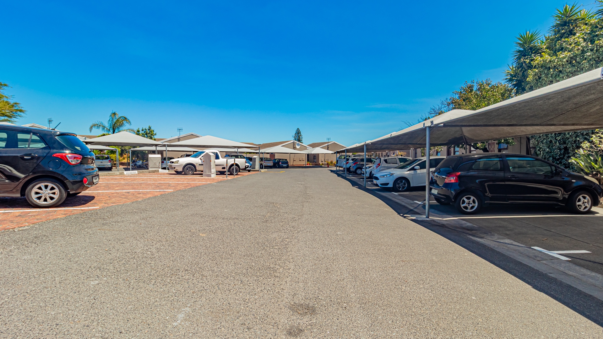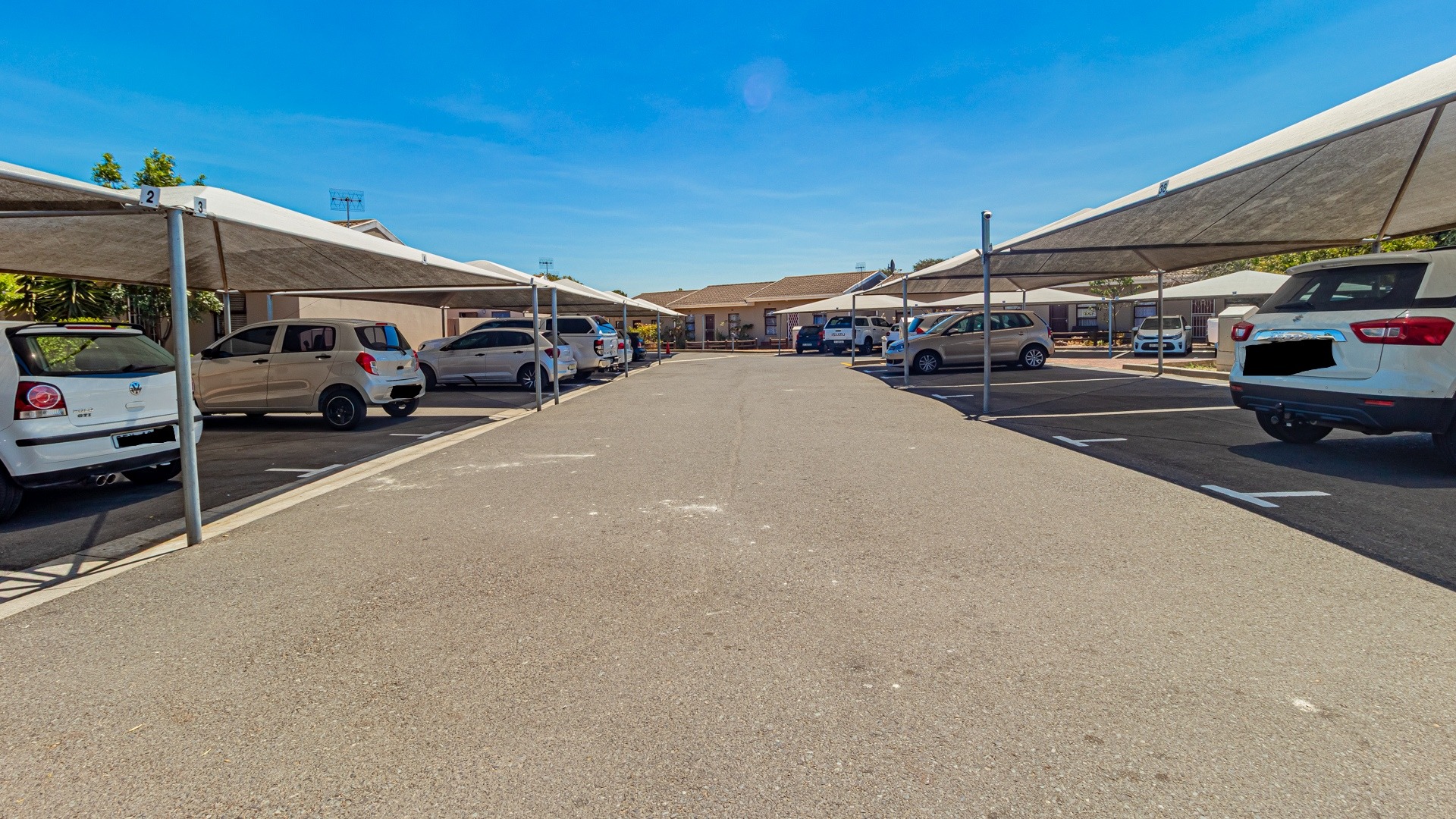 The comfortable bedroom includes a built-in wardrobe for convenient storage and a window fitted with security bars, allowing natural light while enhancing safety. The unit also comprises one well-appointed bathroom. Residents benefit from one dedicated parking space, with the complex offering numerous covered carports for additional vehicle protection and convenience.