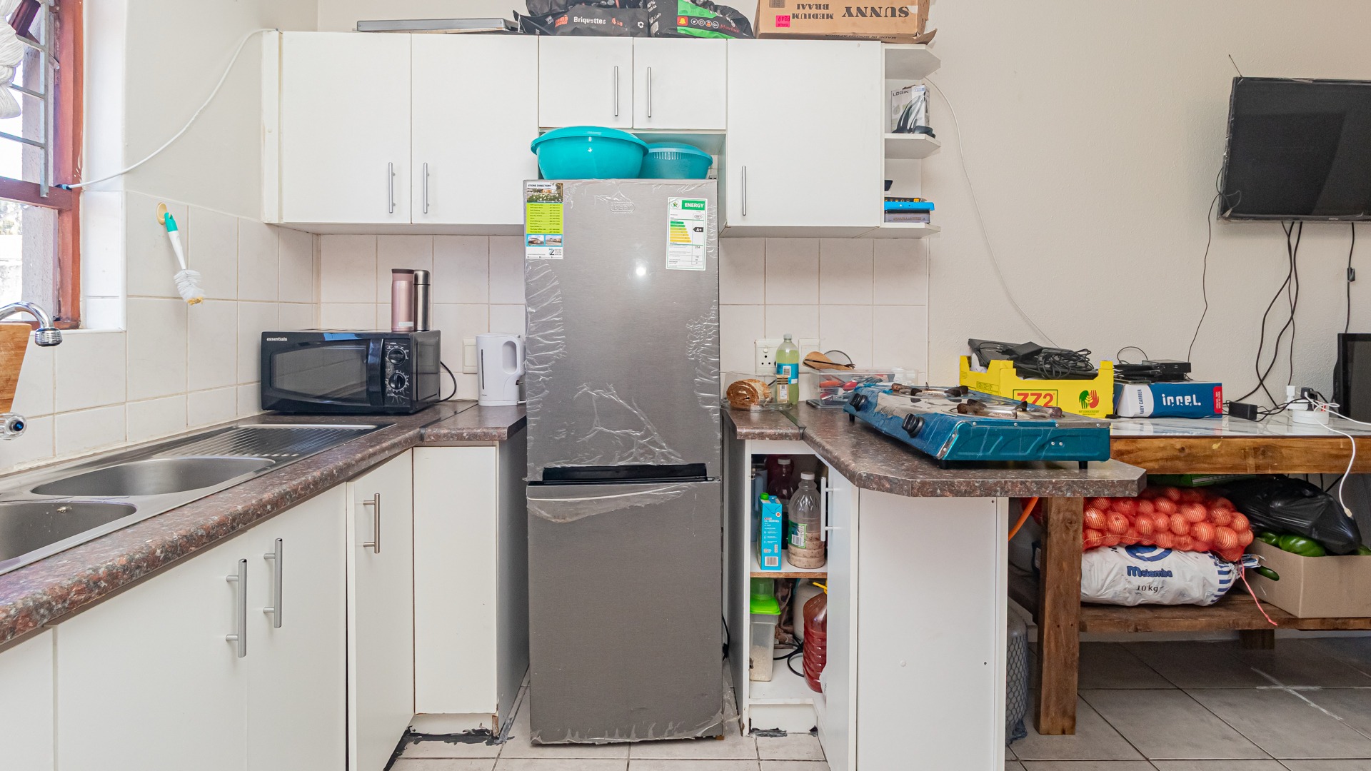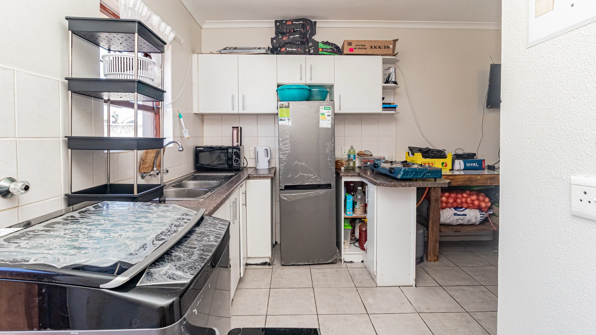 The interior features durable tiled flooring throughout, providing a clean and low-maintenance environment. The functional kitchen is equipped with a double sink, ample white cabinetry, and generous counter space, complemented by a practical tiled backsplash. A new refrigerator is included, and the kitchen seamlessly connects to the lounge, creating an open-plan living area perfect for modern lifestyles.