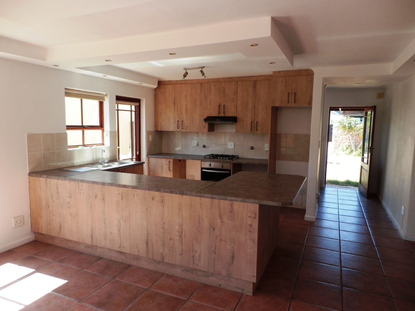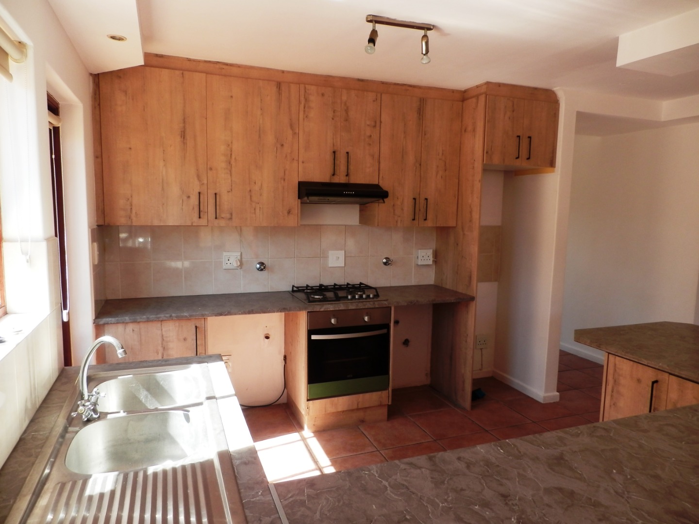 The kitchen is well-equipped with ample built-in cupboards, a gas stove, electric oven, and extractor fan. Additional features include a double sink and plumbed for both a washing machine and dishwasher.
