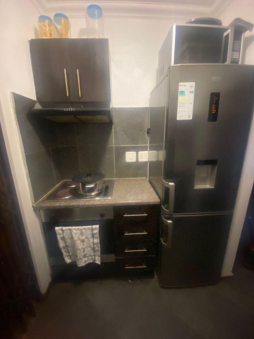 The kitchen has fitted cupboards as well as a built-in stove, oven and n extractor fan.