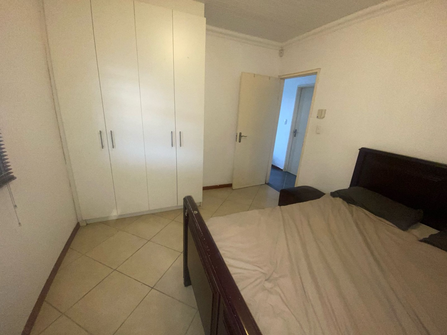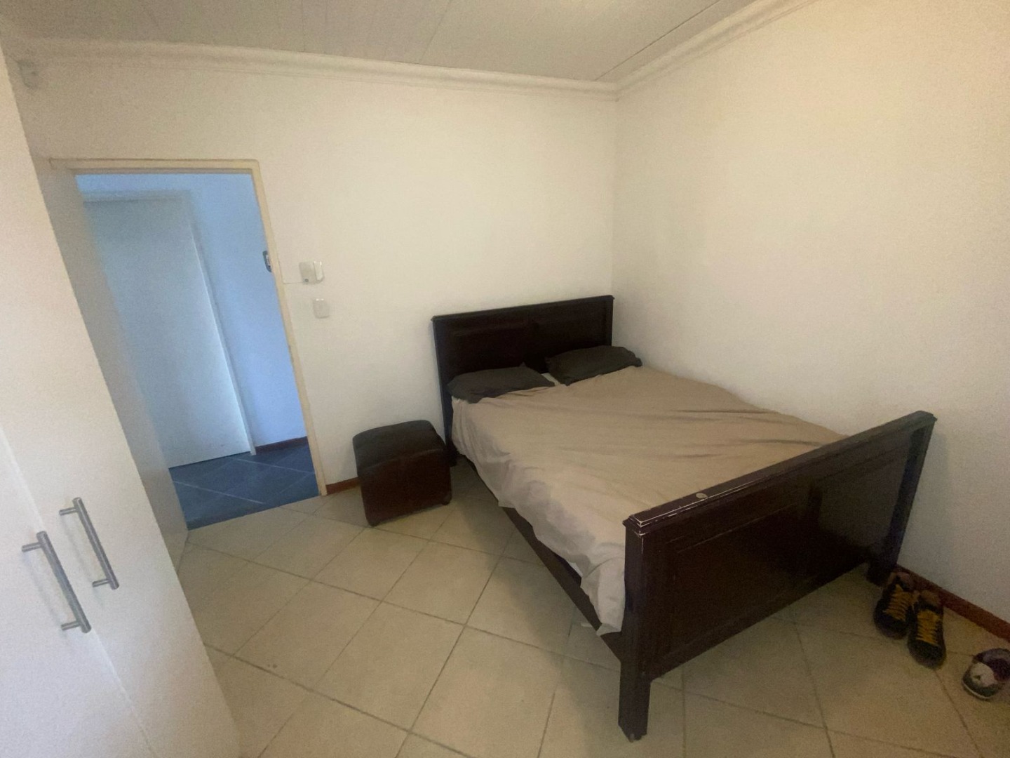 This house has two bedrooms with built in cupboards and the floors are tiled.