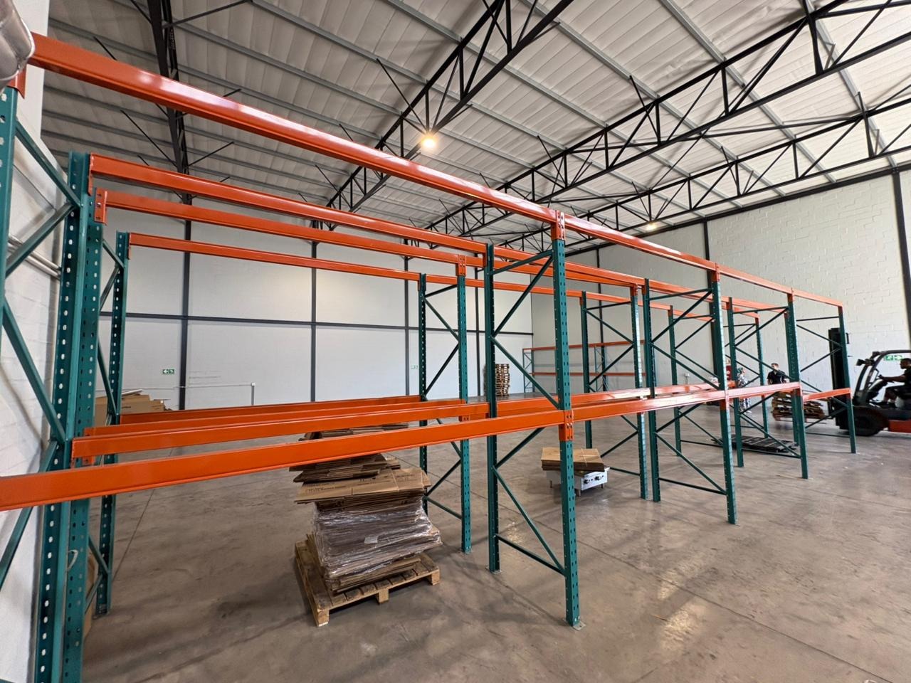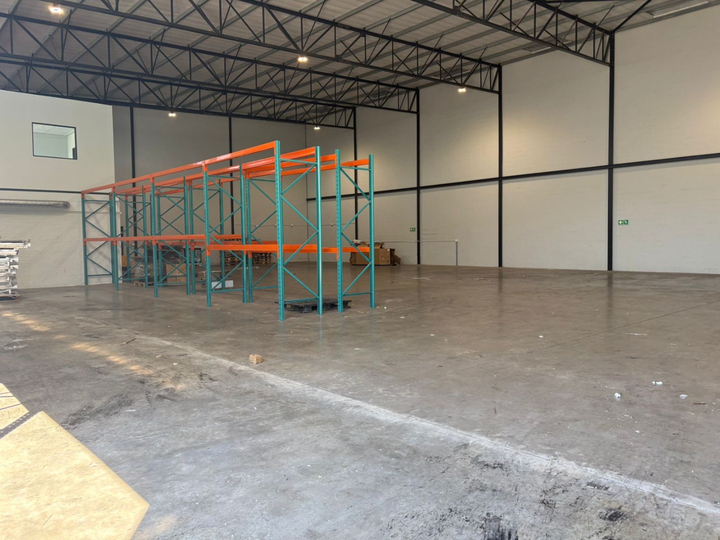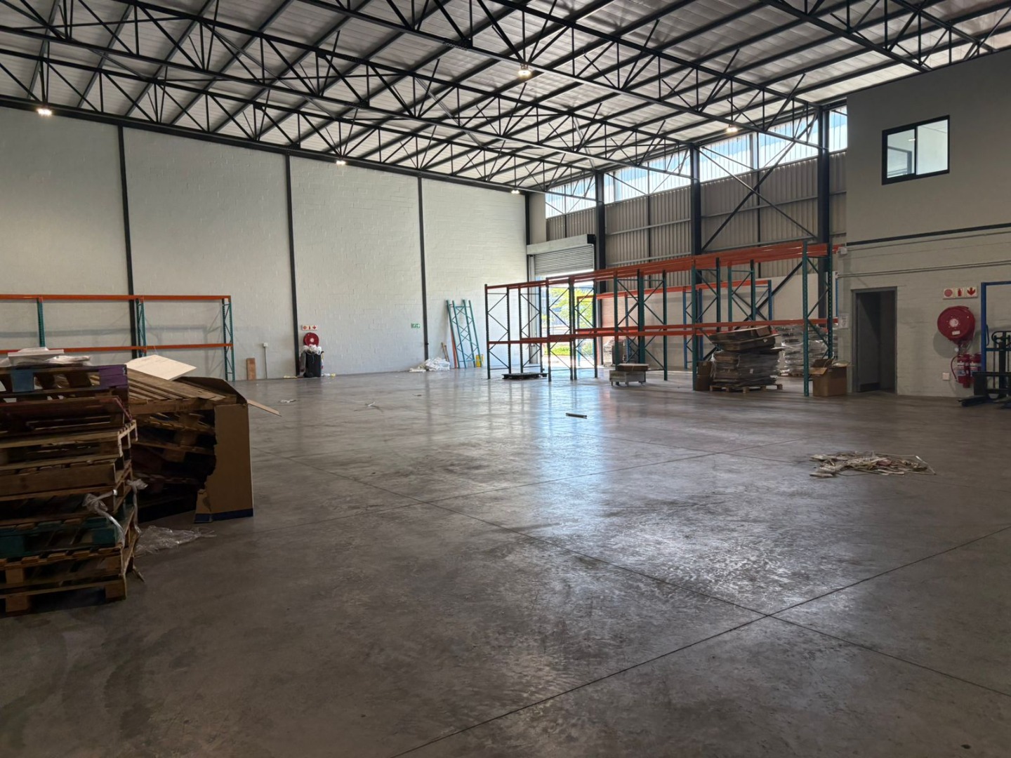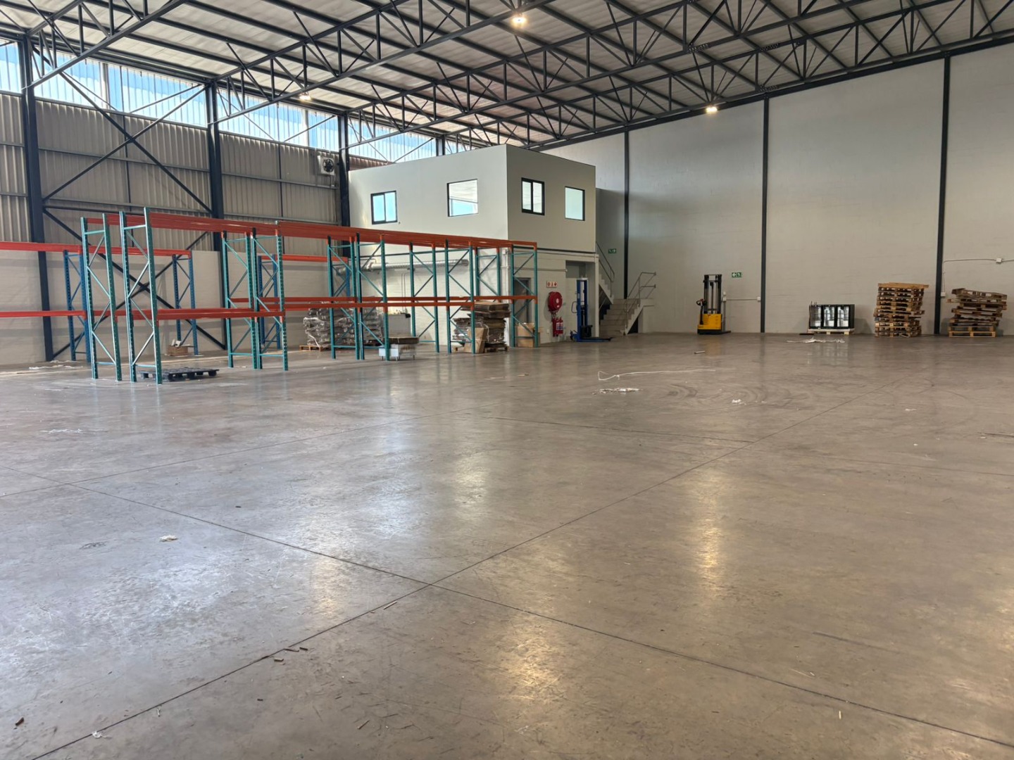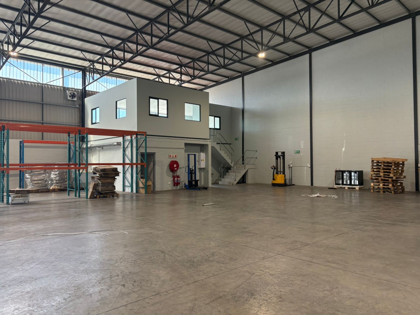 The unit includes an integrated two-story office and mezzanine component, providing dedicated administrative space. The office areas boast modern wood-look flooring, neutral walls, and ample natural light, creating a professional working environment. Existing pallet racking infrastructure is available, offering immediate storage solutions and reducing setup costs for new tenants.