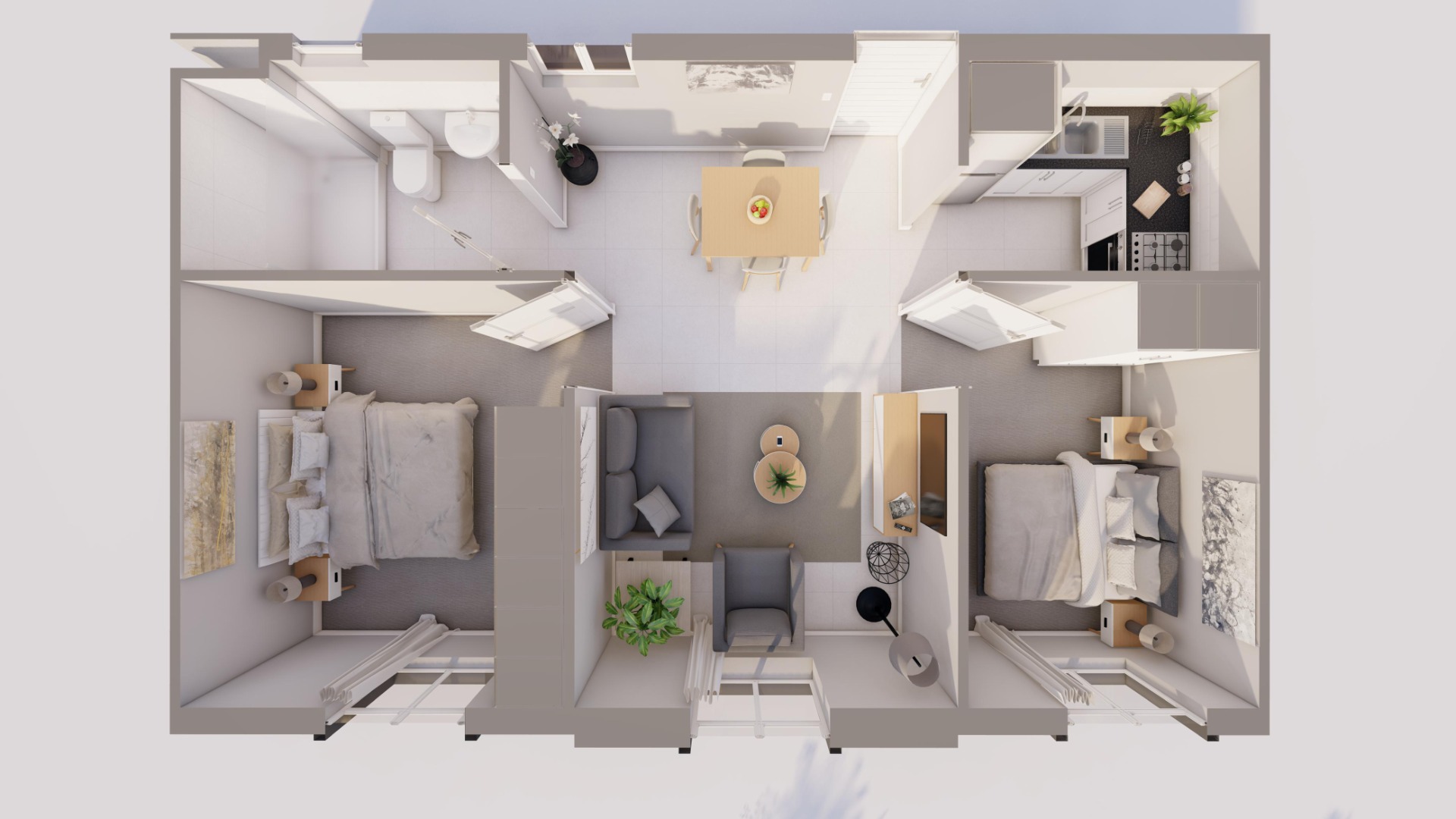 - 2 bedrooms, 1 bathroom | 55m² – 59m²