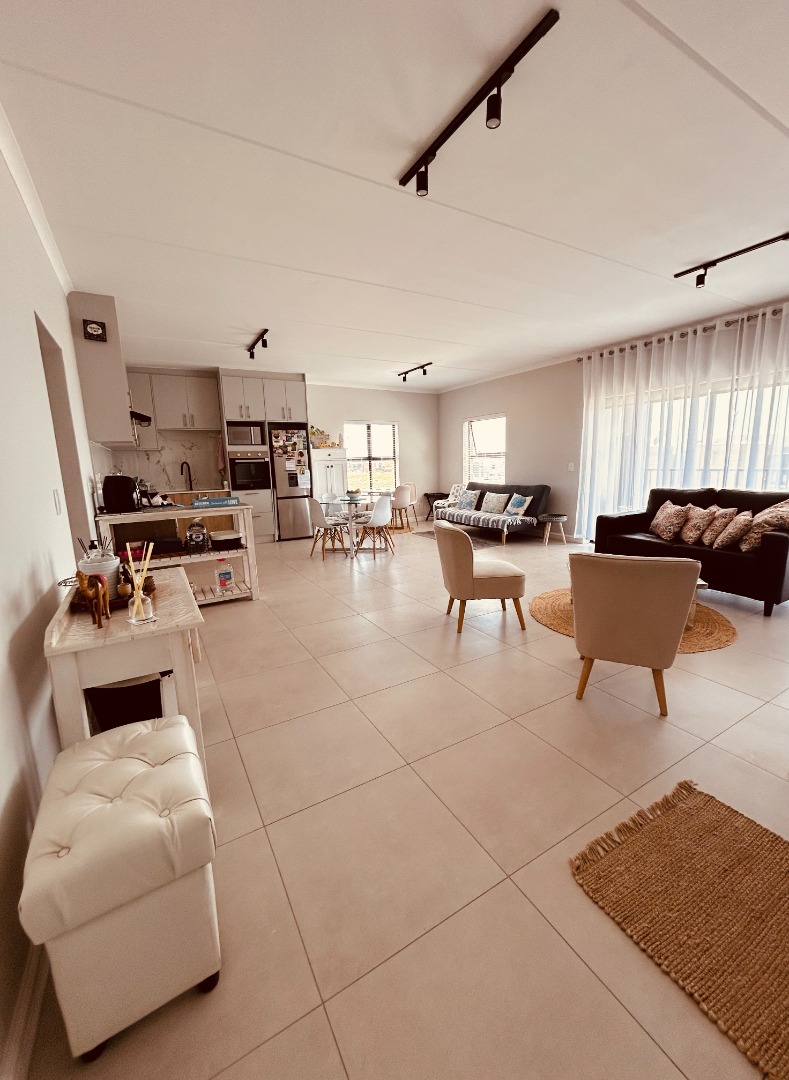 Discover contemporary living in this inviting 115 sqm apartment located in Sandown. The residence boasts a bright, spacious open-plan layout, seamlessly integrating the lounge, dining area, and a modern kitchen. The kitchen features sleek cabinetry, a stylish backsplash, and integrated appliances. Durable tiled flooring and a neutral colour palette flow throughout, complemented by abundant natural light and modern track lighting.