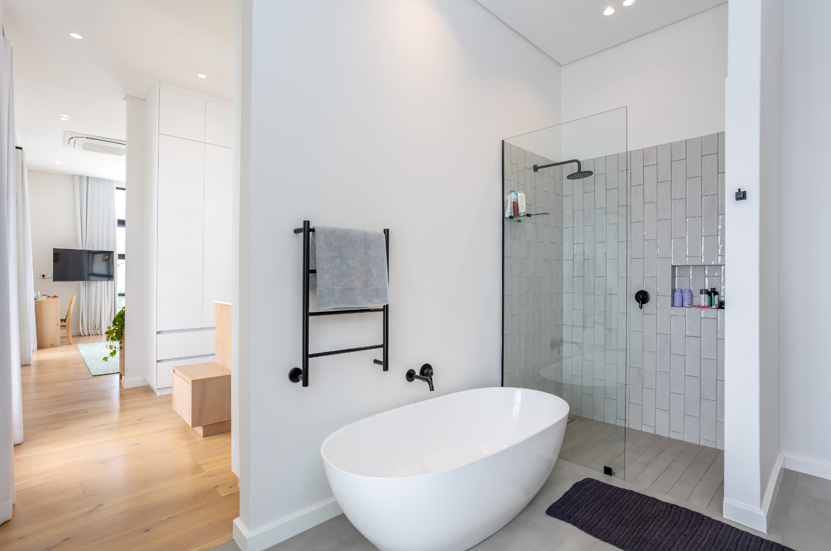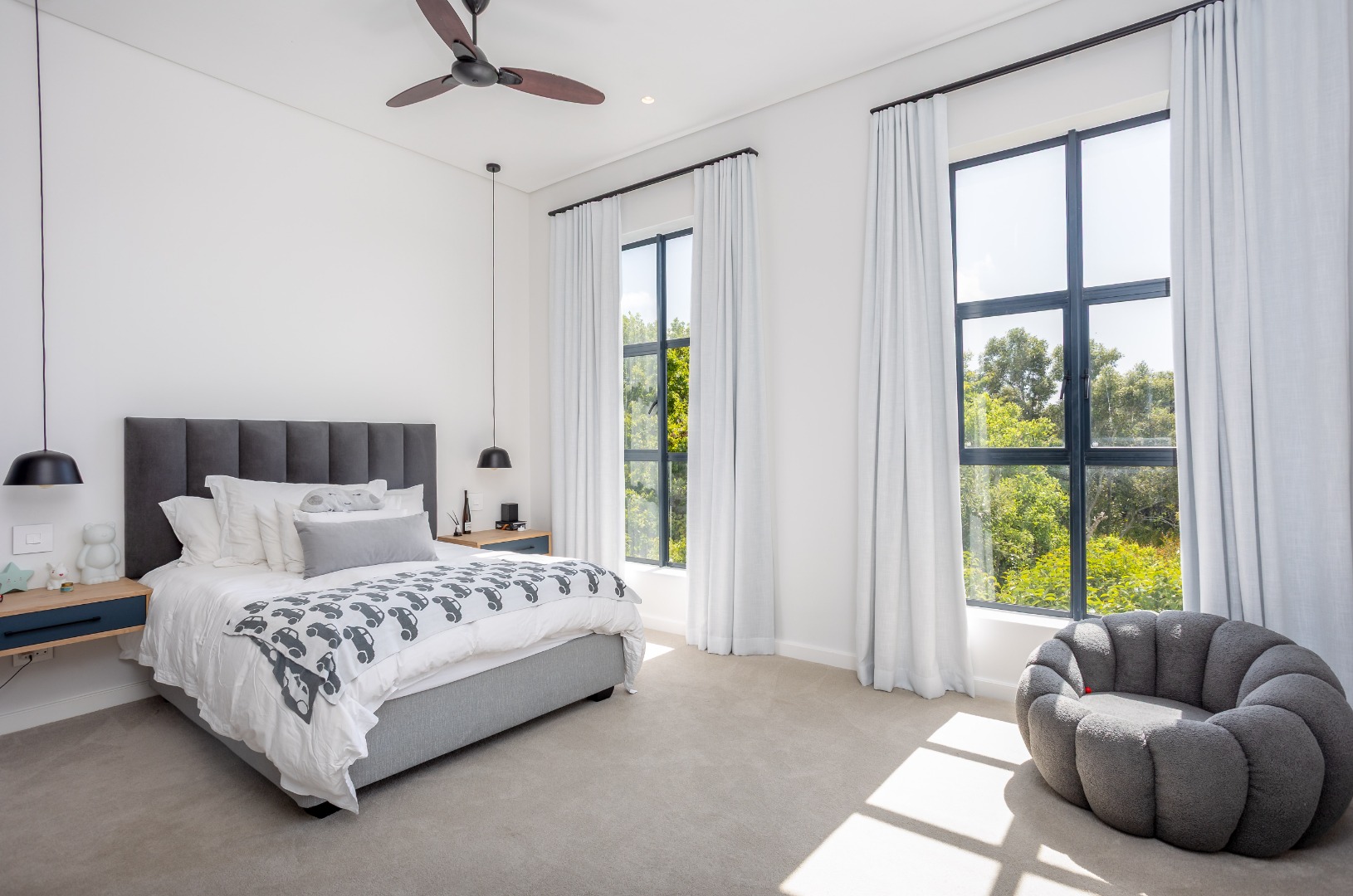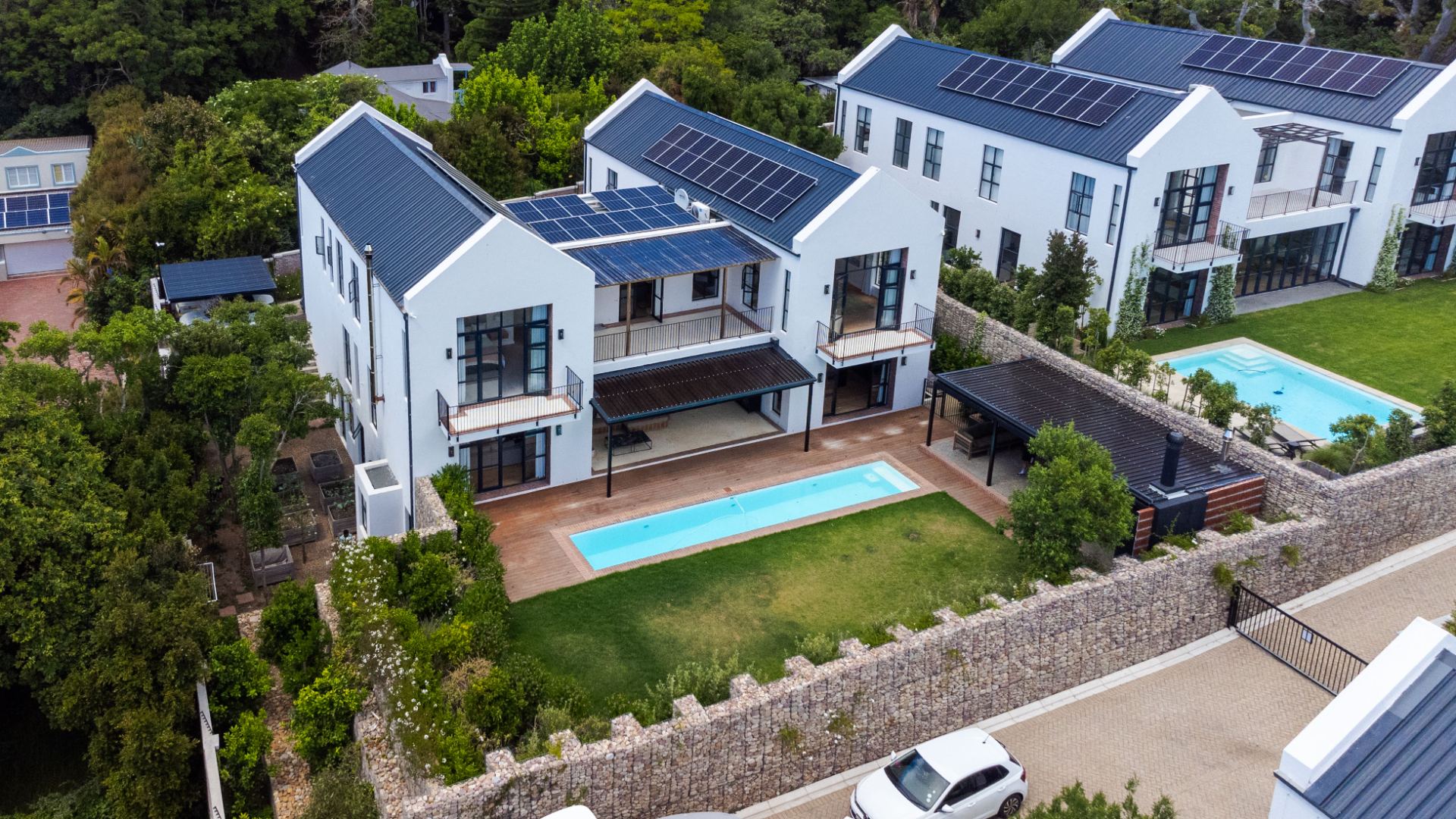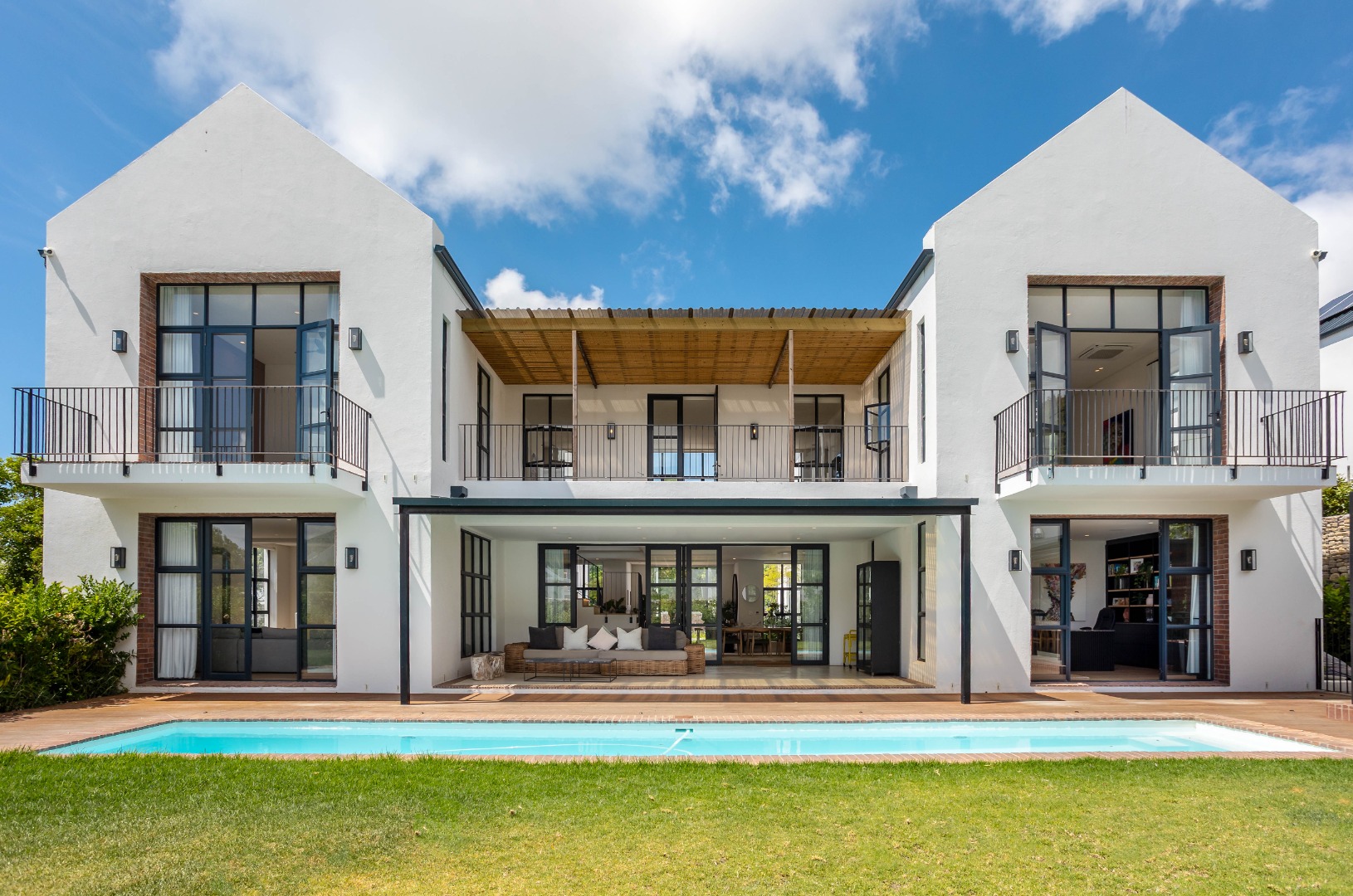 Discover an architectural masterpiece nestled within a prestigious security estate in Constantia, Cape Town. This contemporary residence, spanning an impressive 697 sqm, captivates with its striking modern aesthetic, defined by clean lines, a pristine white facade, and sophisticated dark accents. The design seamlessly integrates expansive glass elements and multiple balconies, inviting abundant natural light and offering a visual symphony of indoor-outdoor living.