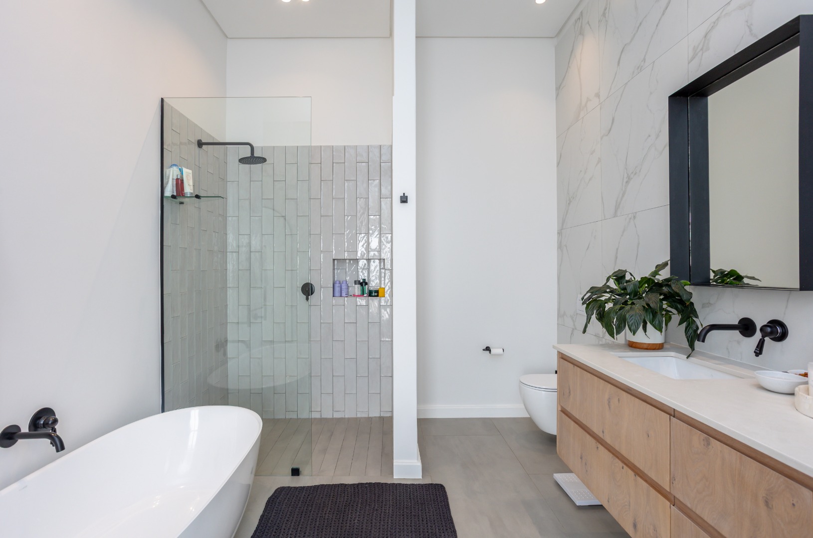 Discover an architectural masterpiece nestled within a prestigious security estate in Constantia, Cape Town. This contemporary residence, spanning an impressive 697 sqm, captivates with its striking modern aesthetic, defined by clean lines, a pristine white facade, and sophisticated dark accents. The design seamlessly integrates expansive glass elements and multiple balconies, inviting abundant natural light and offering a visual symphony of indoor-outdoor living.