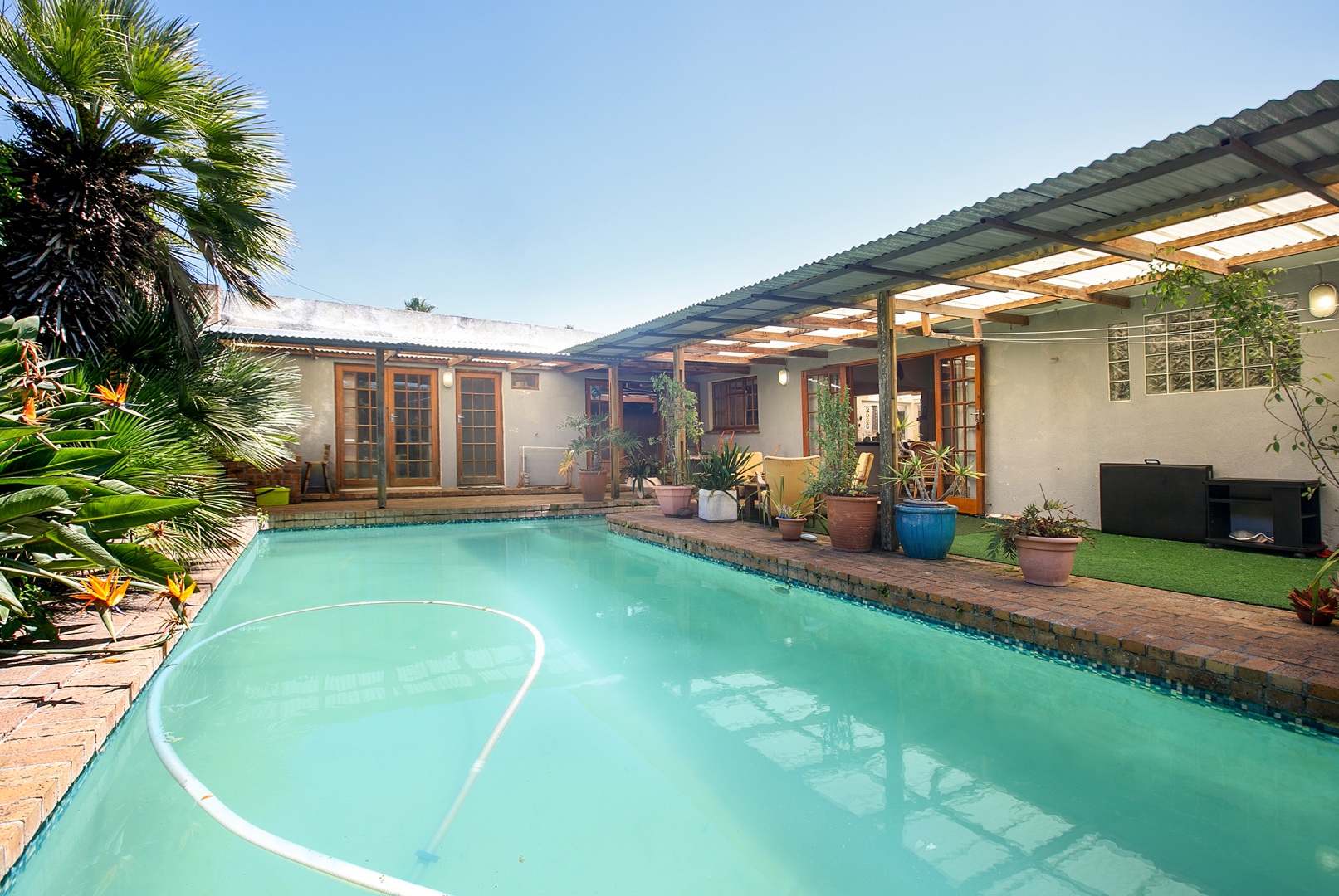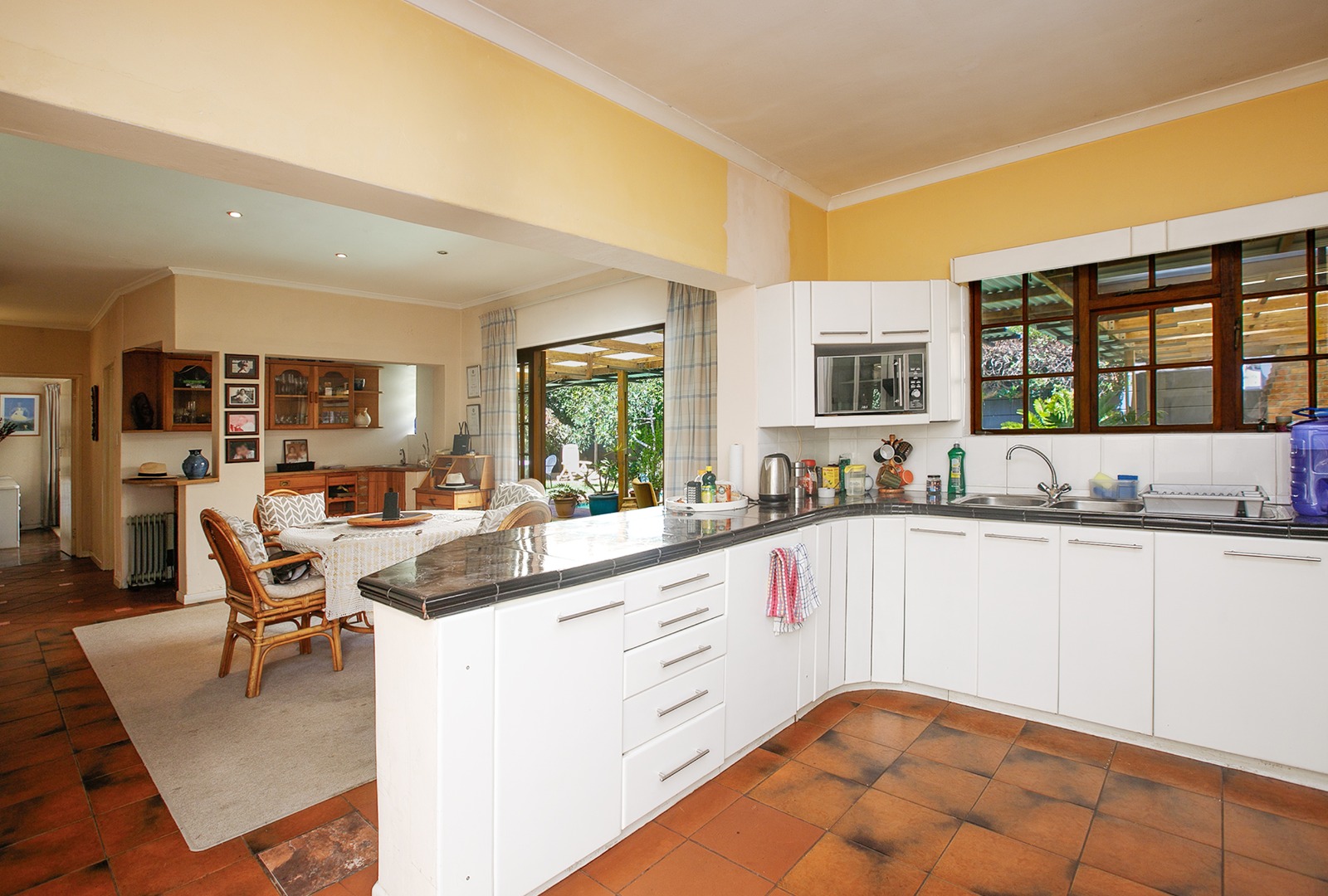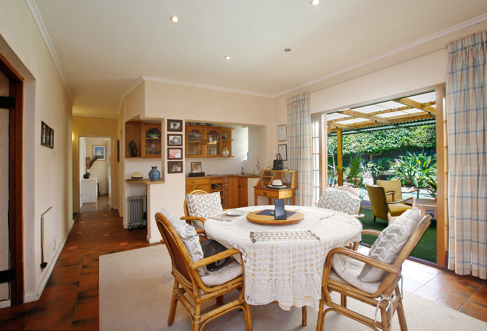 The kitchen is spacious and functional, offering generous counter space and white cabinetry. It is fitted with an eye-level oven and stove, making it practical for everyday cooking. The kitchen connects easily to the dining room, which forms a central part of the home. From the dining room, doors lead directly out to the pool area, creating a convenient flow between indoor and outdoor living.