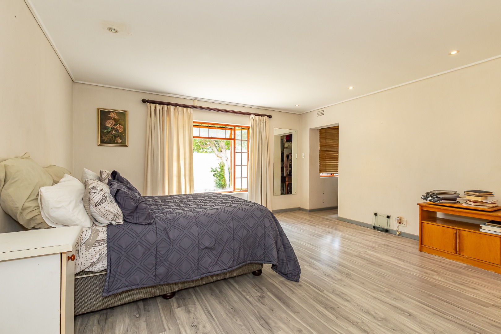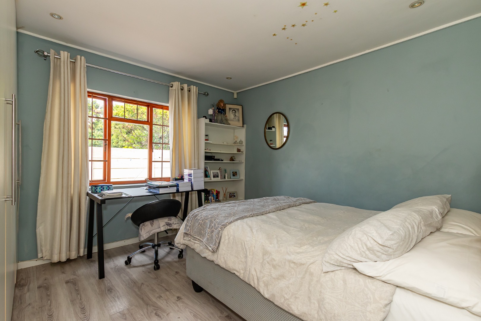 The main bedroom is generously sized with a walk-in closet and an oversized bathroom featuring a bath and shower. Three additional bedrooms include built-in cupboards, while a central study area opens onto the back garden.