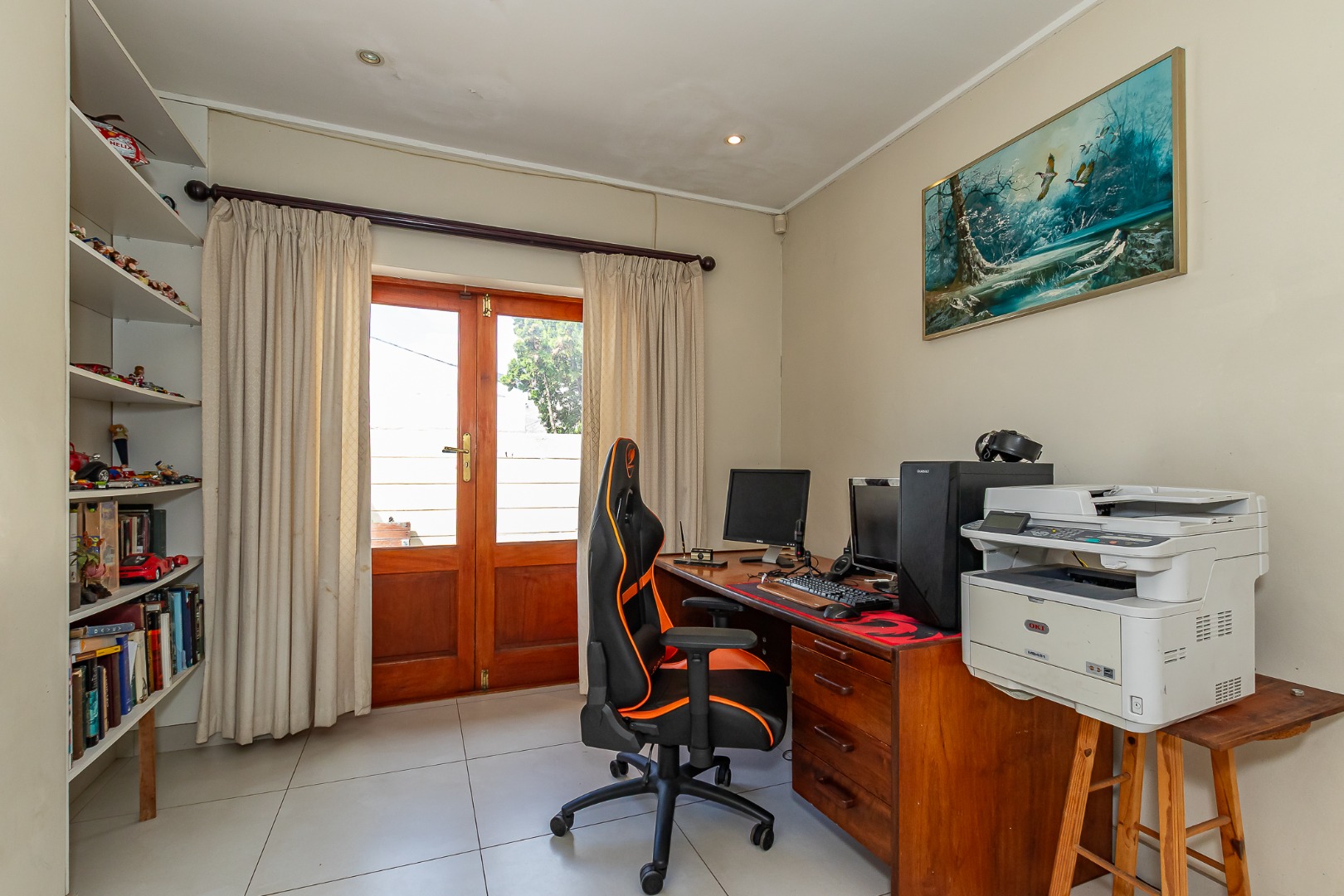 The main bedroom is generously sized with a walk-in closet and an oversized bathroom featuring a bath and shower. Three additional bedrooms include built-in cupboards, while a central study area opens onto the back garden.