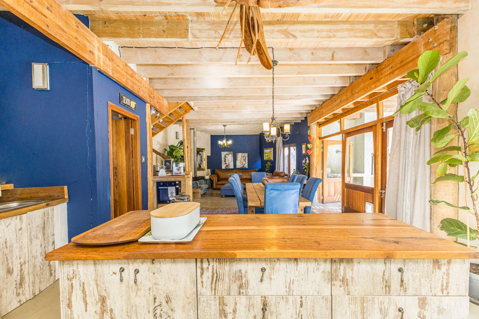 Step inside to an expansive open-plan living and dining area, where high ceilings and exposed wooden beams create an airy, spacious atmosphere. Natural light floods through large glass doors, highlighting the eclectic style and craftsmanship. A cozy wood-burning stove adds character and comfort, perfect for cooler evenings.
