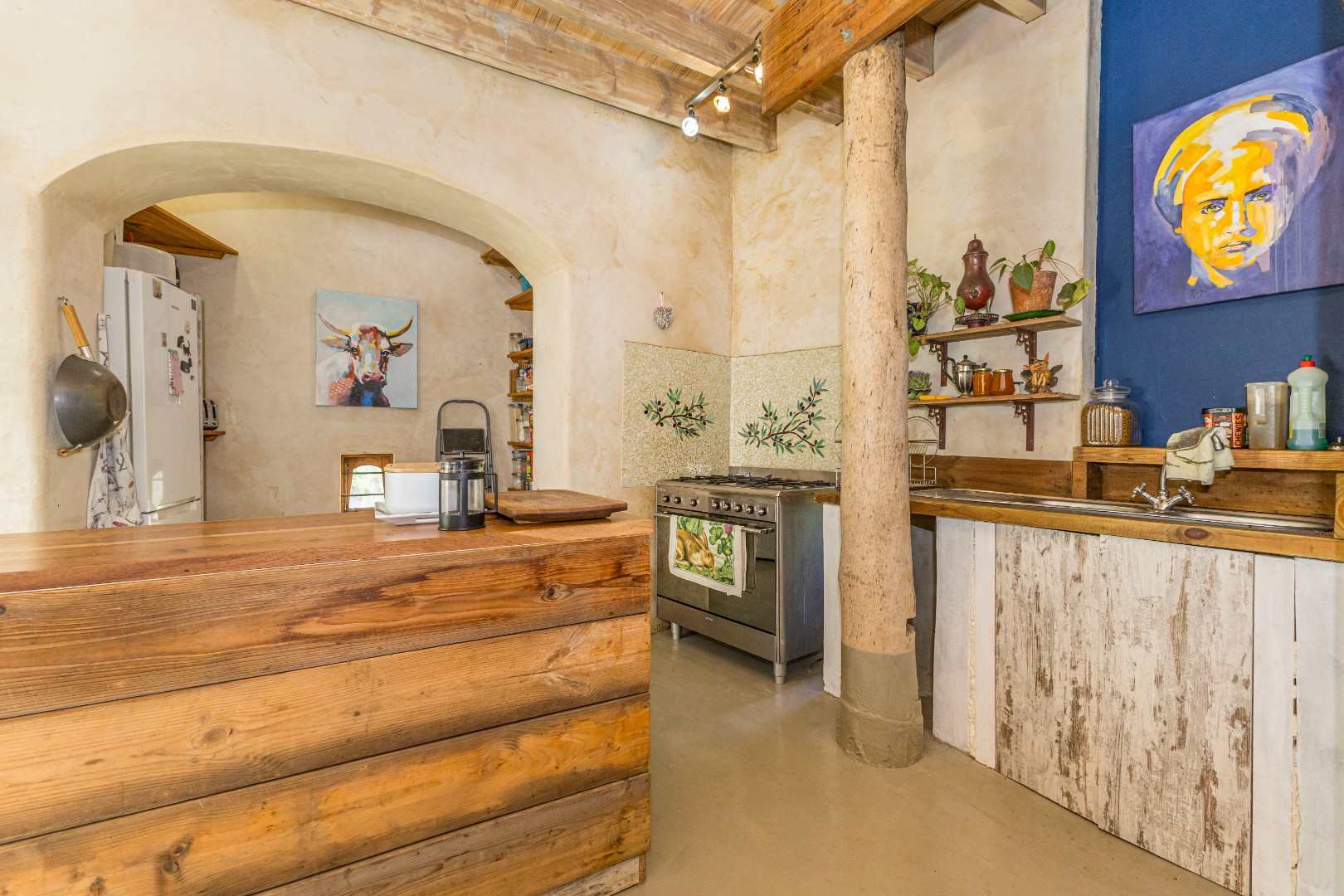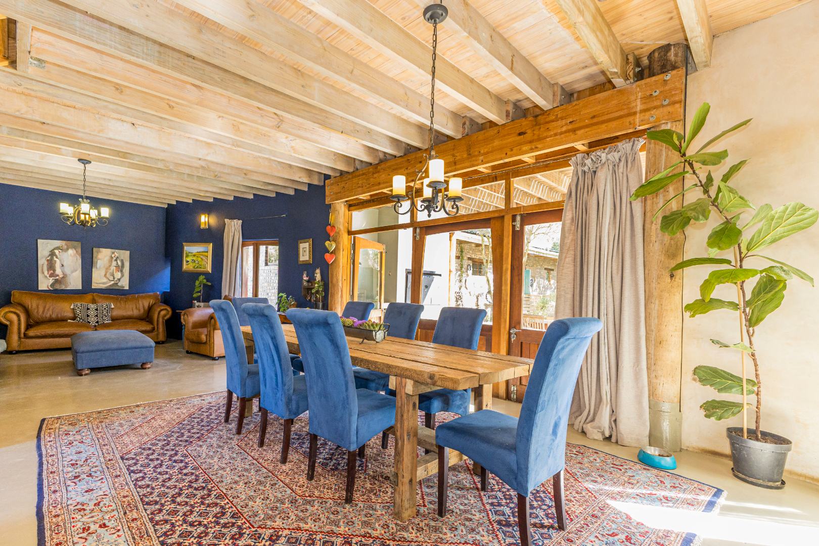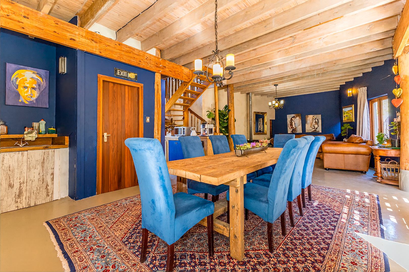 Step inside to an expansive open-plan living and dining area, where high ceilings and exposed wooden beams create an airy, spacious atmosphere. Natural light floods through large glass doors, highlighting the eclectic style and craftsmanship. A cozy wood-burning stove adds character and comfort, perfect for cooler evenings.