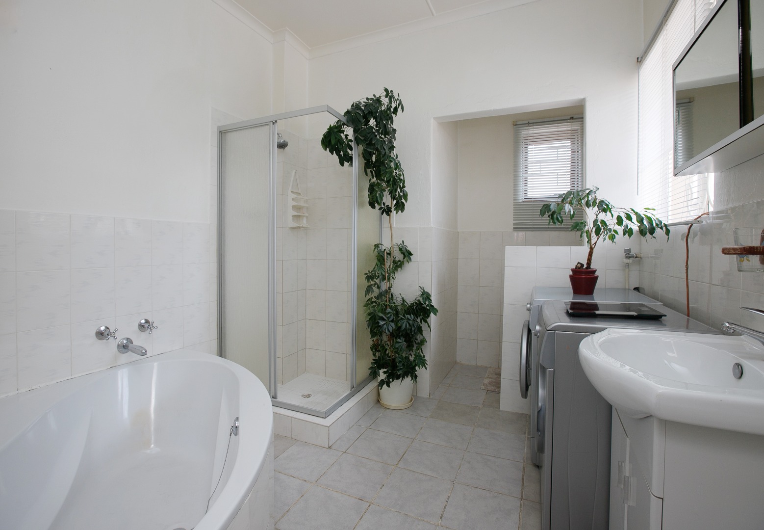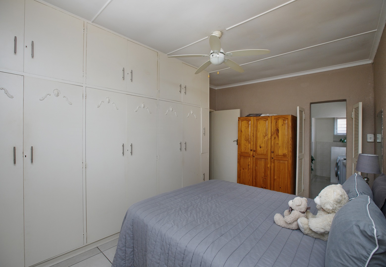 The main bedroom is a standout, offering ample cupboard space and a large en-suite bathroom complete with a bath, shower, and space for a washing machine and dryer.