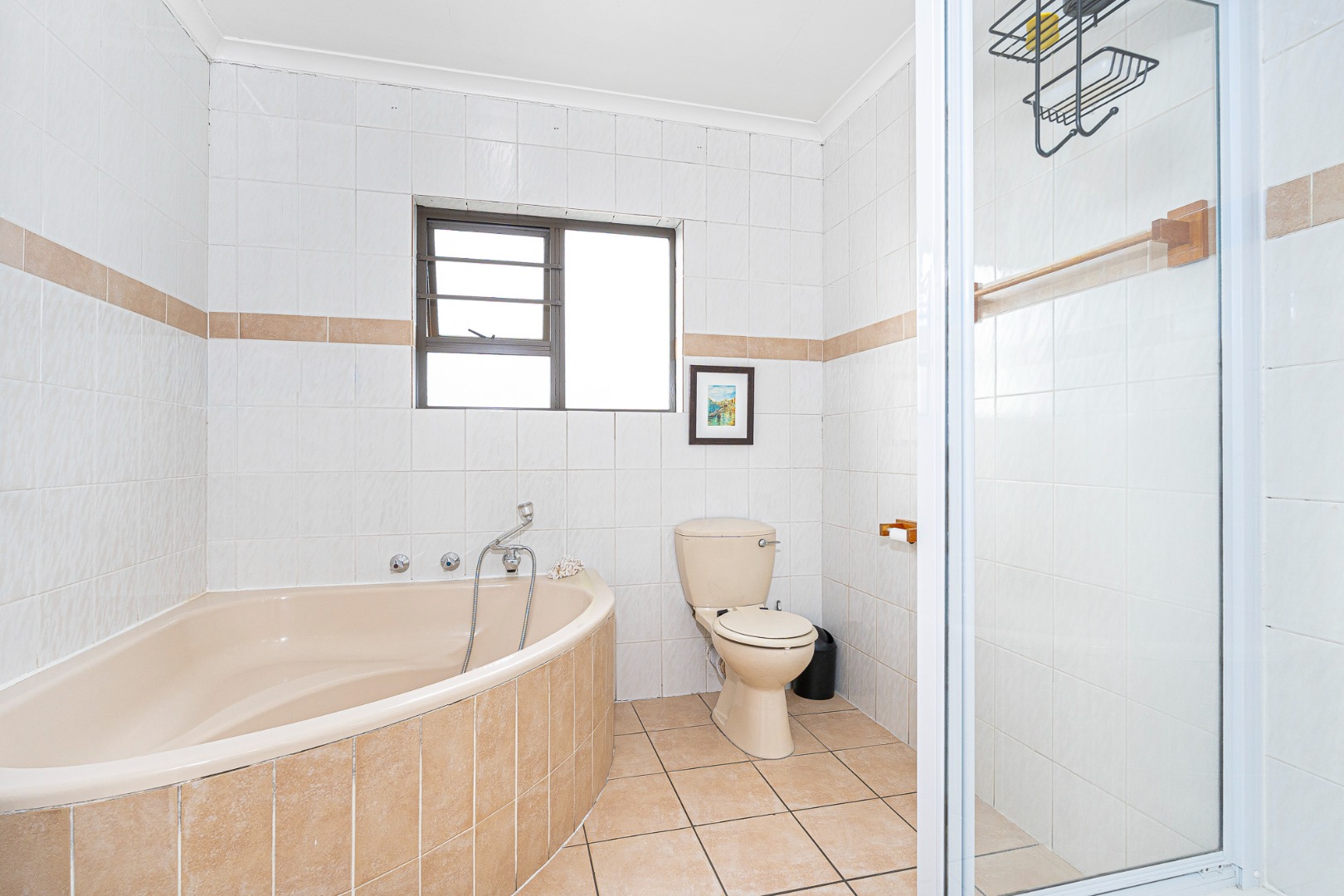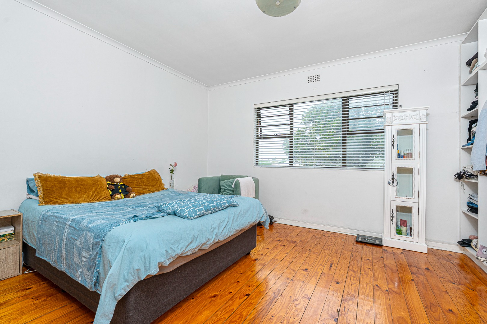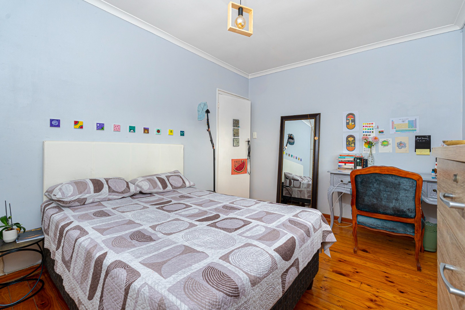 3 double size bedrooms, all fitted with built in cupboards, blinds, wooden floors and beautiful high ceilings and lovely view of the mountain. The main bedroom is en suite fitted with a shower and the spacious family bathroom offers a corner bath and a separate shower.