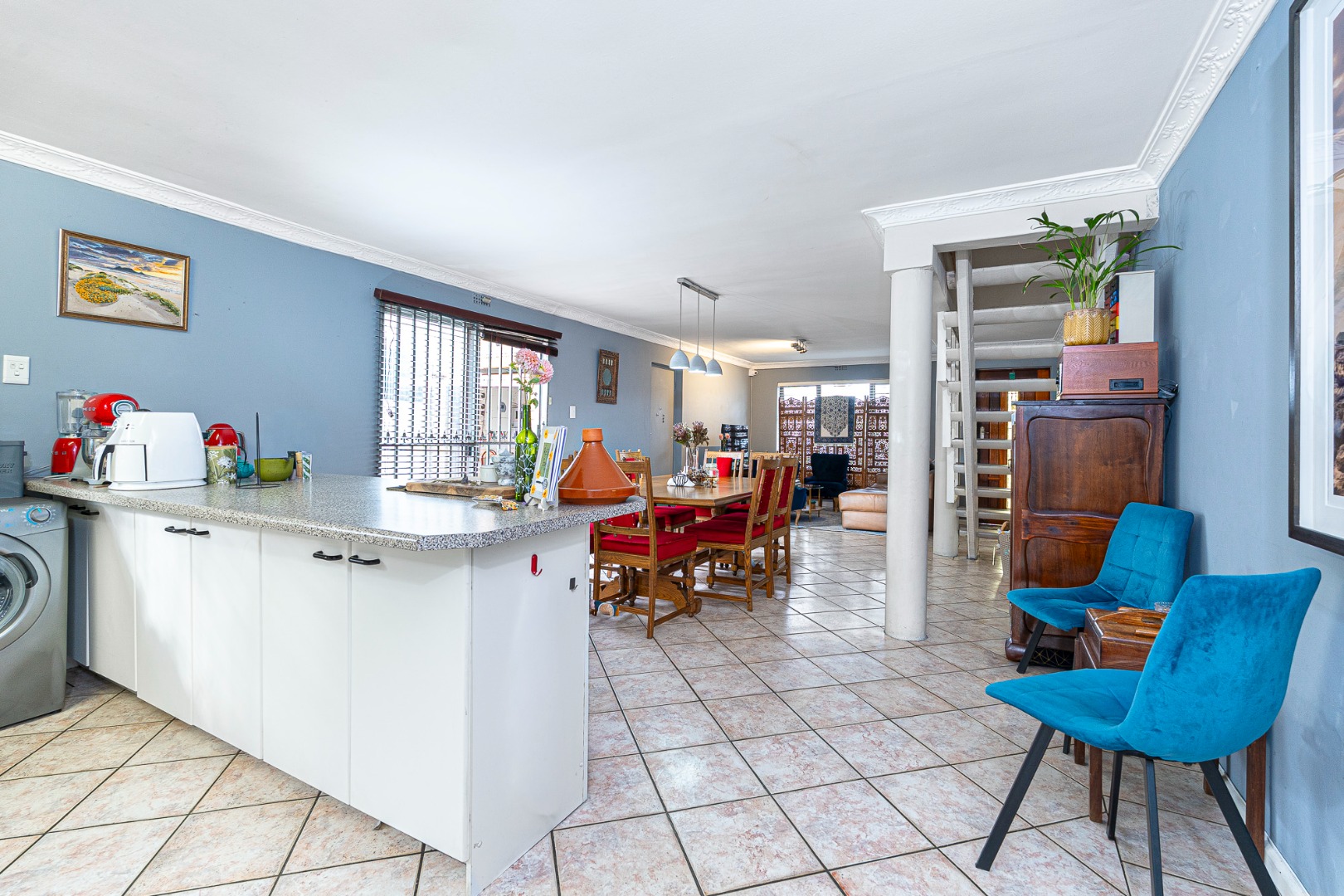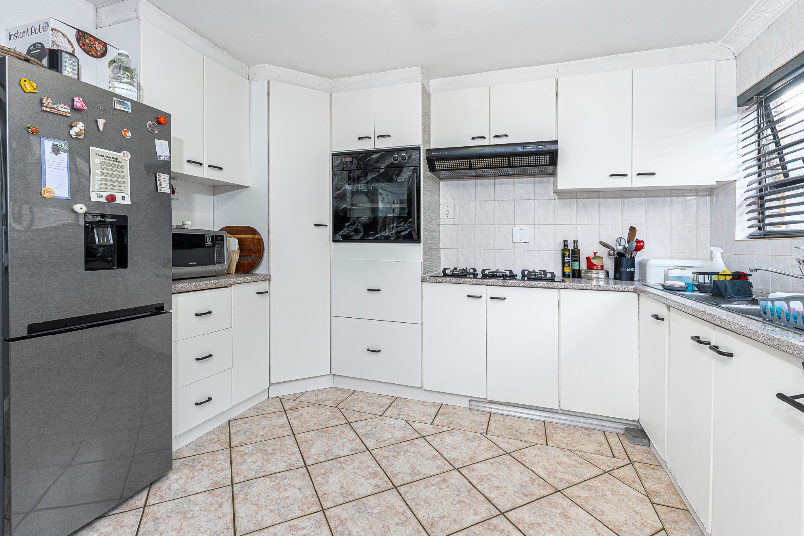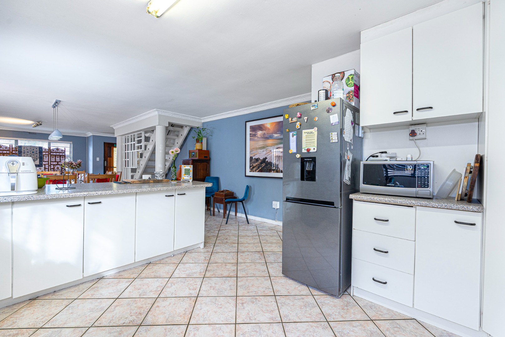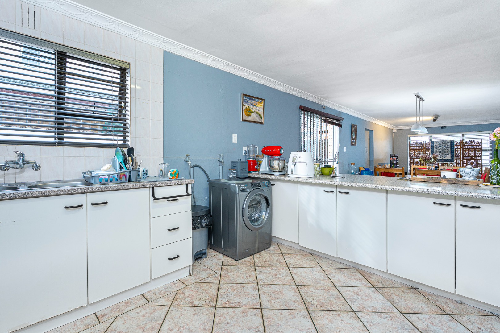 The open plan flow from lounge,dining area to the fully fitted spacious kitchen boasts a light and airy space.Its tiled throughout. The kitchen is fully fitted with breakfast counter, fitted eyelevel oven, extractor fan,plumbing for 2 appliances and gas hob. There's also space for a double door fridge. Large pantry and a 6 seater breakfast nook. Easy access via sliding doors to the garden and neatly paved yard,garden and garage.