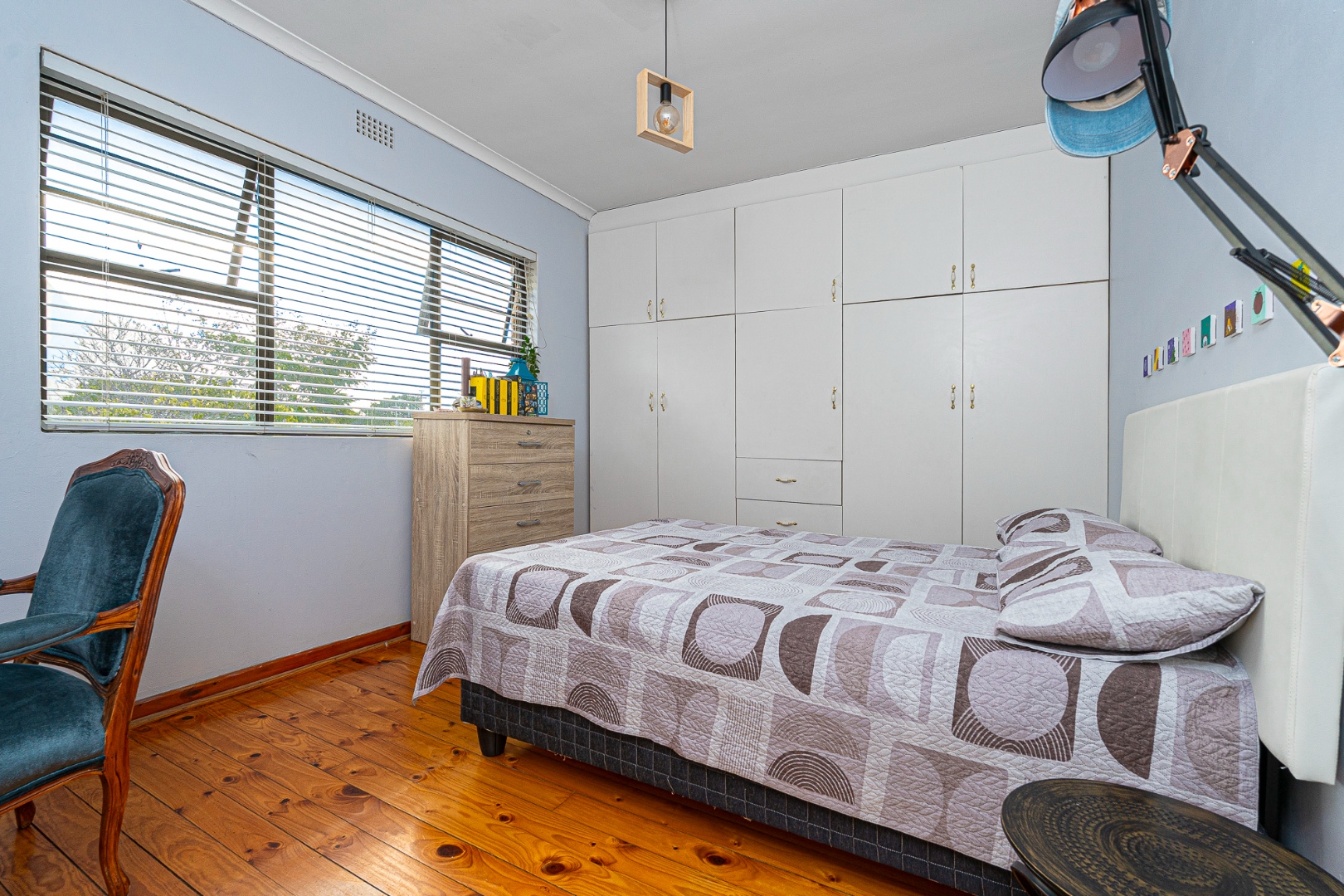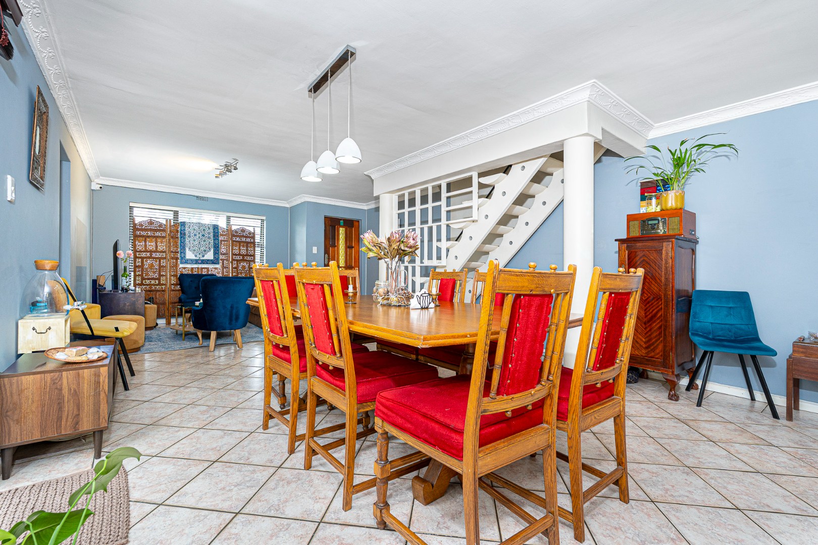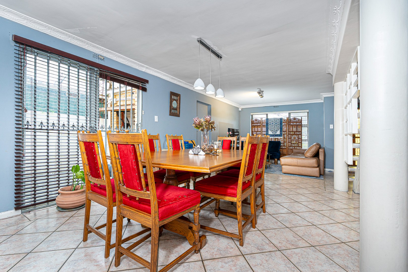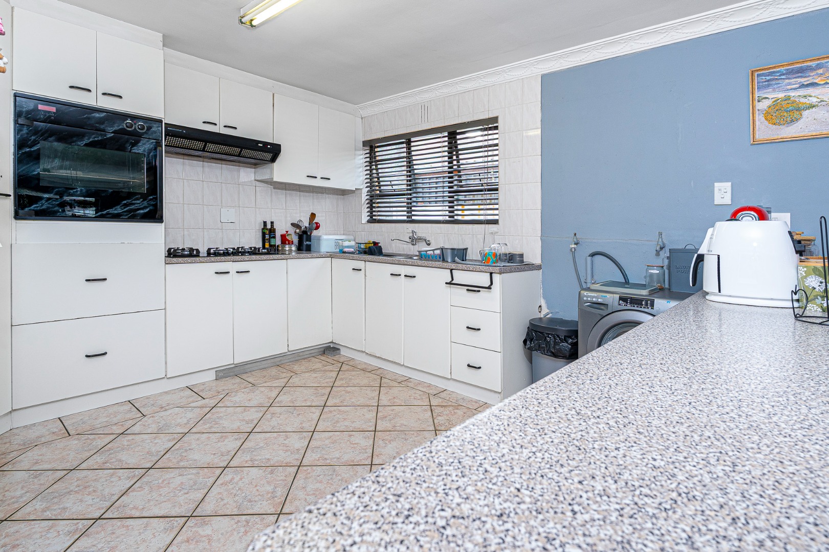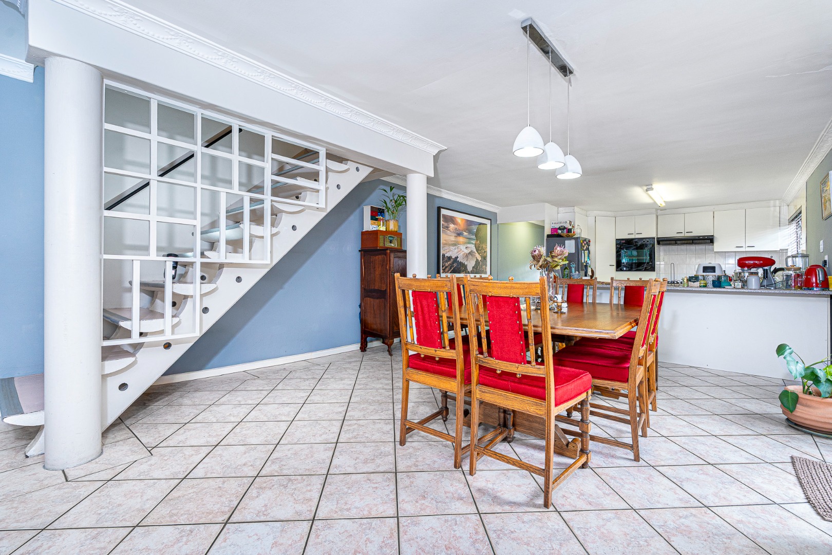 The open plan flow from lounge,dining area to the fully fitted spacious kitchen boasts a light and airy space.Its tiled throughout. The kitchen is fully fitted with breakfast counter, fitted eyelevel oven, extractor fan,plumbing for 2 appliances and gas hob. There's also space for a double door fridge. Large pantry and a 6 seater breakfast nook. Easy access via sliding doors to the garden and neatly paved yard,garden and garage.