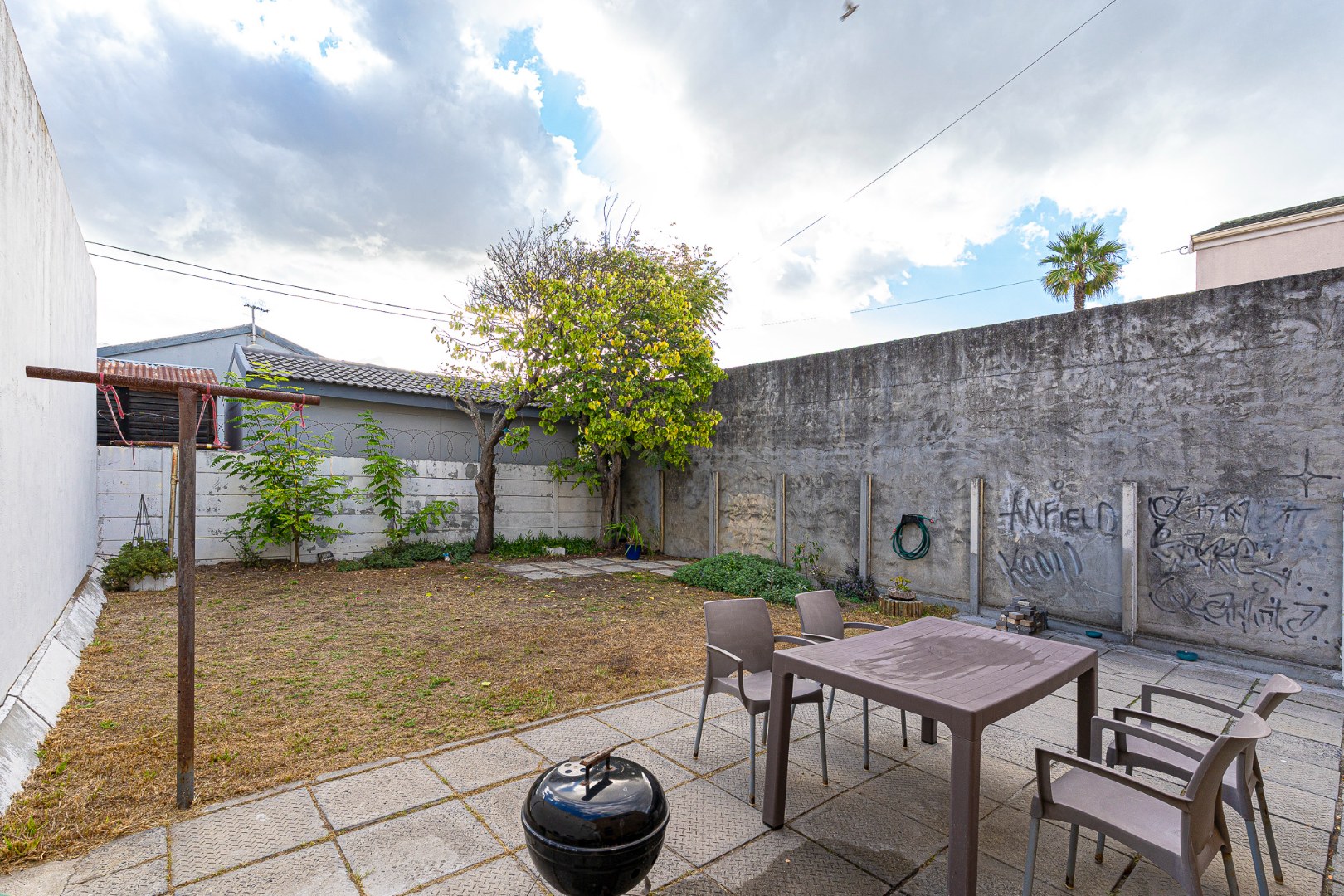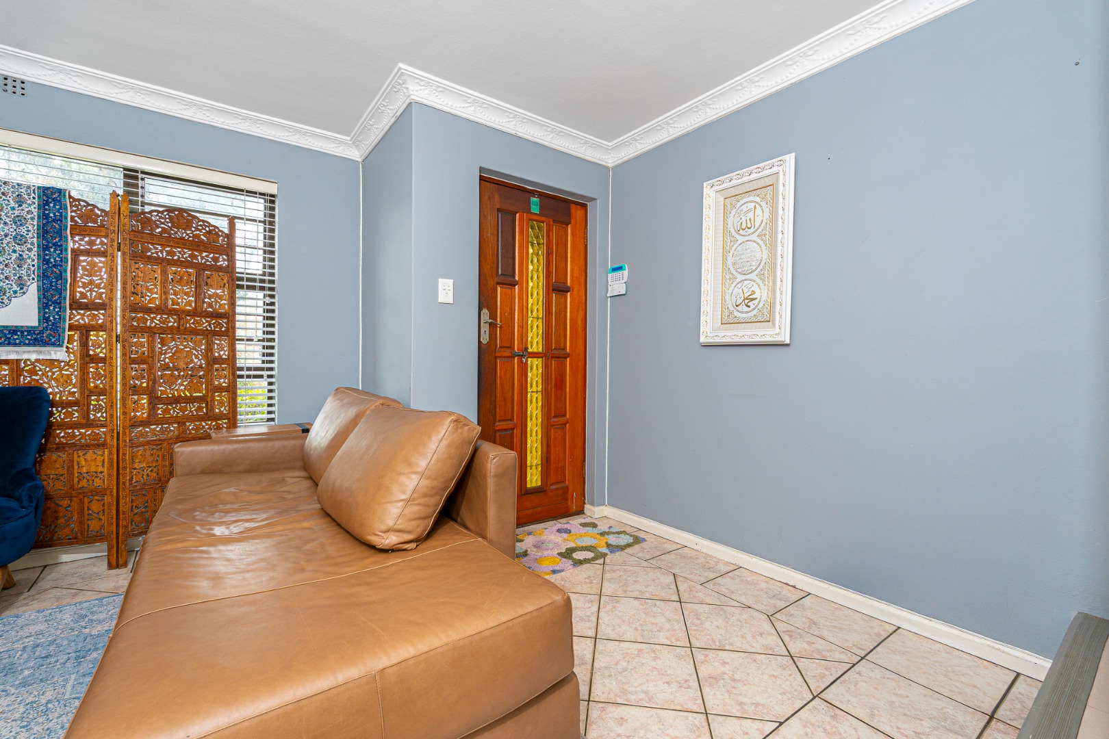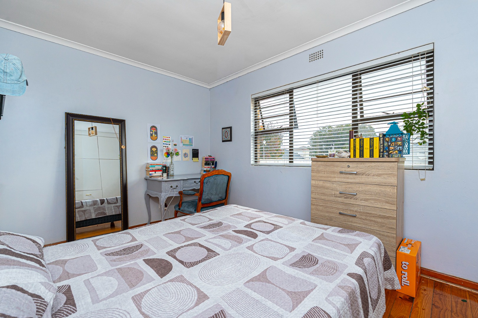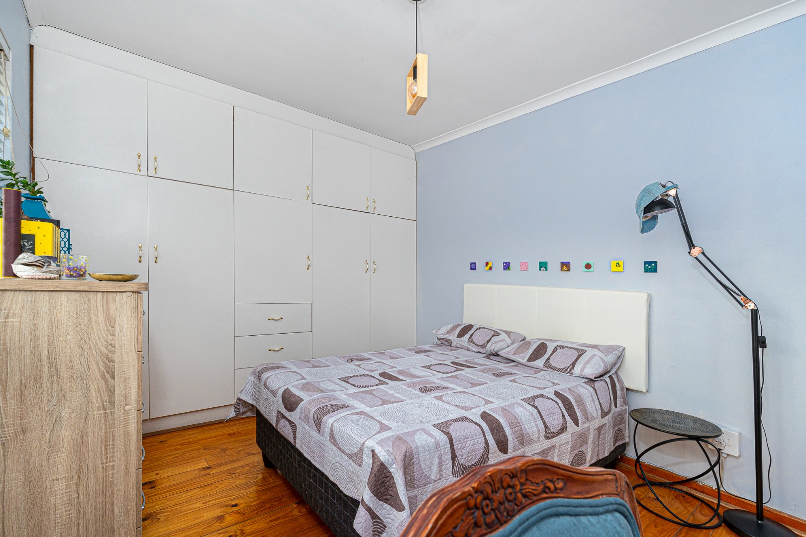 The open plan flow from lounge,dining area to the fully fitted spacious kitchen boasts a light and airy space.Its tiled throughout. The kitchen is fully fitted with breakfast counter, fitted eyelevel oven, extractor fan,plumbing for 2 appliances and gas hob. There's also space for a double door fridge. Large pantry and a 6 seater breakfast nook. Easy access via sliding doors to the garden and neatly paved yard,garden and garage.