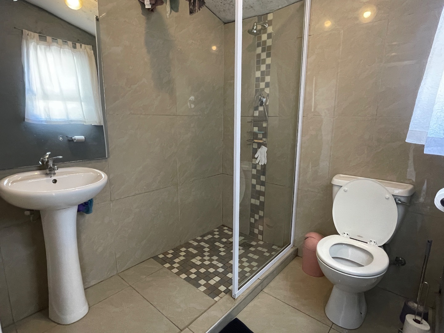 The home offers tiles throughout, a basic kitchen with fitted cupboards and a freestanding stove, and a bathroom with a modern walk-in shower. The bedroom is well-sized, creating a comfortable and practical living space.