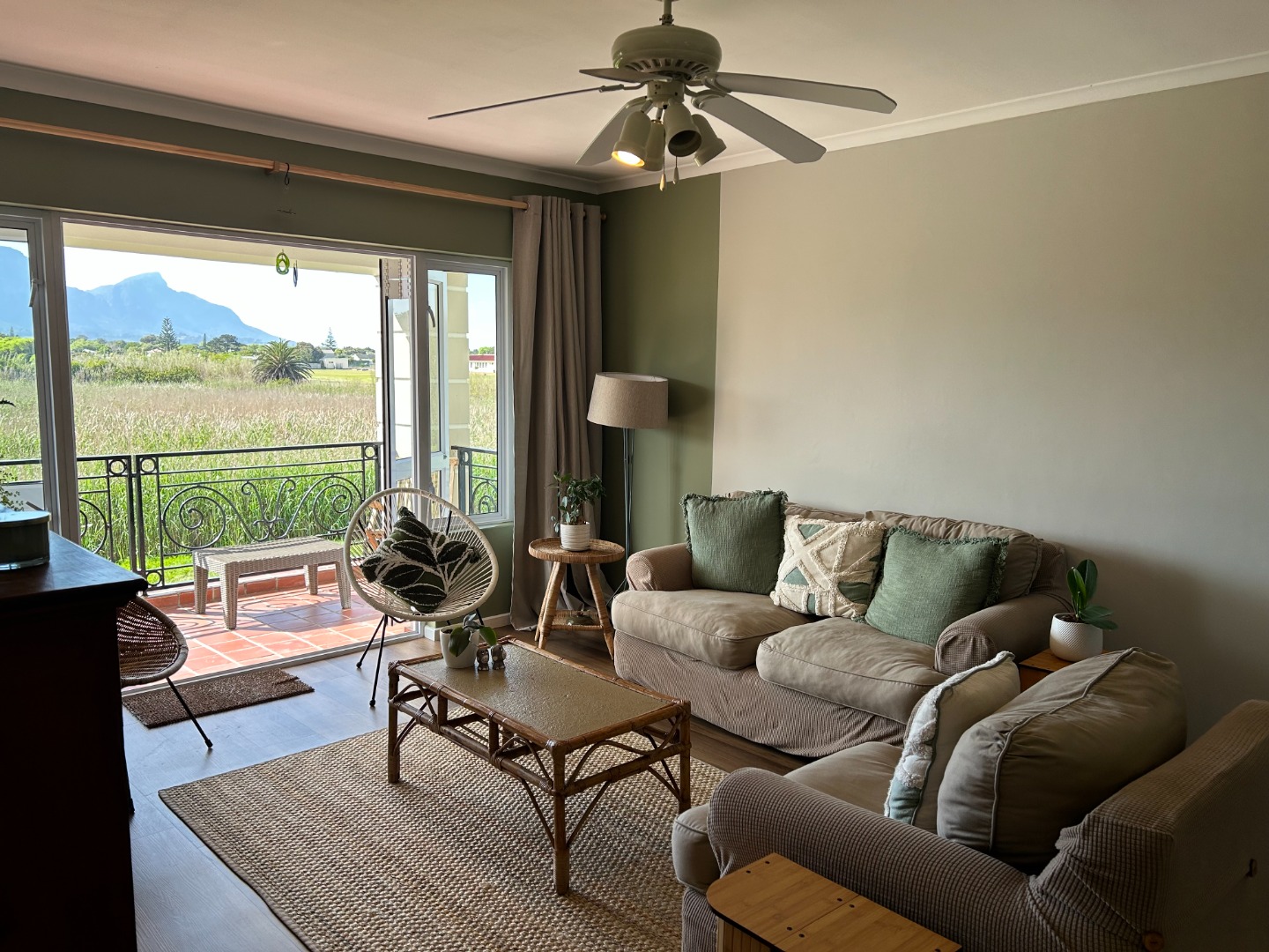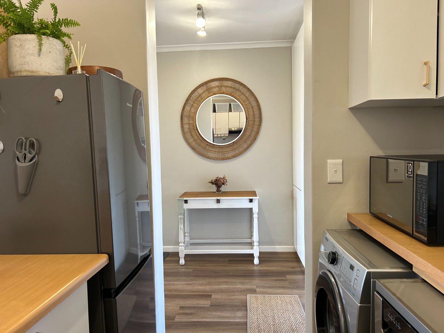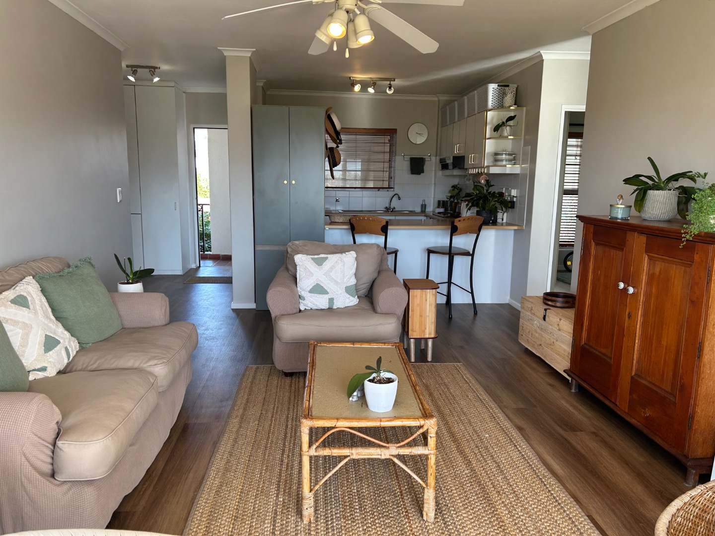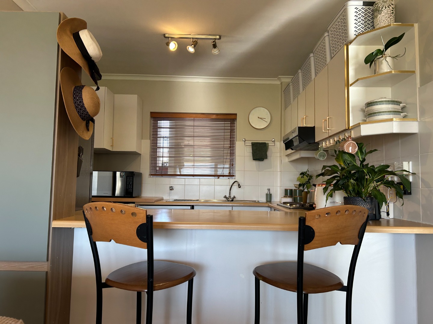 This distinguished residence, nestled within a secure, gated complex in Tokai, Cape Town, presents an inviting exterior with a white security gate and modern entrance. The interior immediately impresses with a bright, open-plan living area, featuring expansive windows and glass double doors that capture breathtaking panoramic views of mountains and natural landscapes. Modern vinyl flooring and a ceiling fans enhance comfort, with direct balcony access. The functional kitchen is meticulously appointed with light wood-look countertops, white cabinetry, and modern stainless steel appliances, including an integrated oven, stovetop, and double sink, plumbed for washing machine and dishwasher.