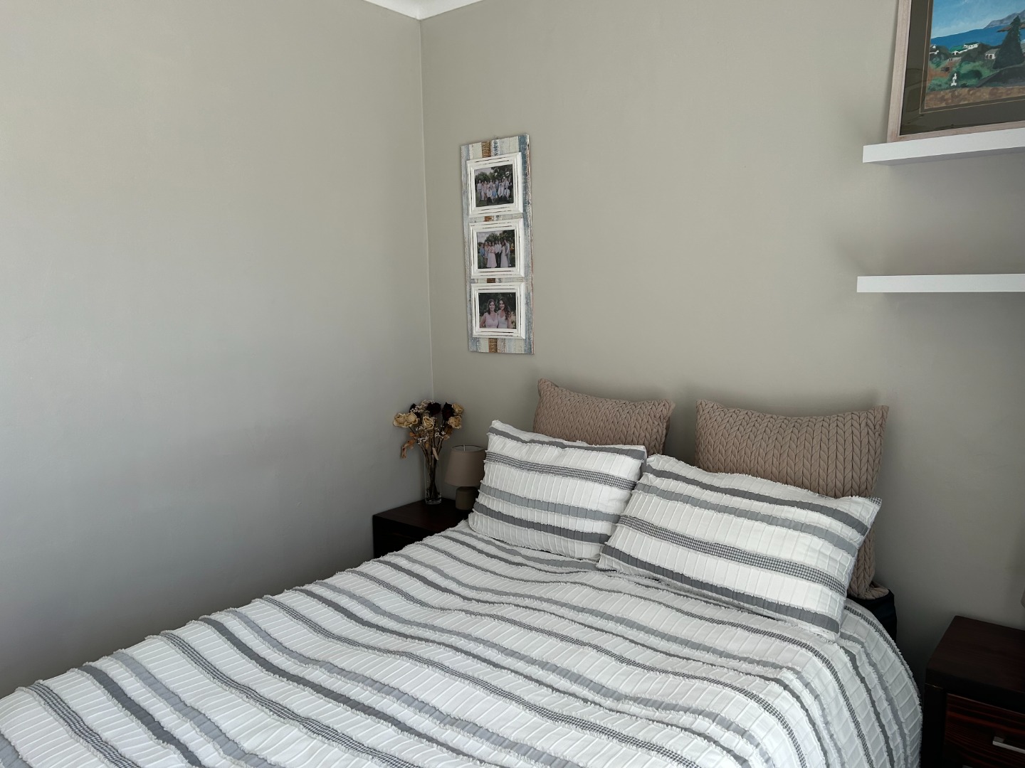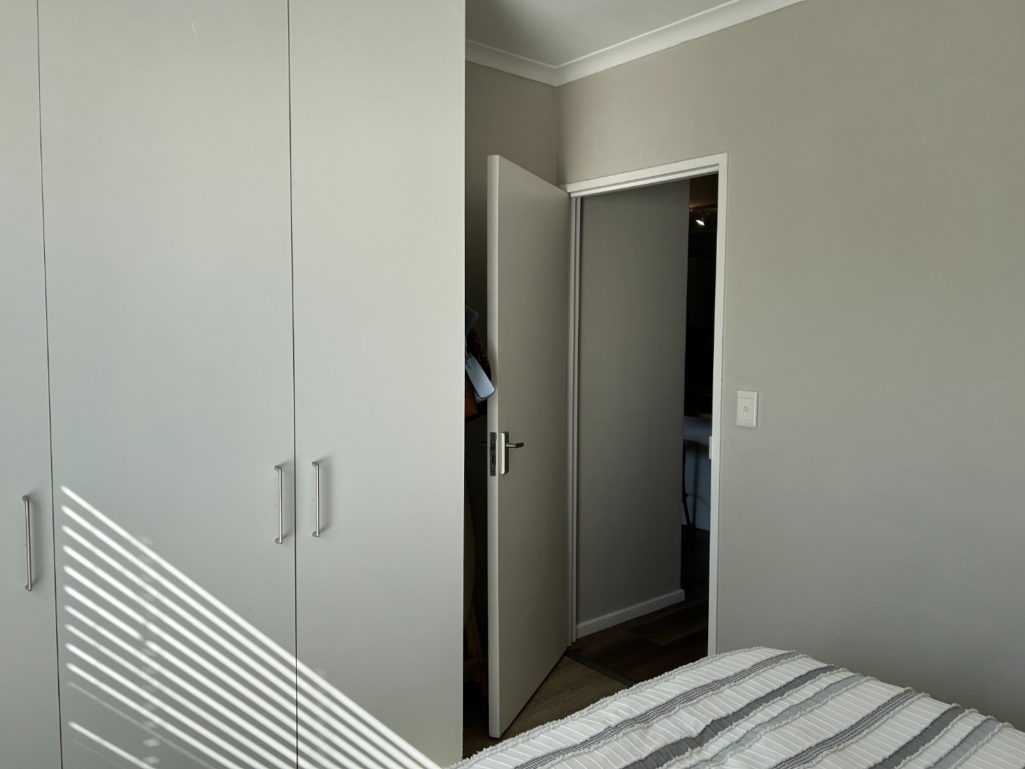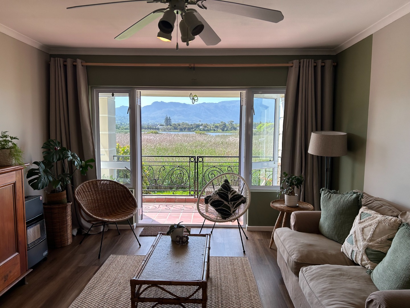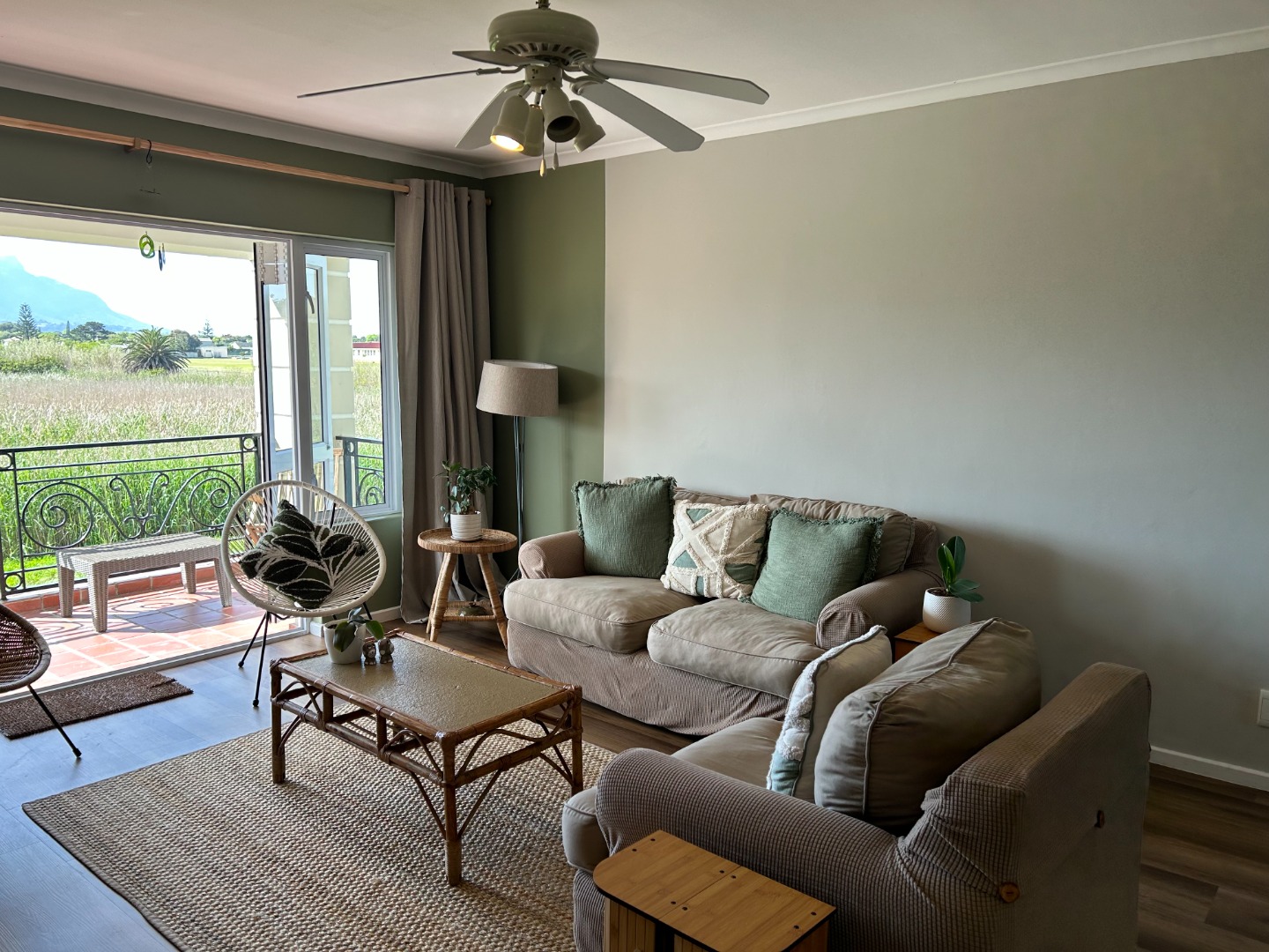 This distinguished residence, nestled within a secure, gated complex in Tokai, Cape Town, presents an inviting exterior with a white security gate and modern entrance. The interior immediately impresses with a bright, open-plan living area, featuring expansive windows and glass double doors that capture breathtaking panoramic views of mountains and natural landscapes. Modern vinyl flooring and a ceiling fans enhance comfort, with direct balcony access. The functional kitchen is meticulously appointed with light wood-look countertops, white cabinetry, and modern stainless steel appliances, including an integrated oven, stovetop, and double sink, plumbed for washing machine and dishwasher.