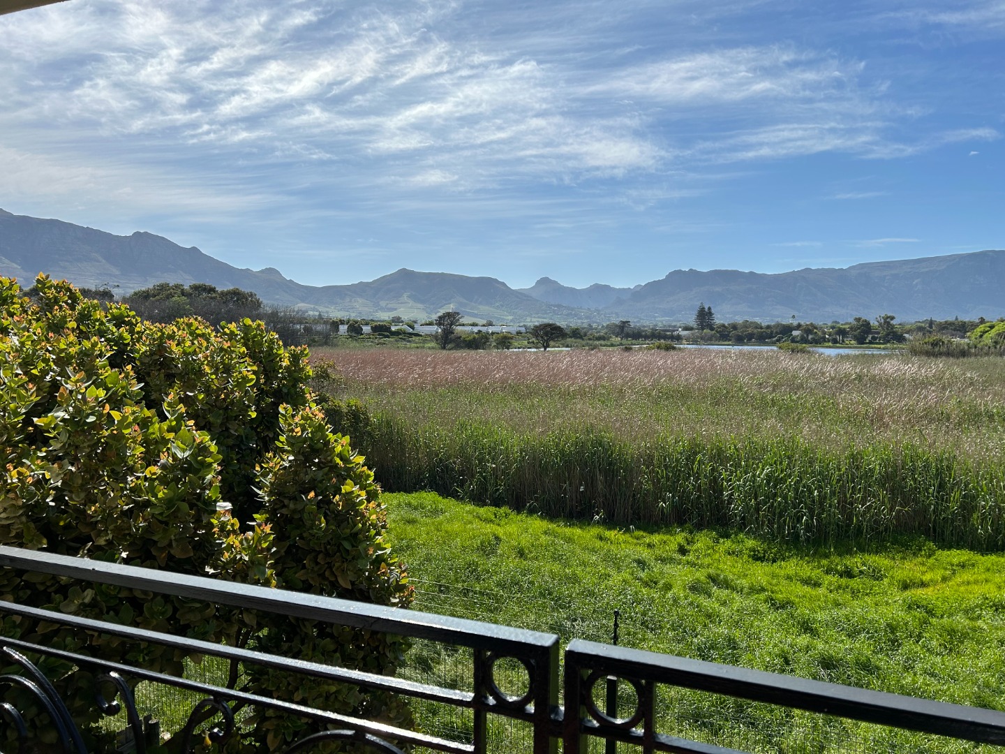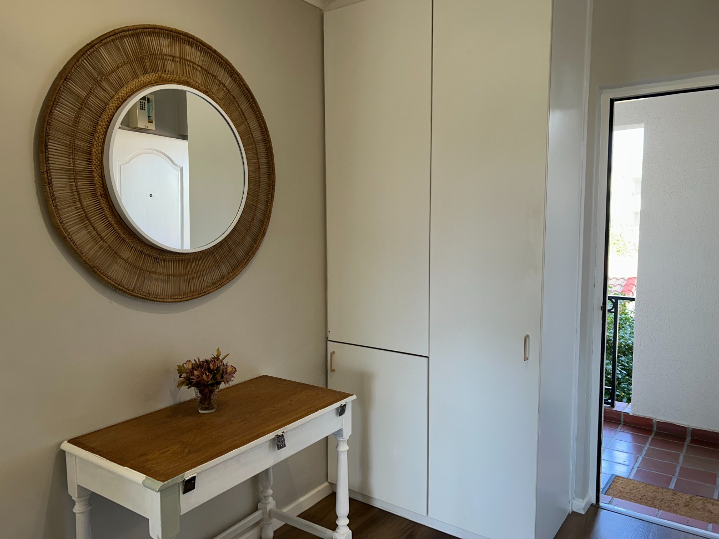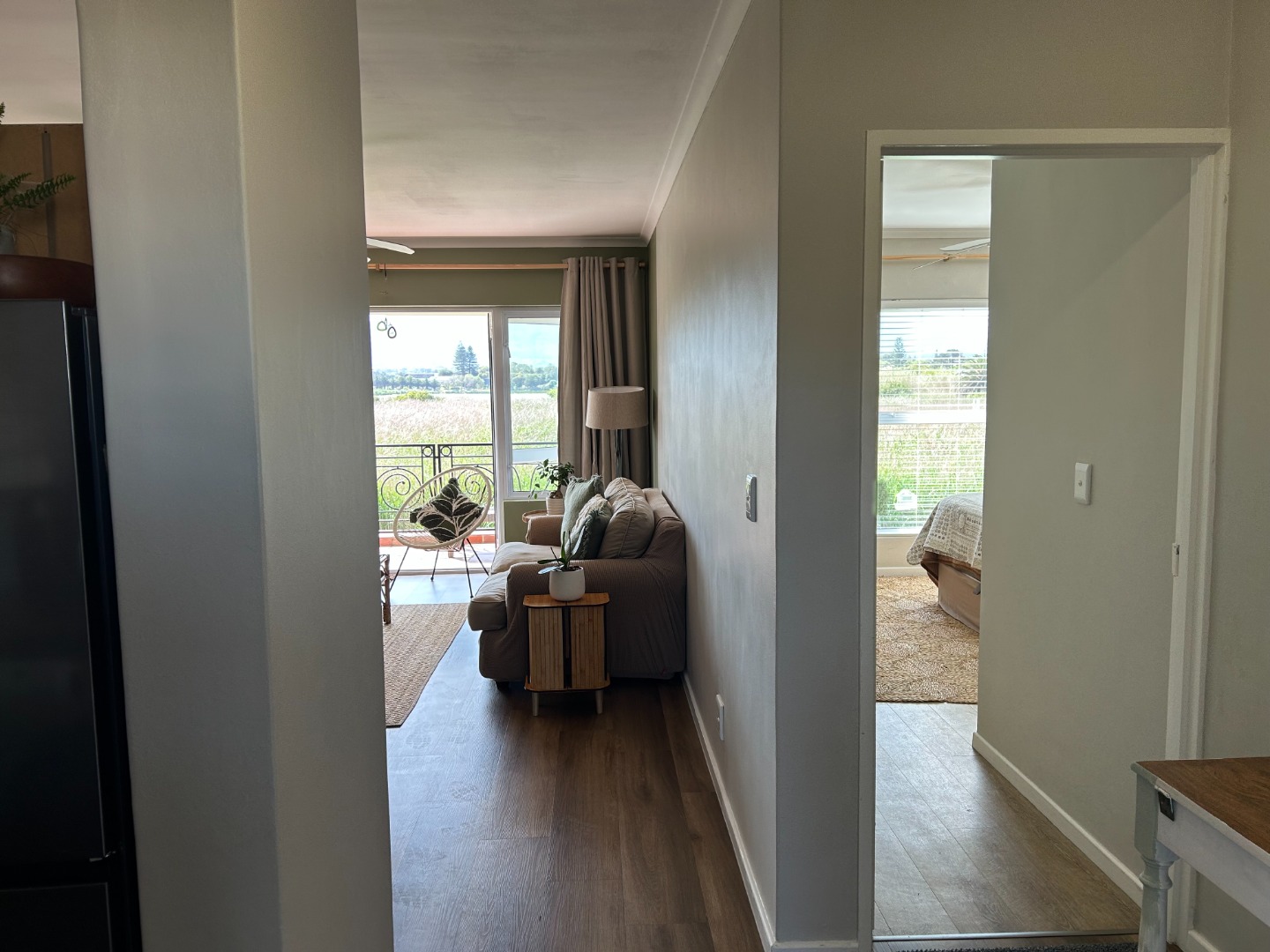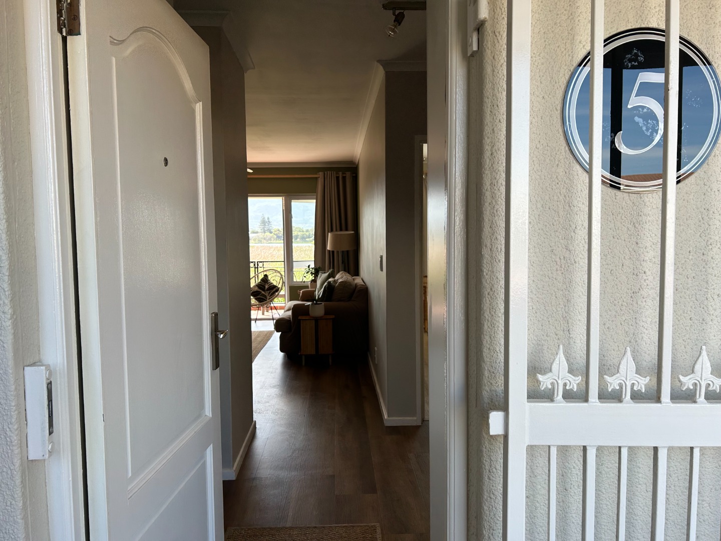 This distinguished residence, nestled within a secure, gated complex in Tokai, Cape Town, presents an inviting exterior with a white security gate and modern entrance. The interior immediately impresses with a bright, open-plan living area, featuring expansive windows and glass double doors that capture breathtaking panoramic views of mountains and natural landscapes. Modern vinyl flooring and a ceiling fans enhance comfort, with direct balcony access. The functional kitchen is meticulously appointed with light wood-look countertops, white cabinetry, and modern stainless steel appliances, including an integrated oven, stovetop, and double sink, plumbed for washing machine and dishwasher.