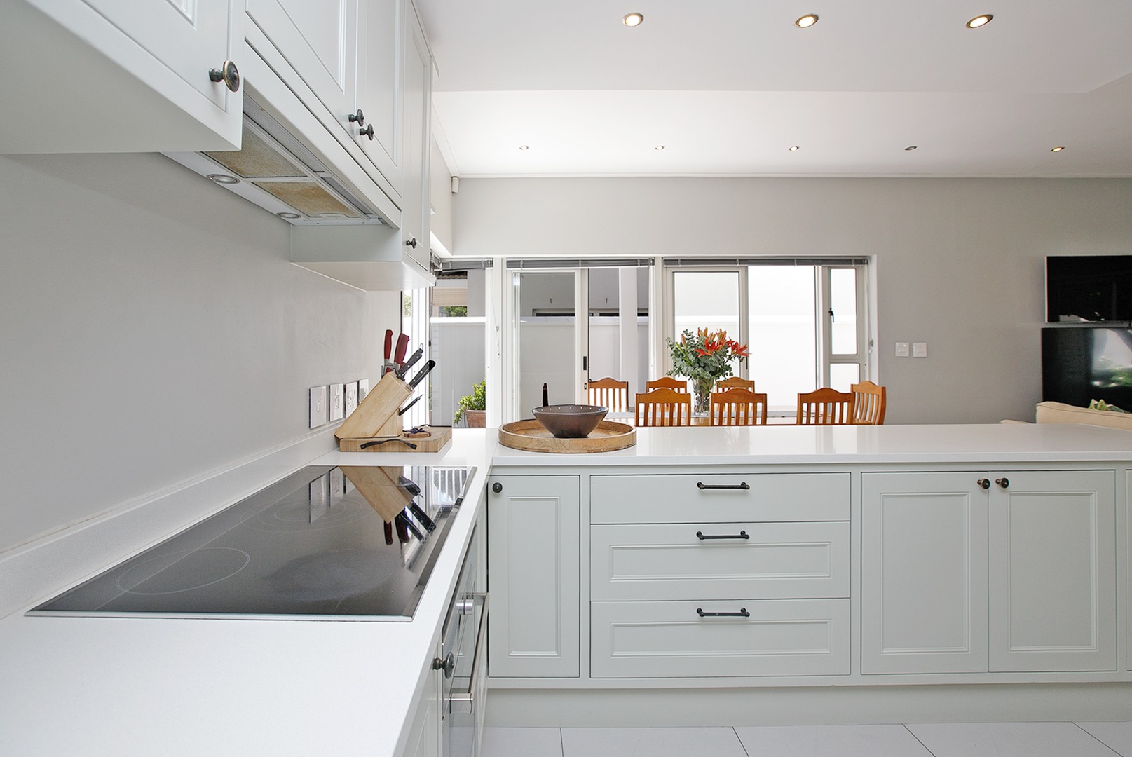Upon entry, the open-plan interior seamlessly integrates the lounge, dining area, and a contemporary kitchen. Abundant natural light floods these spaces through expansive glass doors, enhancing the neutral colour palette and creating an airy ambiance. The modern kitchen features light cabinetry, pristine white countertops, an integrated hob, and a breakfast bar, ideal for both casual and formal entertaining. A stylish wood-burning fireplace adds warmth and character to the living area.